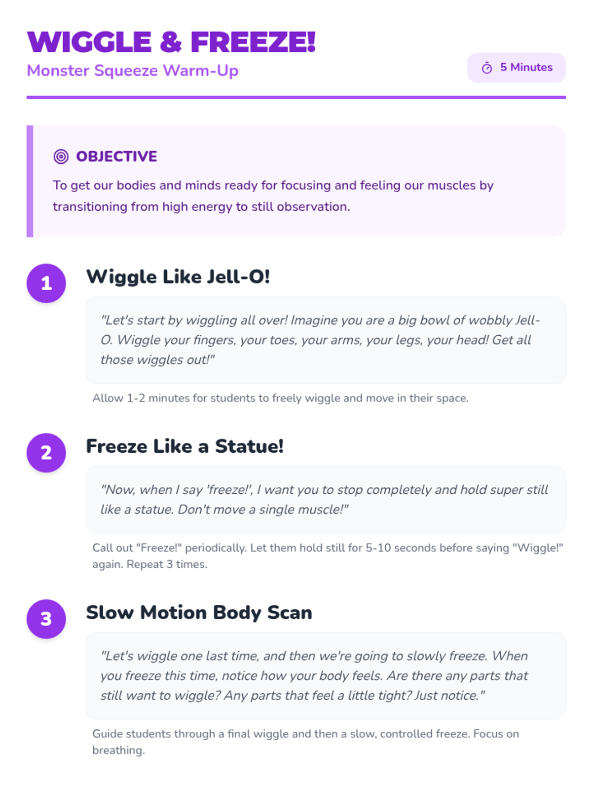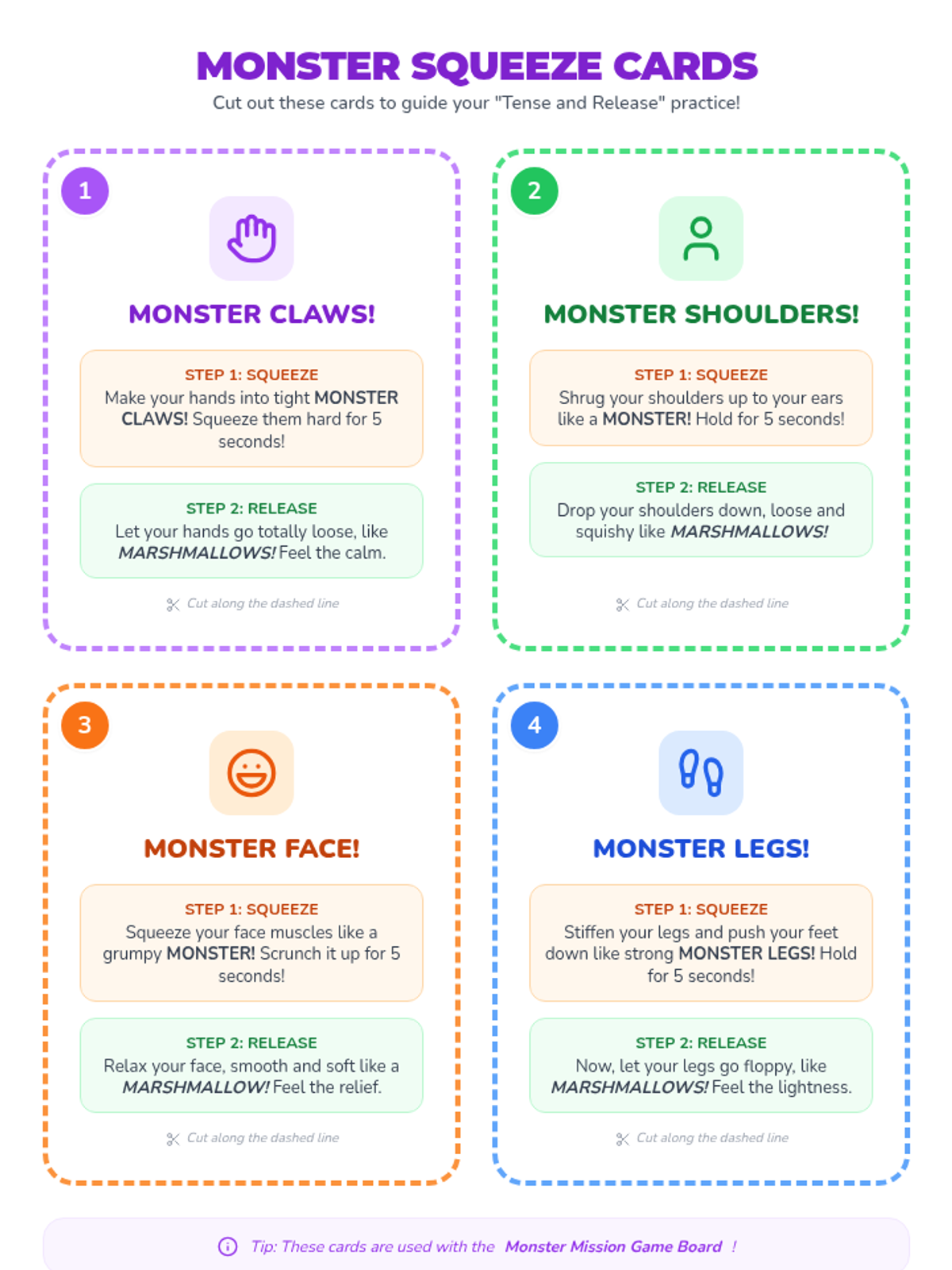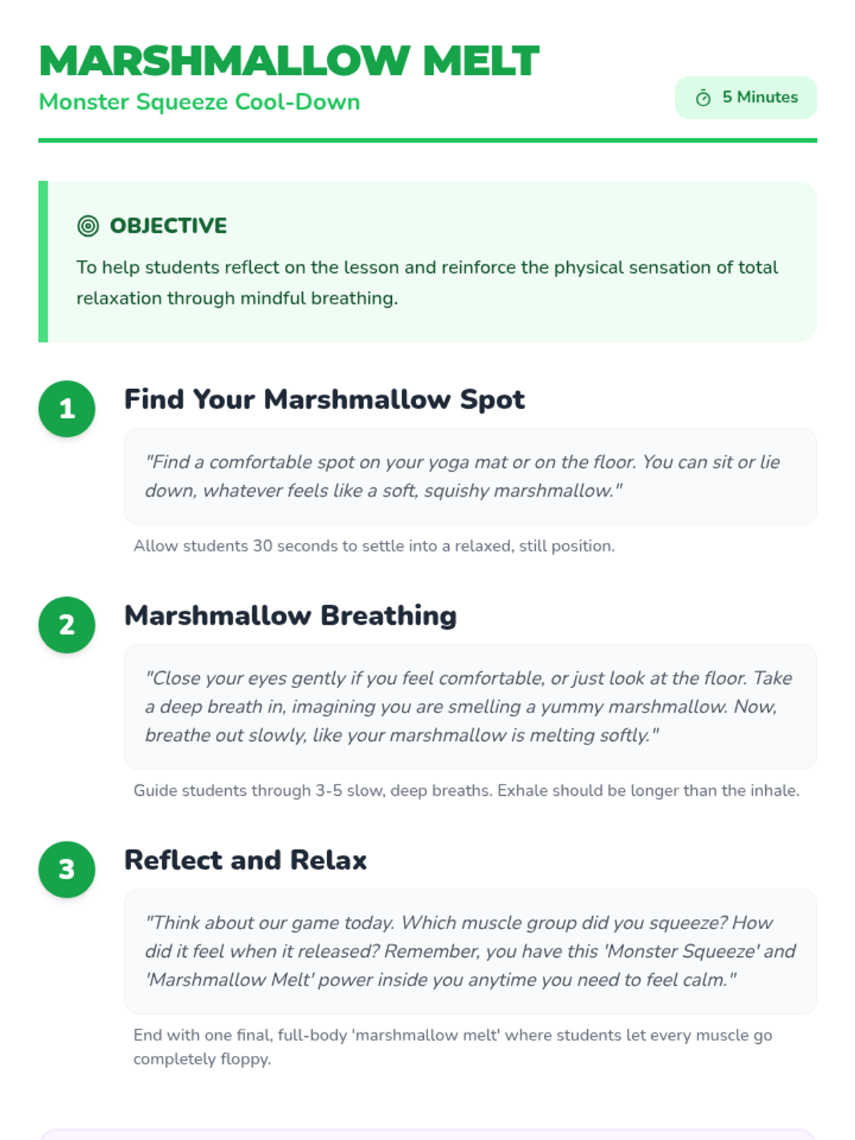 A 30-minute lesson for 2nd-grade students to learn progressive muscle relaxation using the 'tense and release' technique through a playful monster-themed game.
