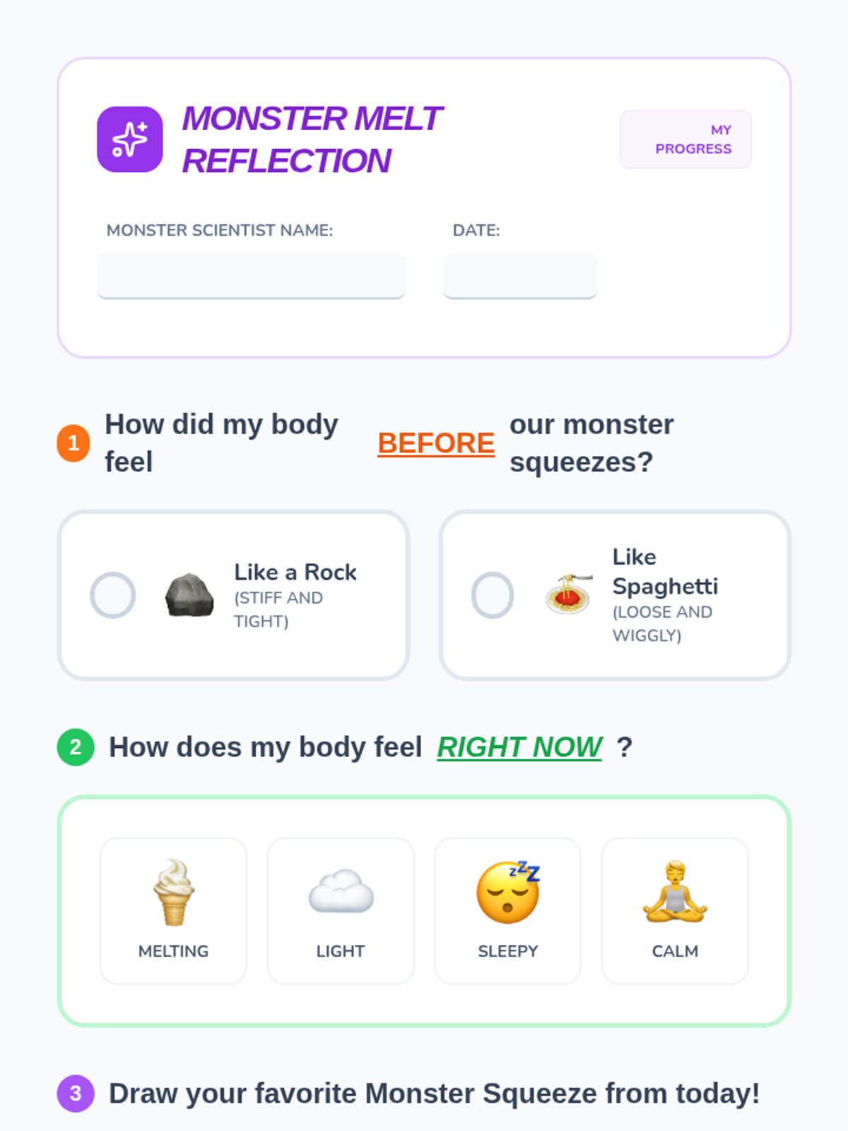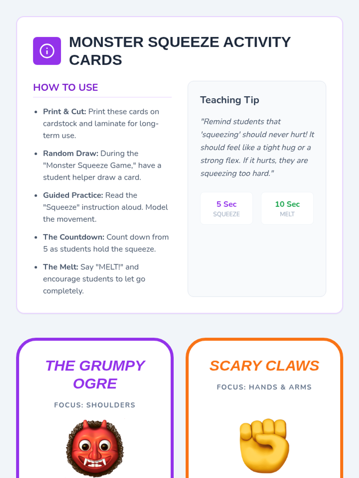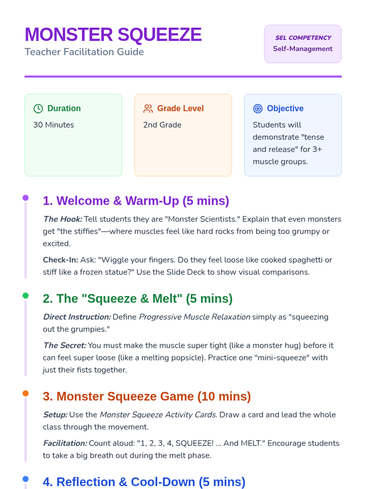 A 30-minute SEL lesson for 2nd graders teaching Progressive Muscle Relaxation through a 'Monster Squeeze' theme, helping students identify and release physical tension.