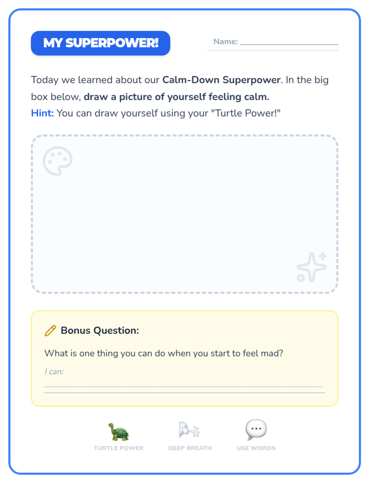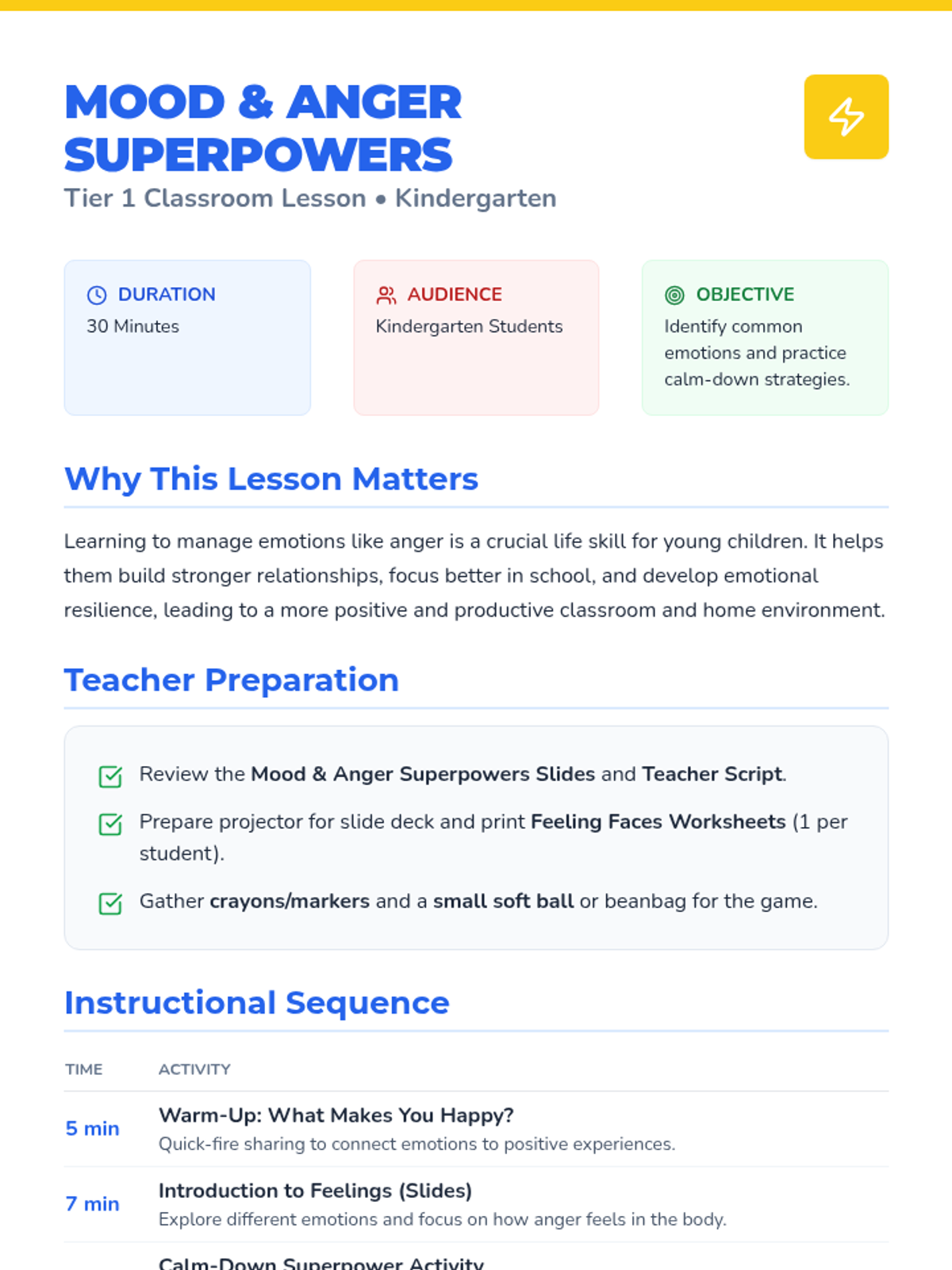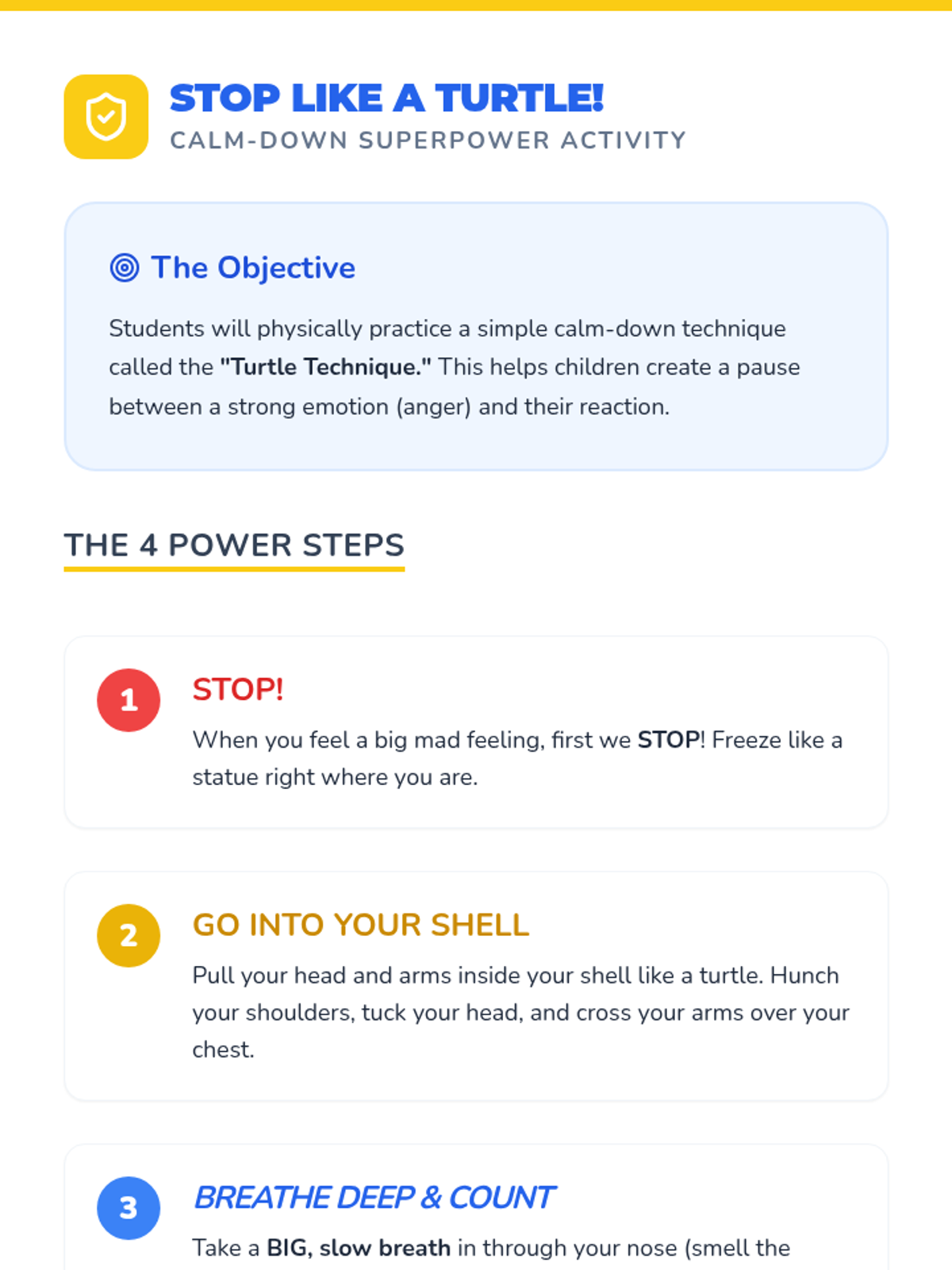 A 30-minute Kindergarten lesson helping students identify and manage anger through the 'Stop Like a Turtle' technique and healthy expression strategies.
