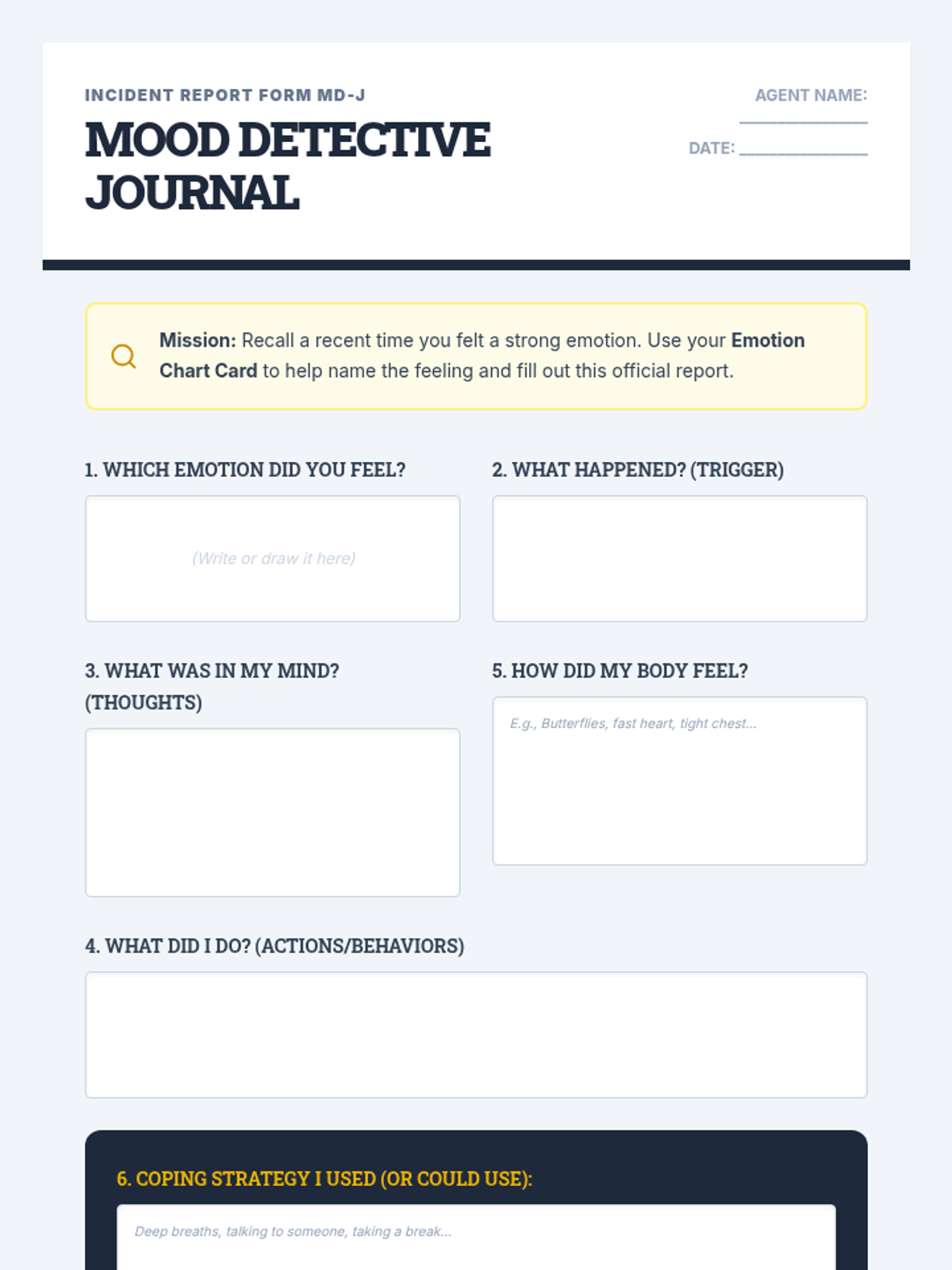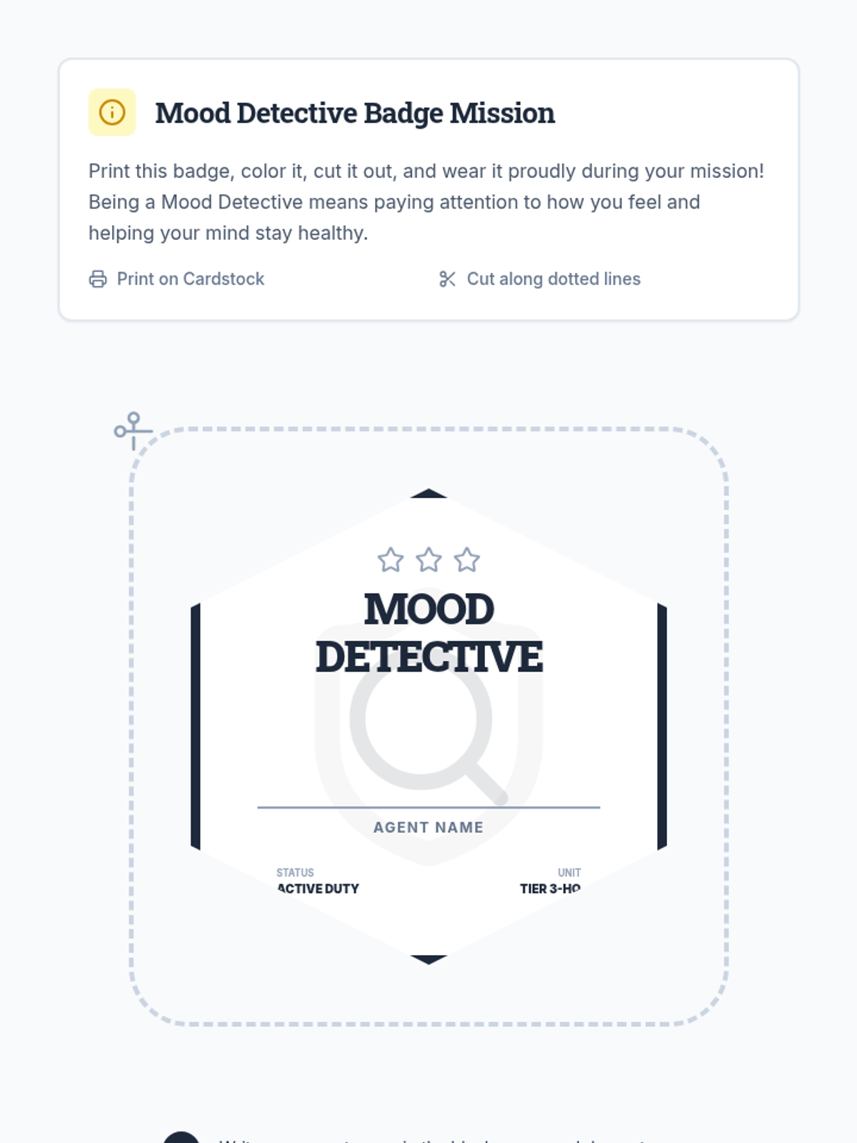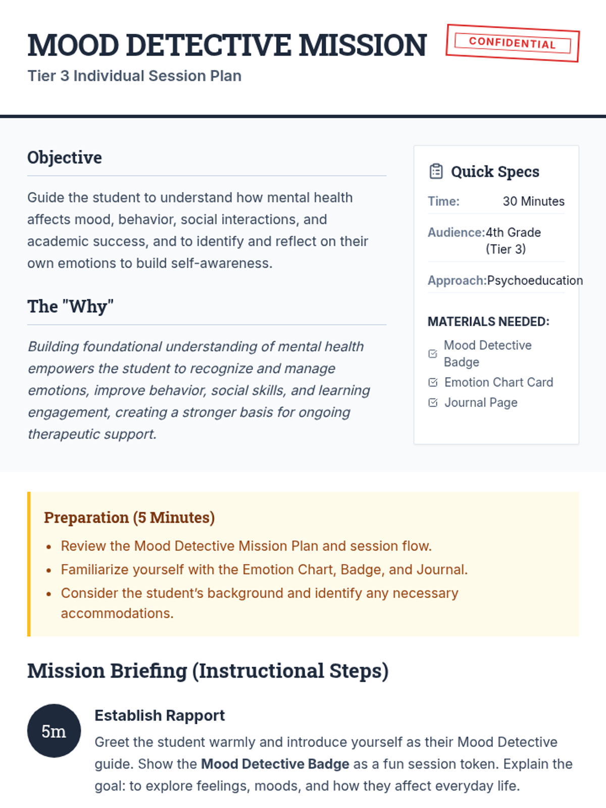 A 30-minute individual Tier 3 psychoeducation session for 4th-grade students to explore how mental health influences mood, behavior, and success through a detective-themed mission.