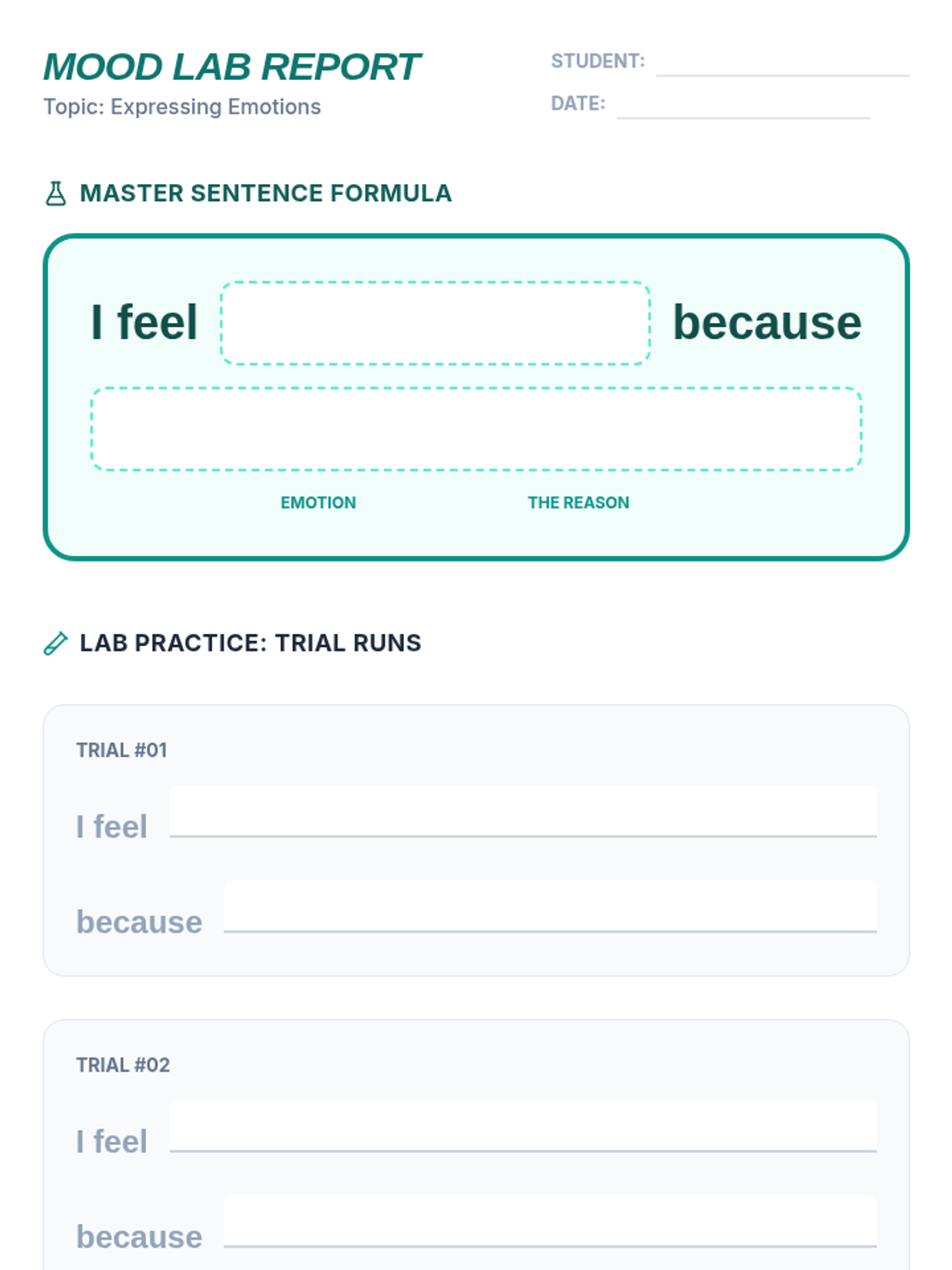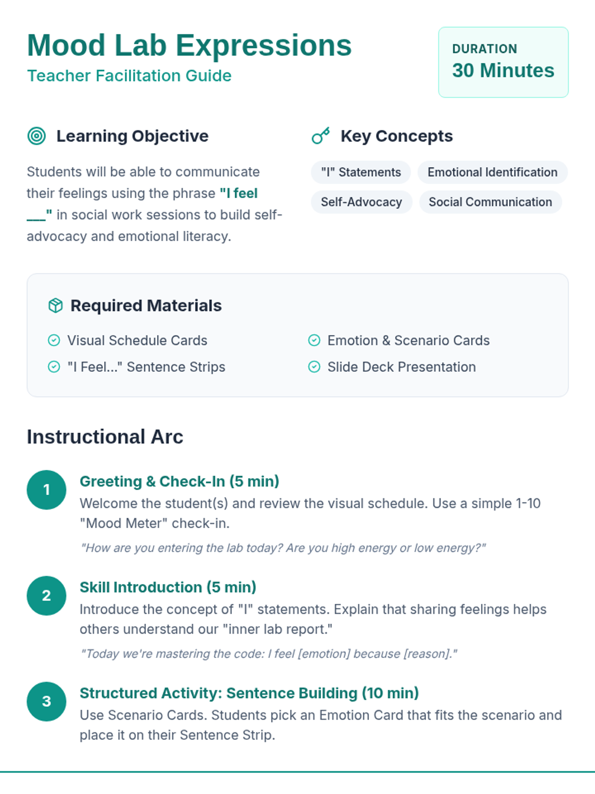 A 30-minute social work lesson designed for 7th graders to master self-expression through "I" statements and emotional identification. Students practice building and sharing "I feel" sentences using visual aids and scenario cards.