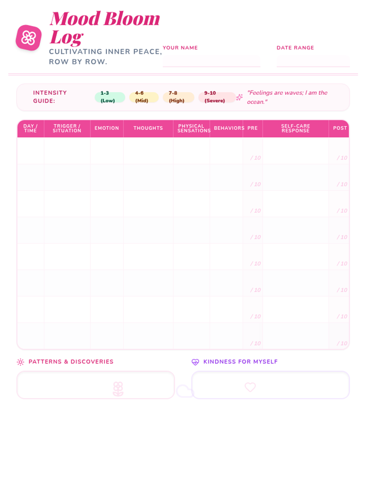 A collection of stylish emotion tracking logs designed for daily mental health check-ins. Features two distinct aesthetic directions: soft pastel and vibrant Y2K retro-tech.