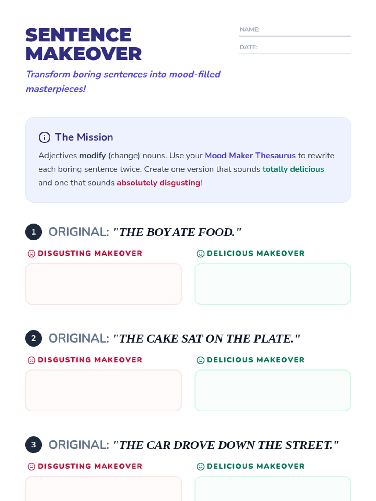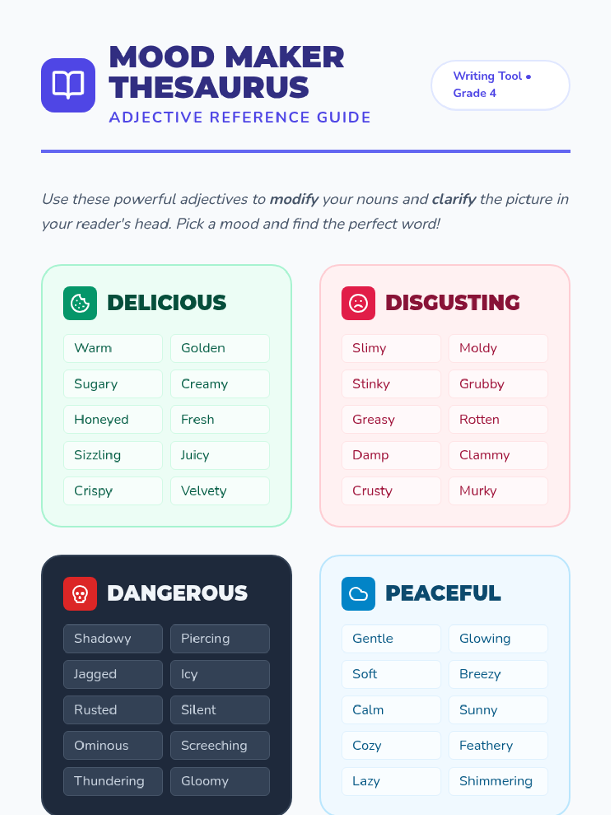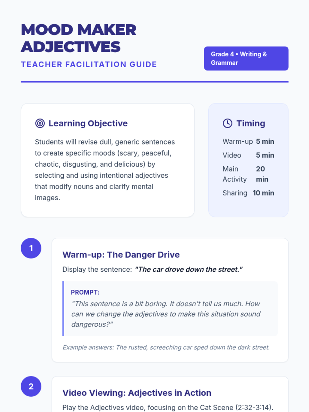 Students will learn how to use intentional adjectives to transform dull sentences into mood-filled descriptions. This lesson uses a visual video guide to demonstrate how adjectives modify nouns and includes a hands-on 'makeover' activity to practice creating contrasting moods.