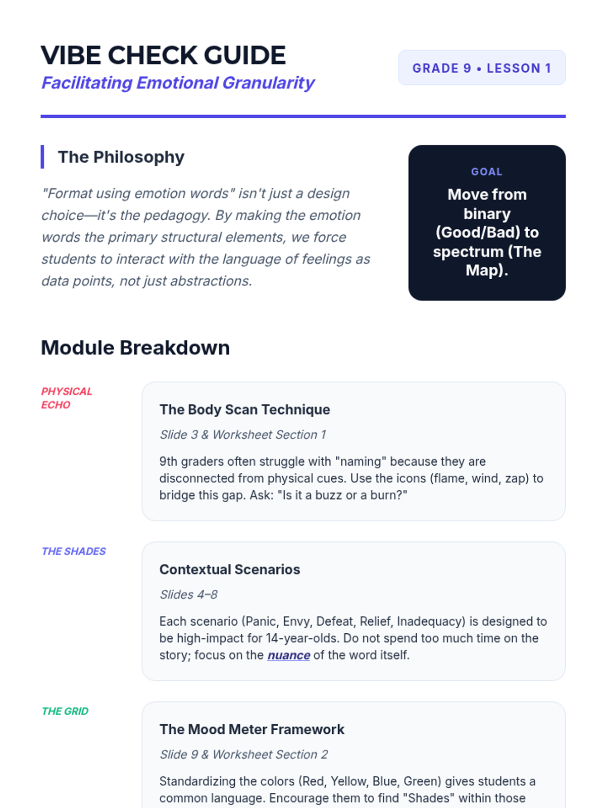 A lesson designed for 9th graders to move beyond basic emotional vocabulary, focusing on identifying nuanced feelings throughout their daily lives and recognizing physical cues.