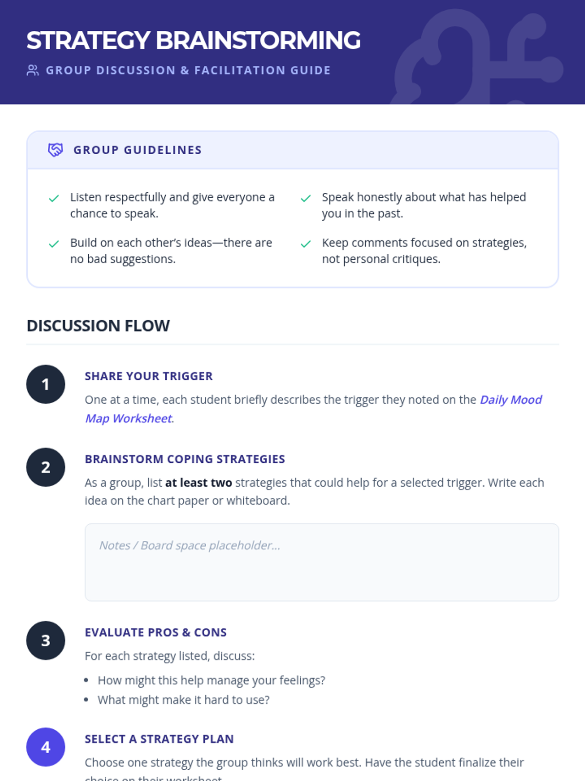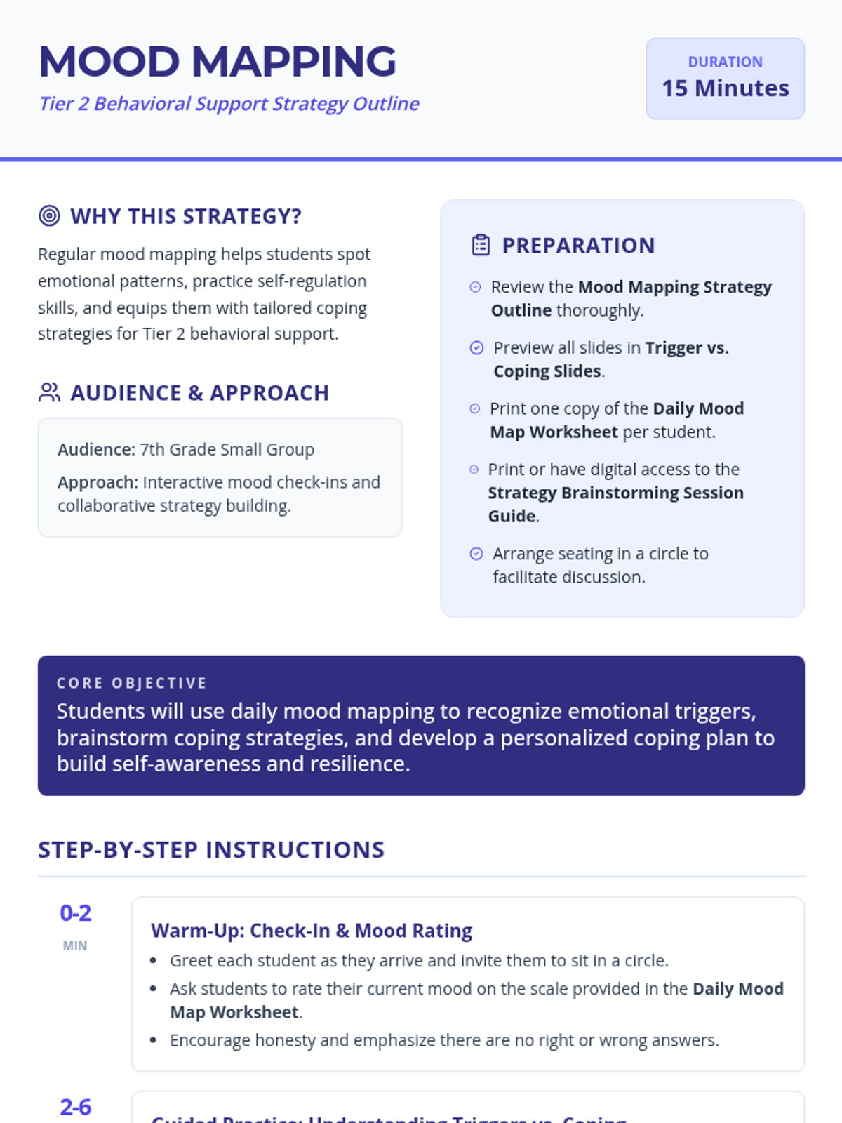 A 15-minute Tier 2 behavioral support session for 7th graders focused on identifying emotional triggers and developing personalized coping strategies through mood mapping.