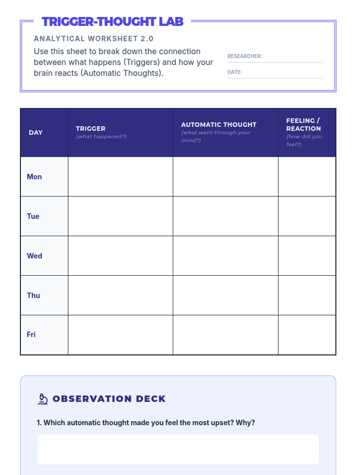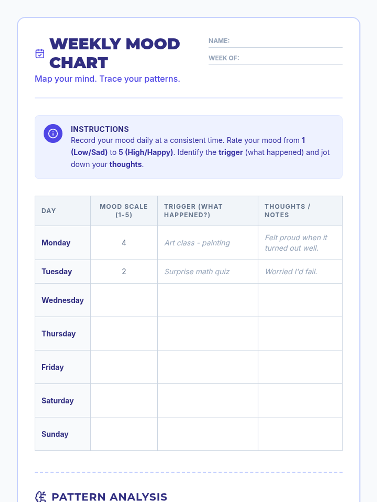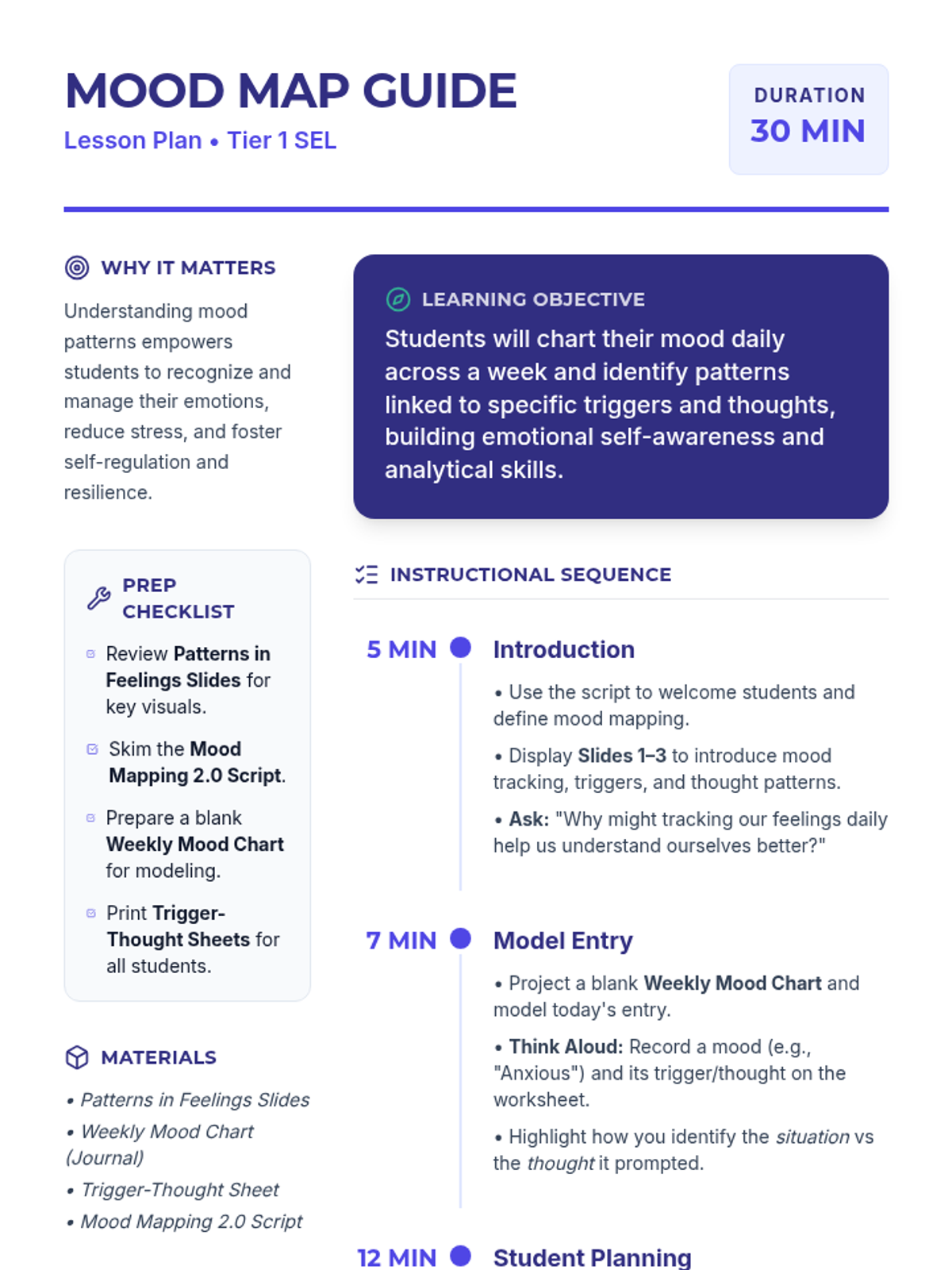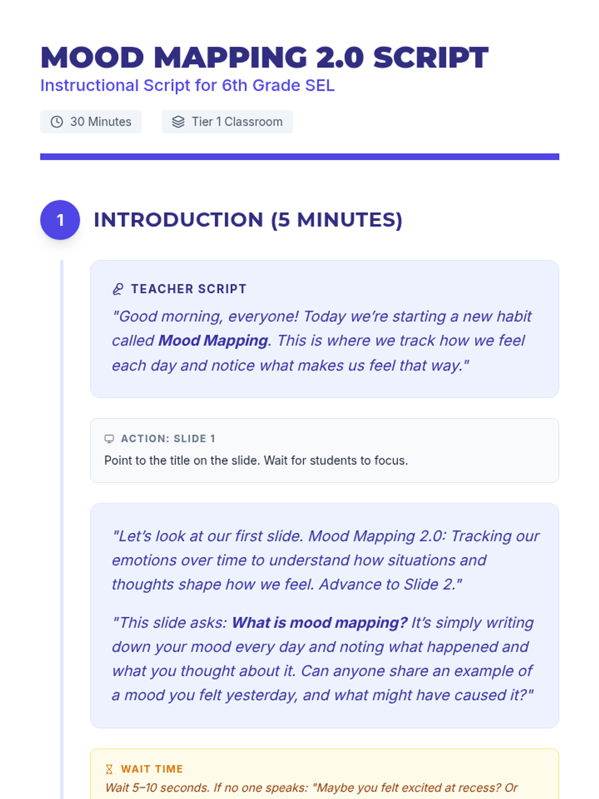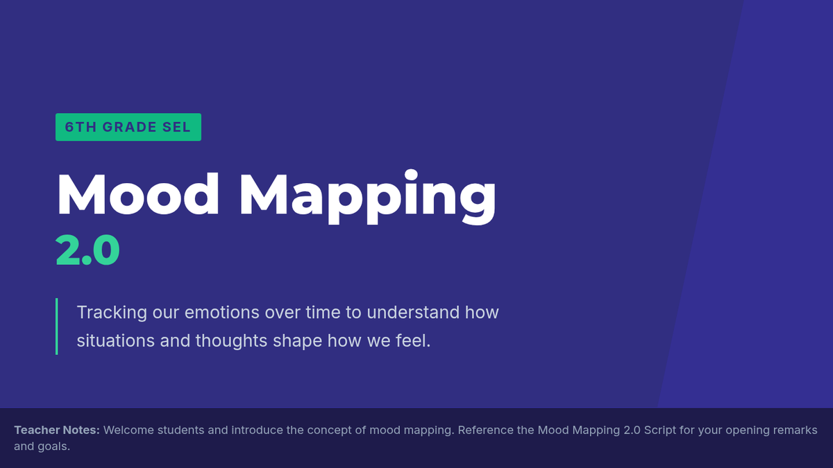 A 30-minute 6th grade lesson on emotional self-awareness where students learn to track daily moods, identify situational triggers, and analyze the thought patterns that shape their feelings.