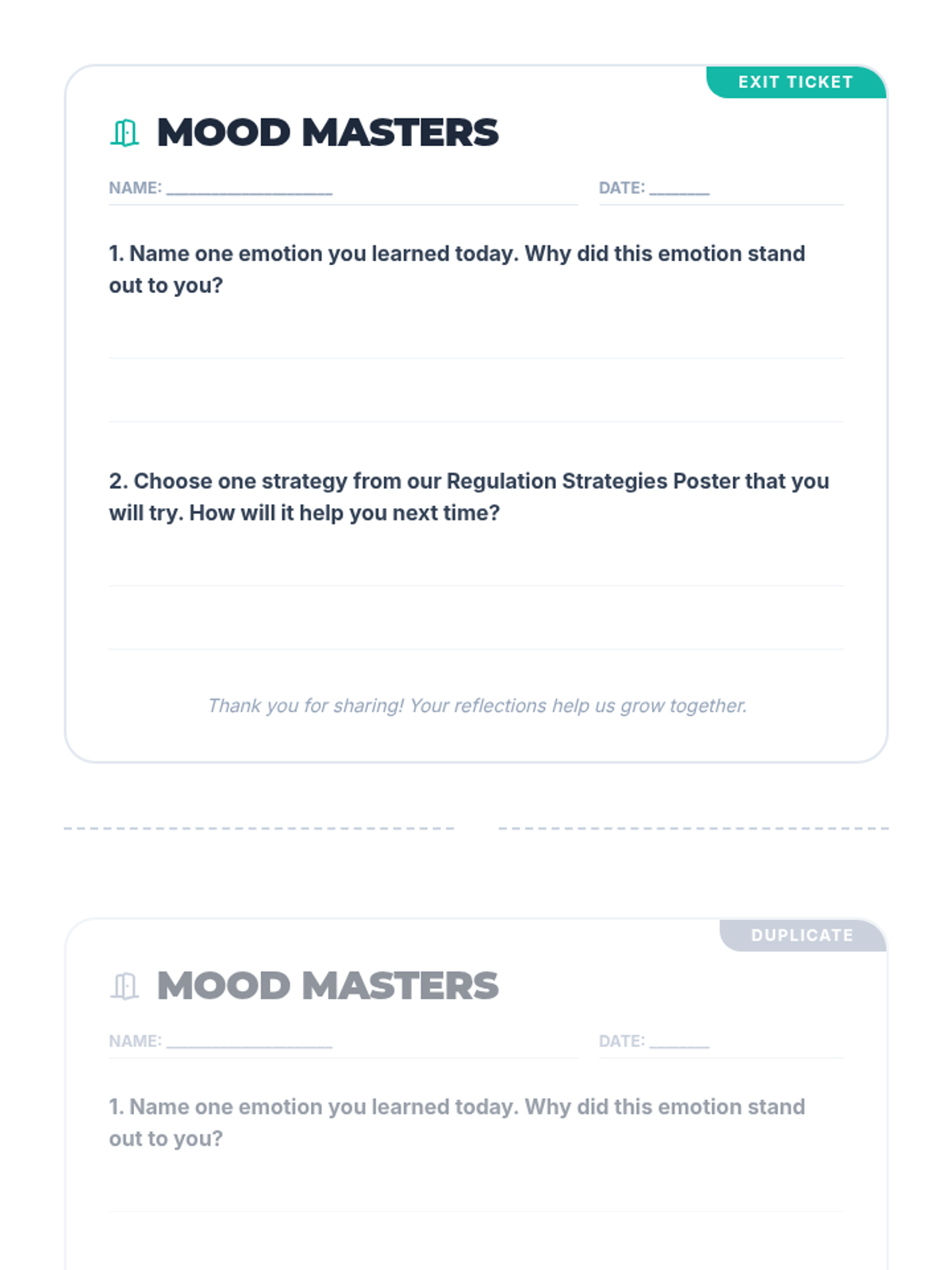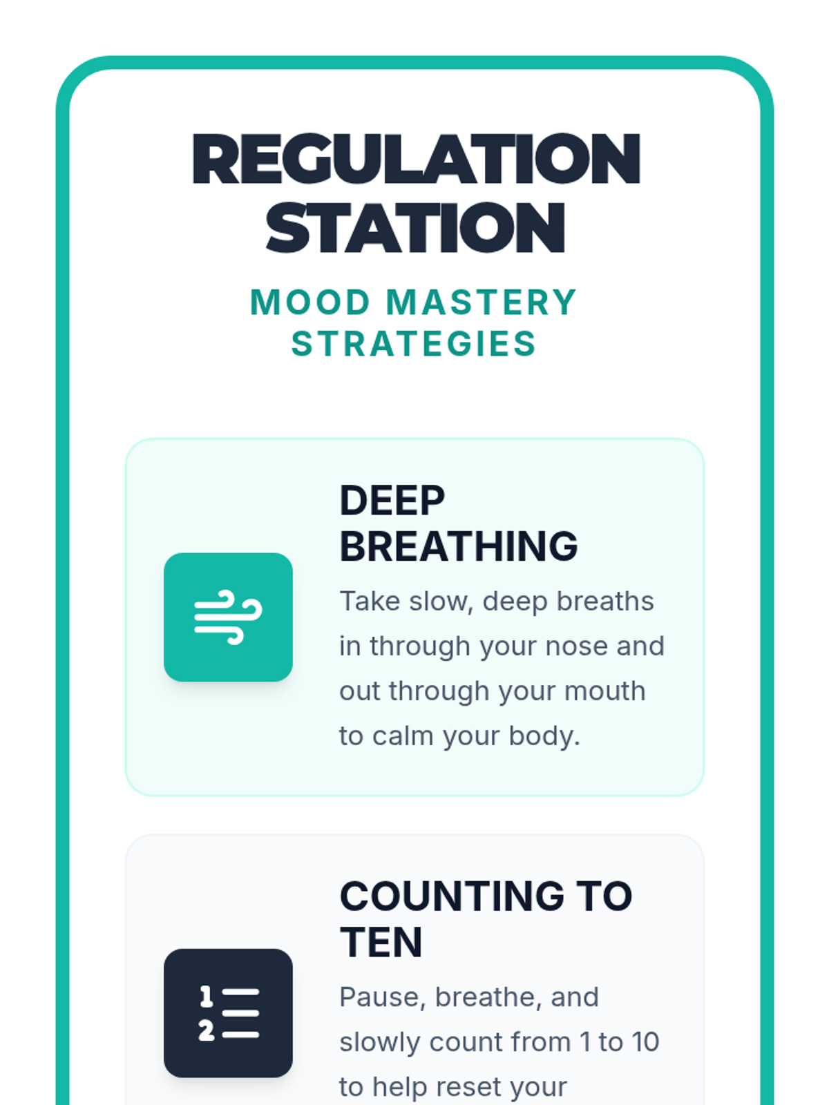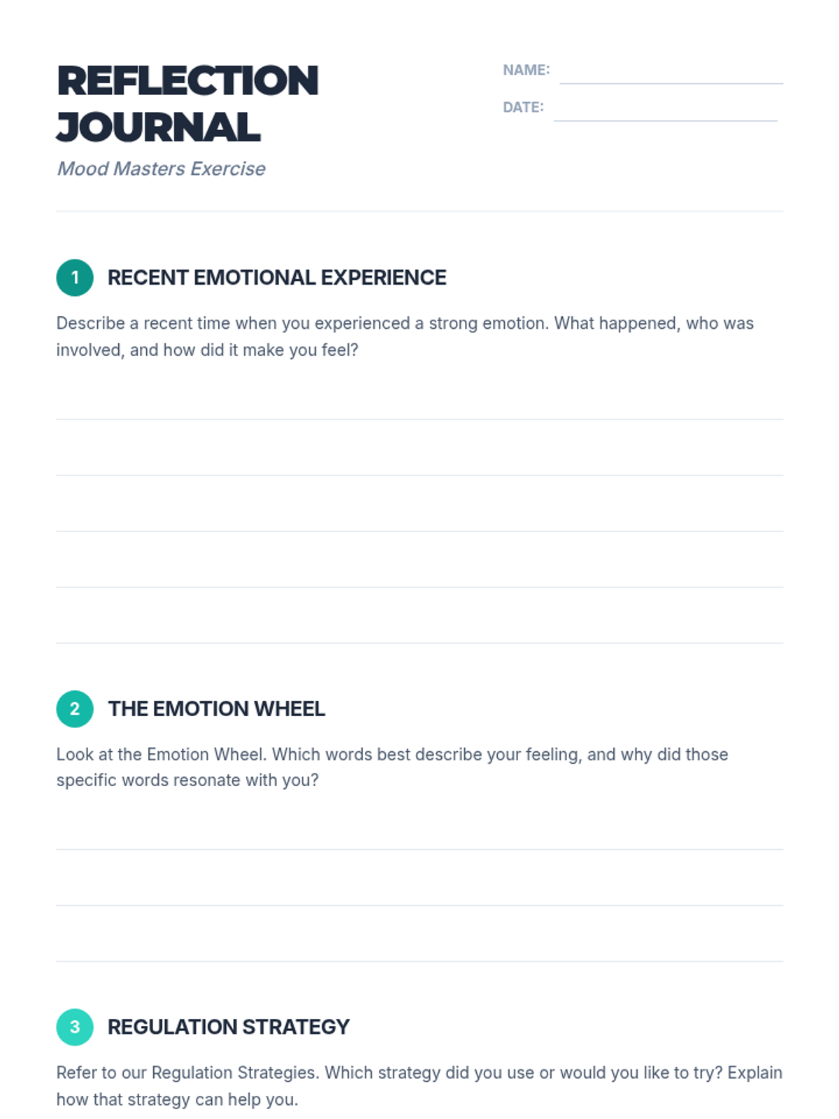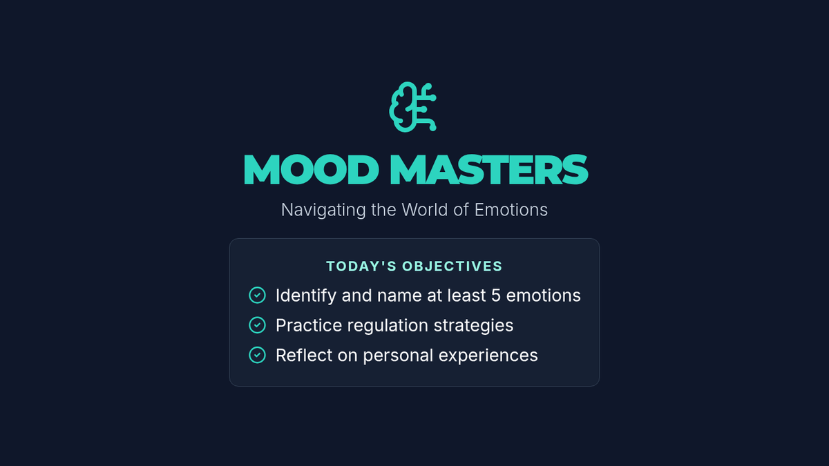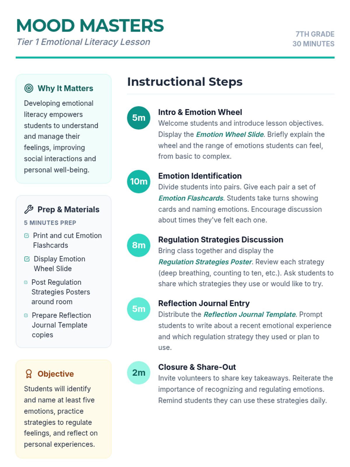 An interactive 30-minute Tier 1 lesson for 7th graders to identify emotions, learn regulation strategies, and practice reflection to build emotional literacy.