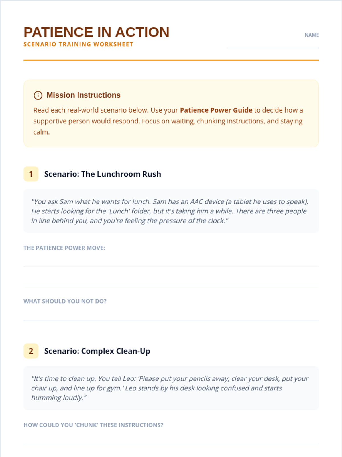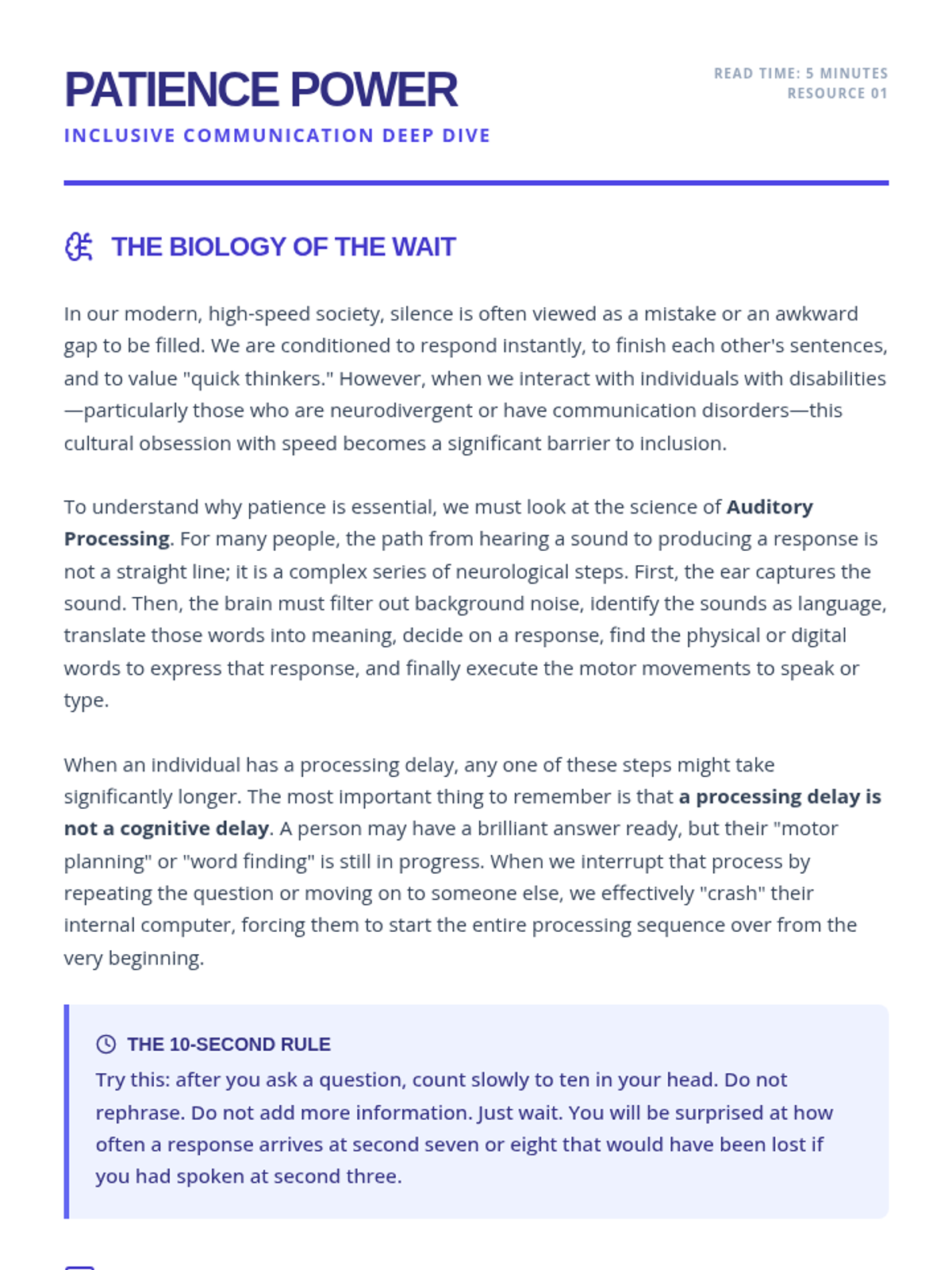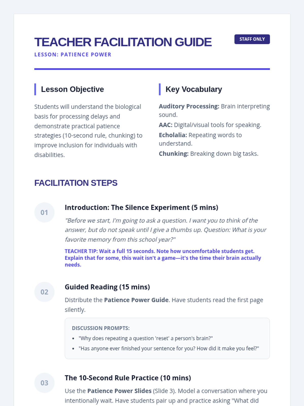 A lesson focused on developing patience and effective communication strategies when interacting with and supporting individuals with disabilities, covering processing time, clear instructions, and calm responses to unexpected behaviors.