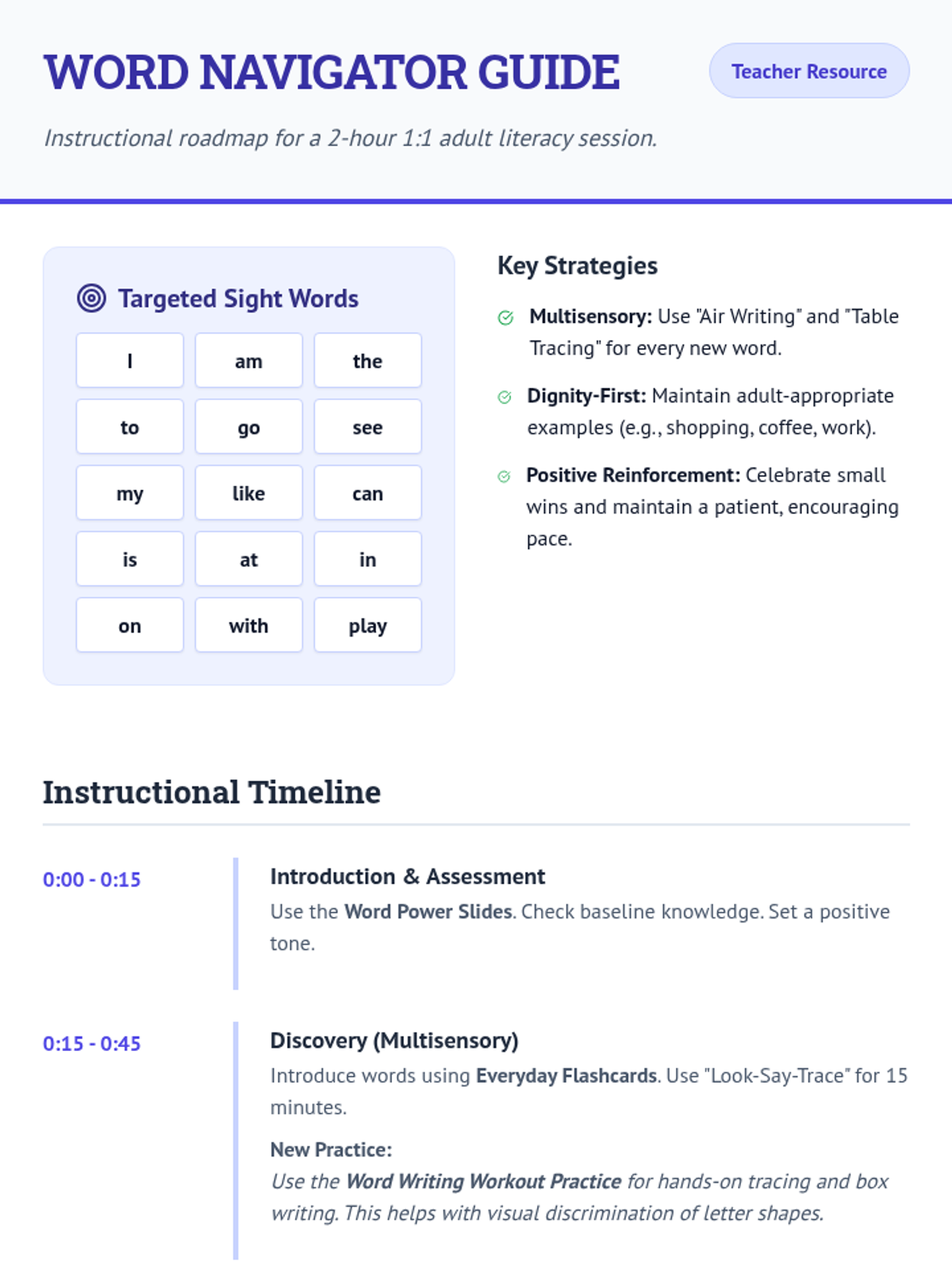 A comprehensive 2-hour one-on-one lesson designed for adult learners with disabilities, focusing on 15 high-frequency functional sight words through multisensory and interactive activities.