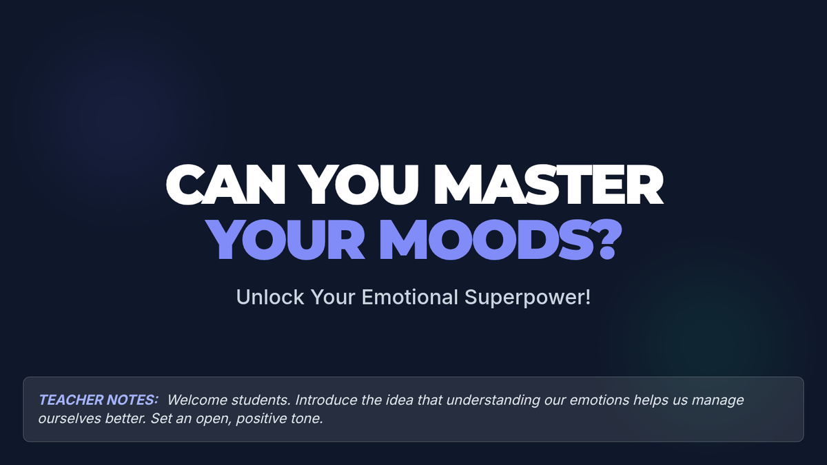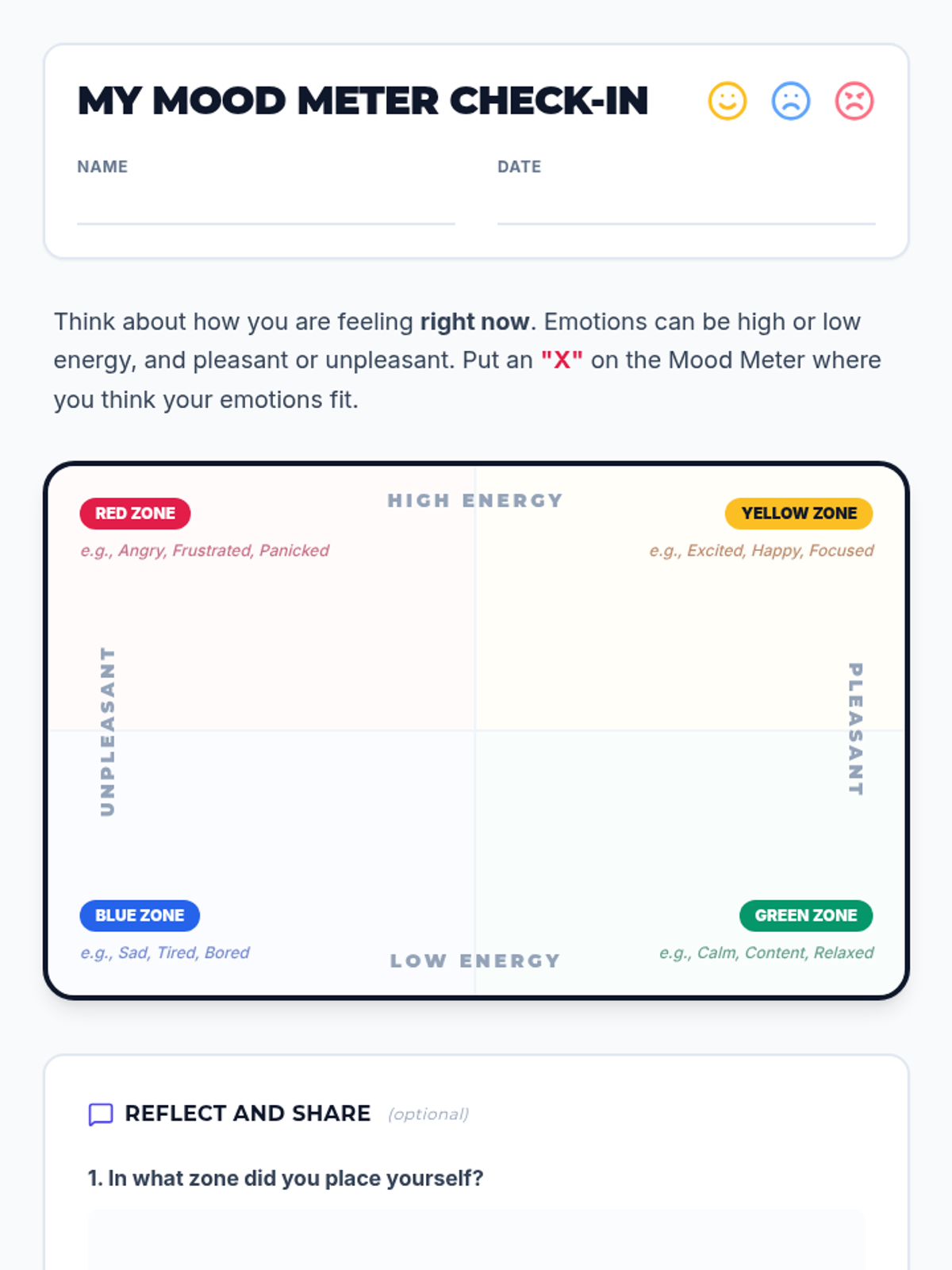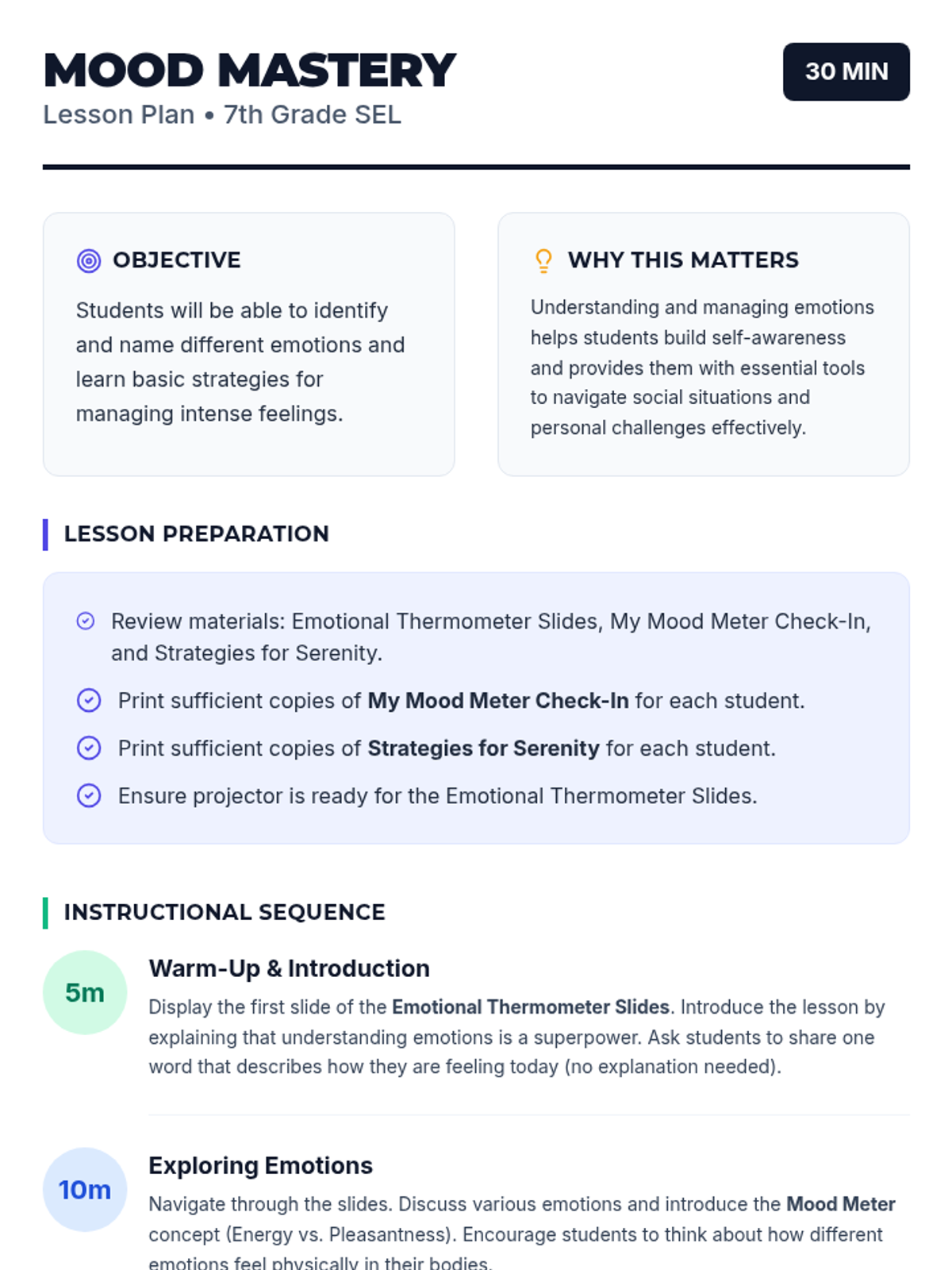 This resource helps students identify and understand their emotions, providing practical strategies for emotional regulation. It's crucial for developing self-awareness, a foundational aspect of self-management, helping students navigate daily challenges with greater control. This lesson is for 7th Grade Class and will last 30 minutes across one session.