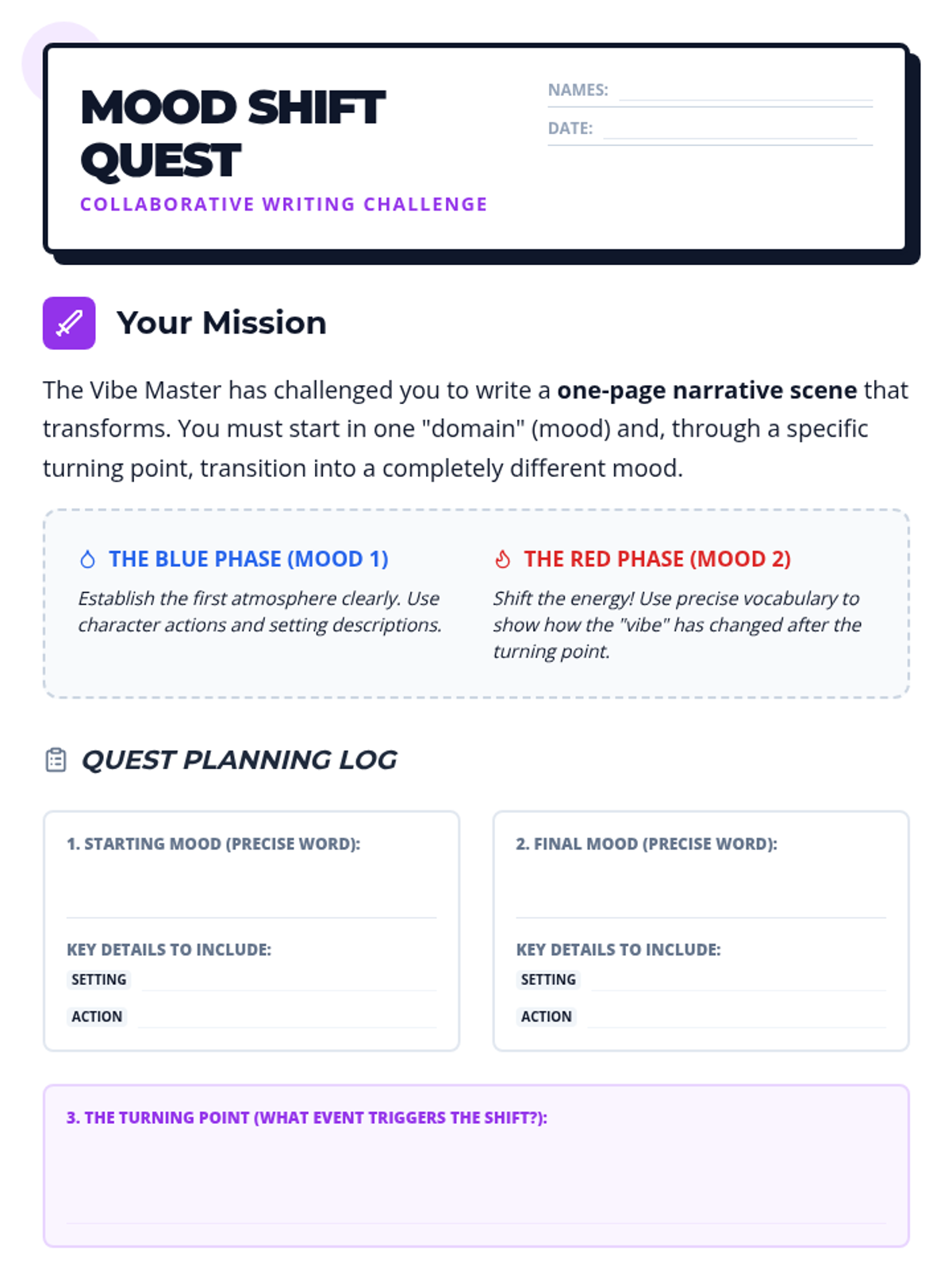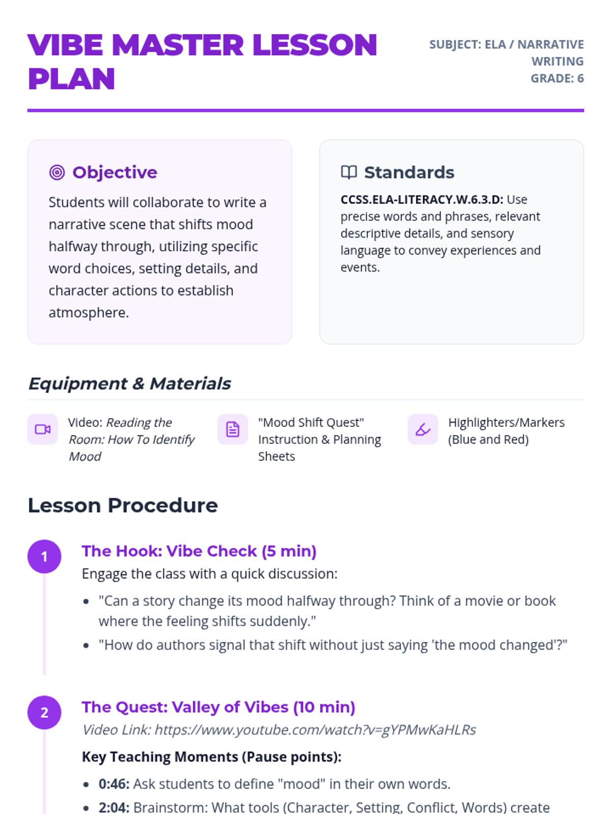 Students will learn to identify and craft literary mood using tools like characterization, setting, and word choice. The lesson culminates in a collaborative writing activity where student pairs create a narrative that undergoes a distinct mood shift.