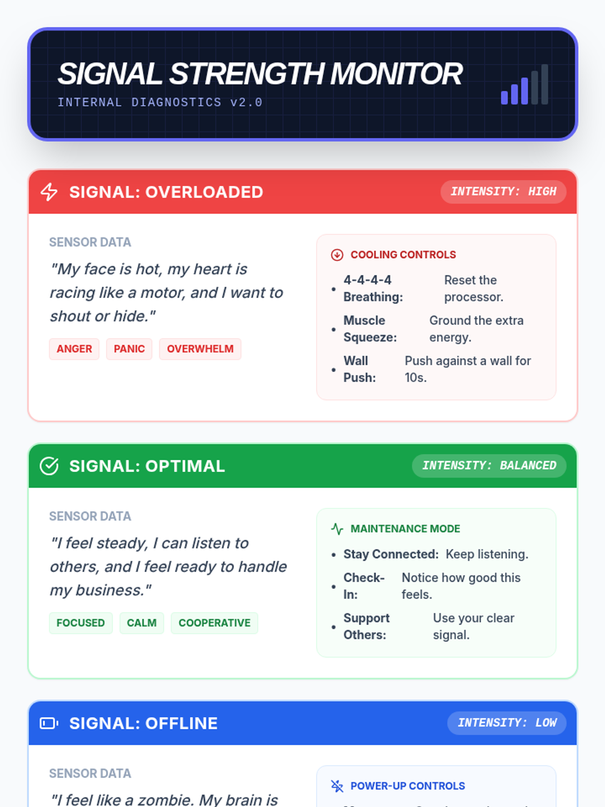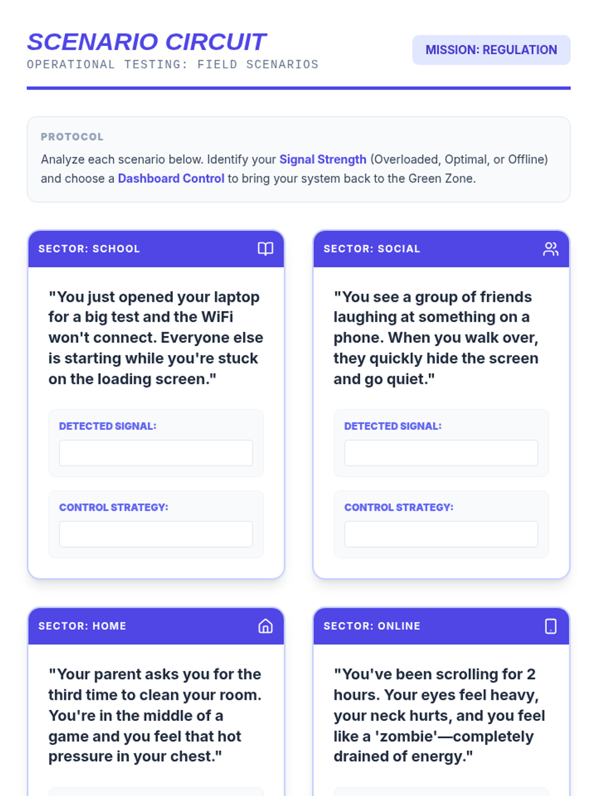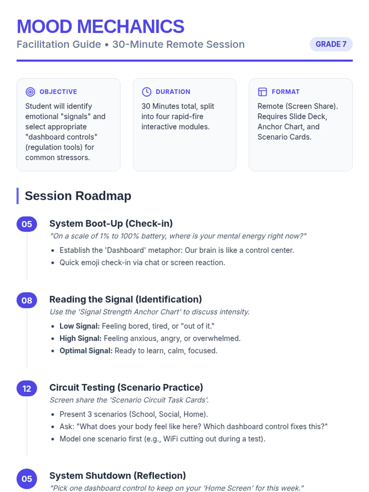 A 30-minute remote social work lesson designed for a 7th grader to understand and practice emotional regulation through a digital 'dashboard' metaphor.