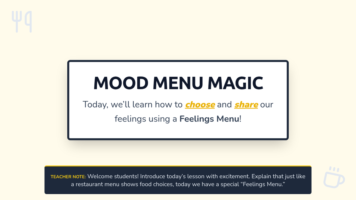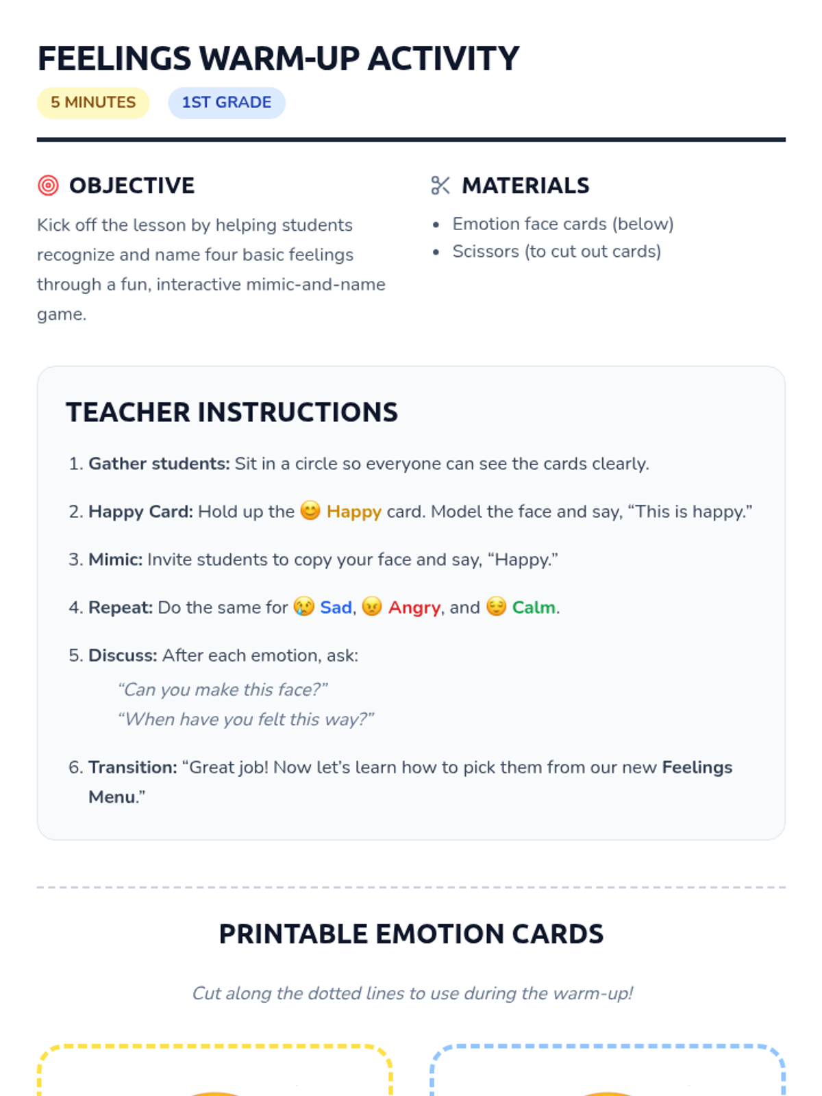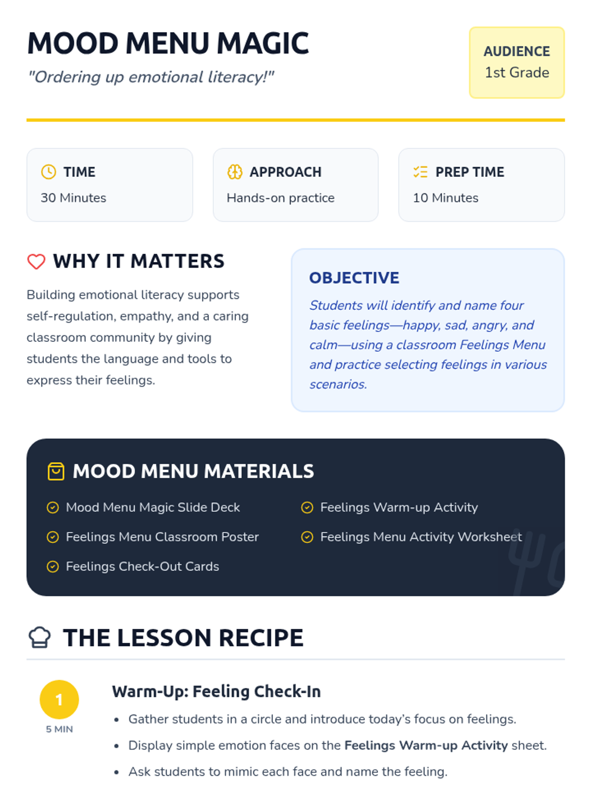 A 30-minute Tier 1 lesson for 1st graders to build emotional literacy using a 'Feelings Menu' concept to identify and express four basic emotions.