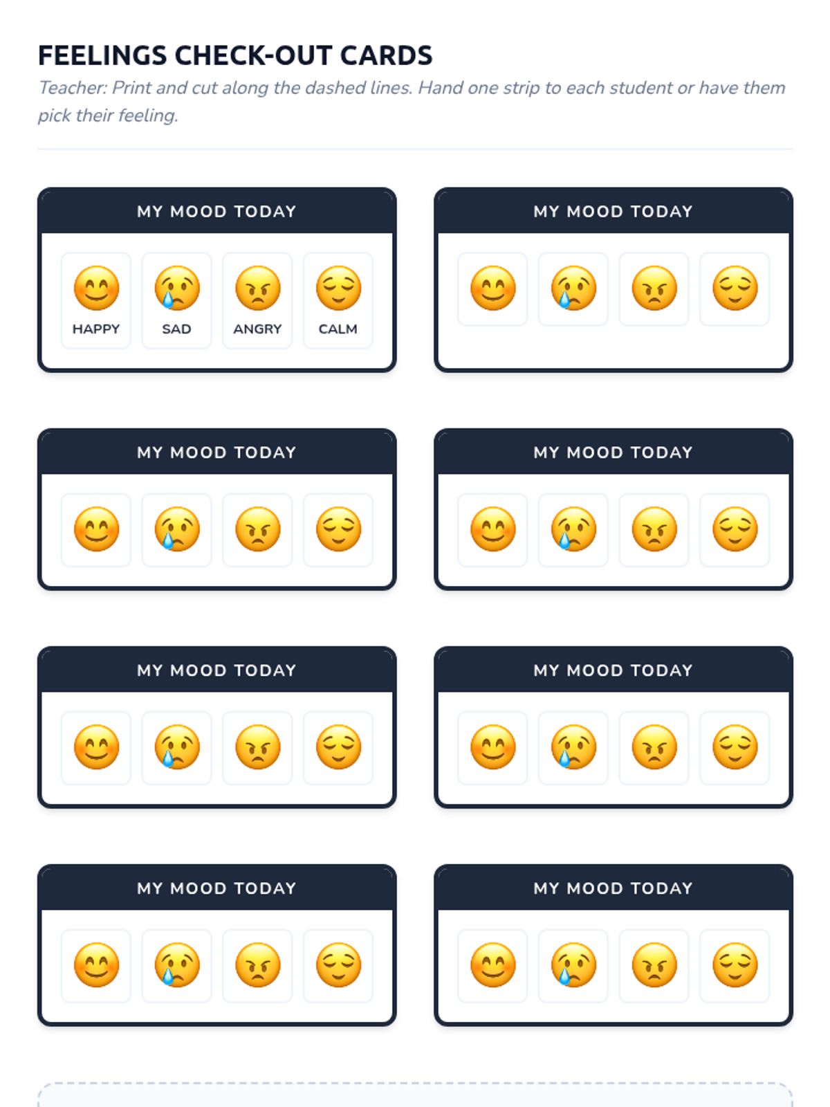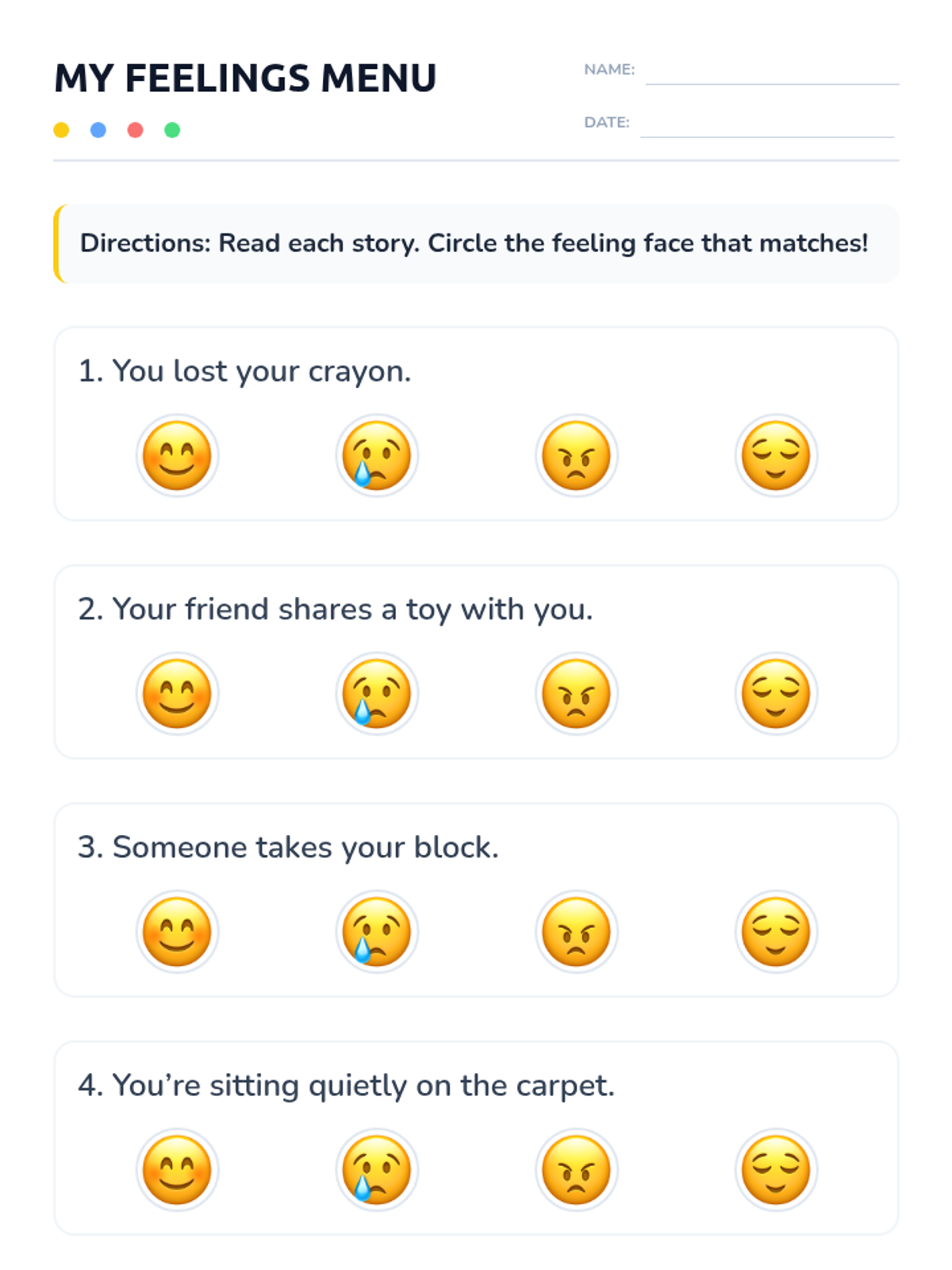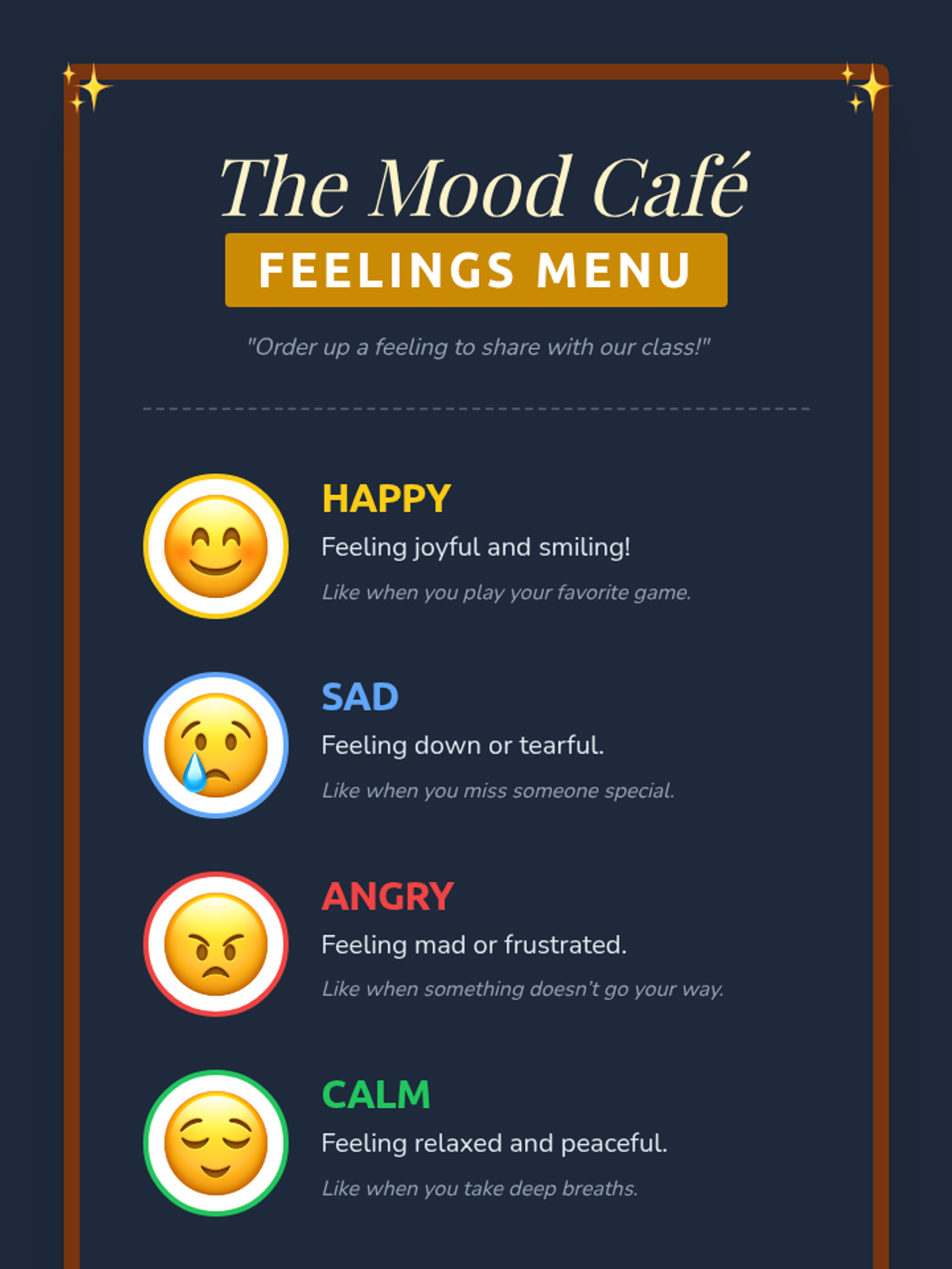 A 30-minute Tier 1 lesson for 1st graders to build emotional literacy using a 'Feelings Menu' concept to identify and express four basic emotions.