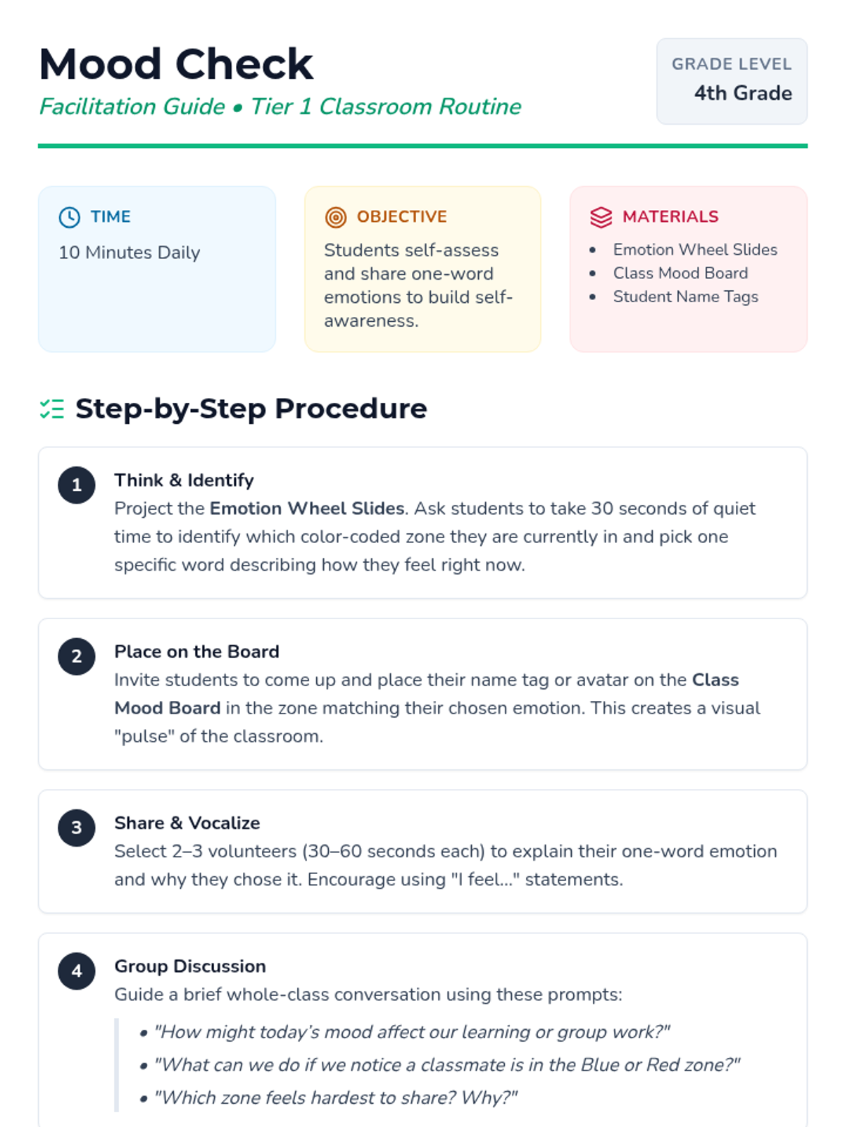 A quick, 10-minute daily routine for 4th graders to check in with their emotions using a color-coded quadrant system to foster self-awareness and classroom empathy.