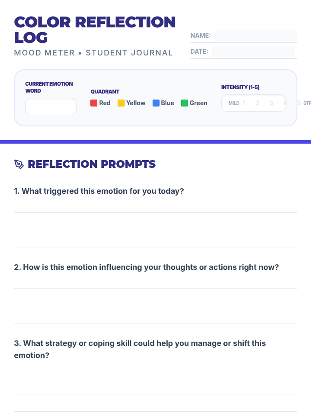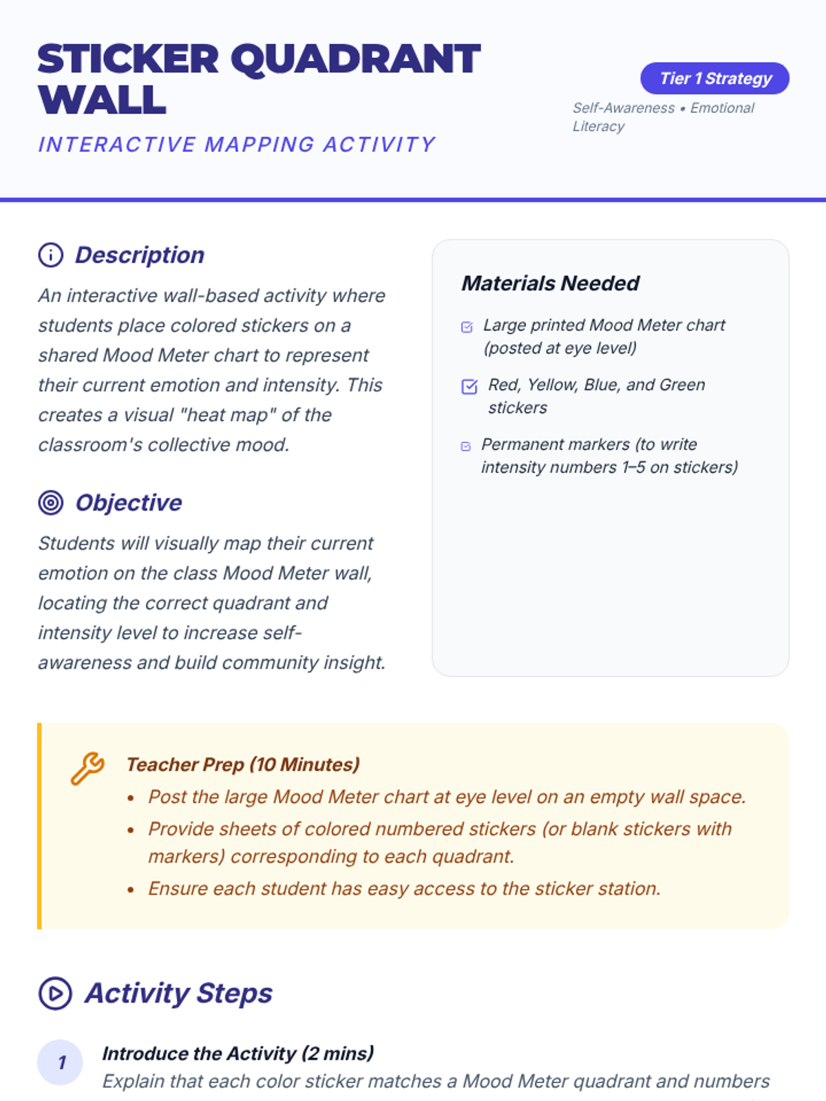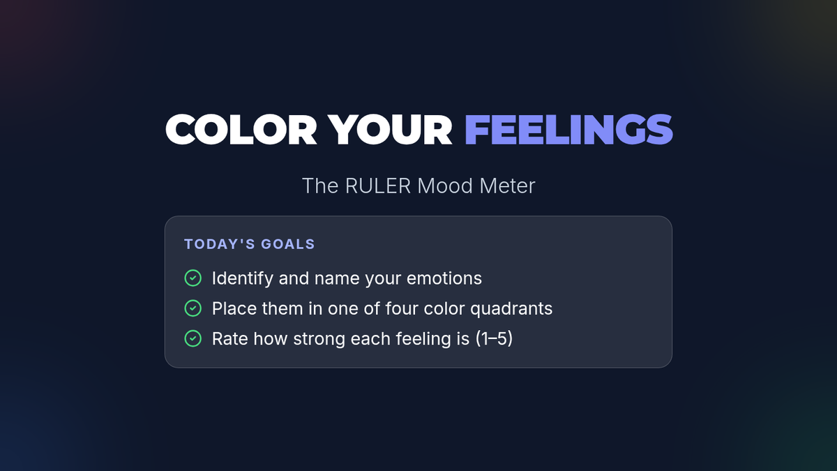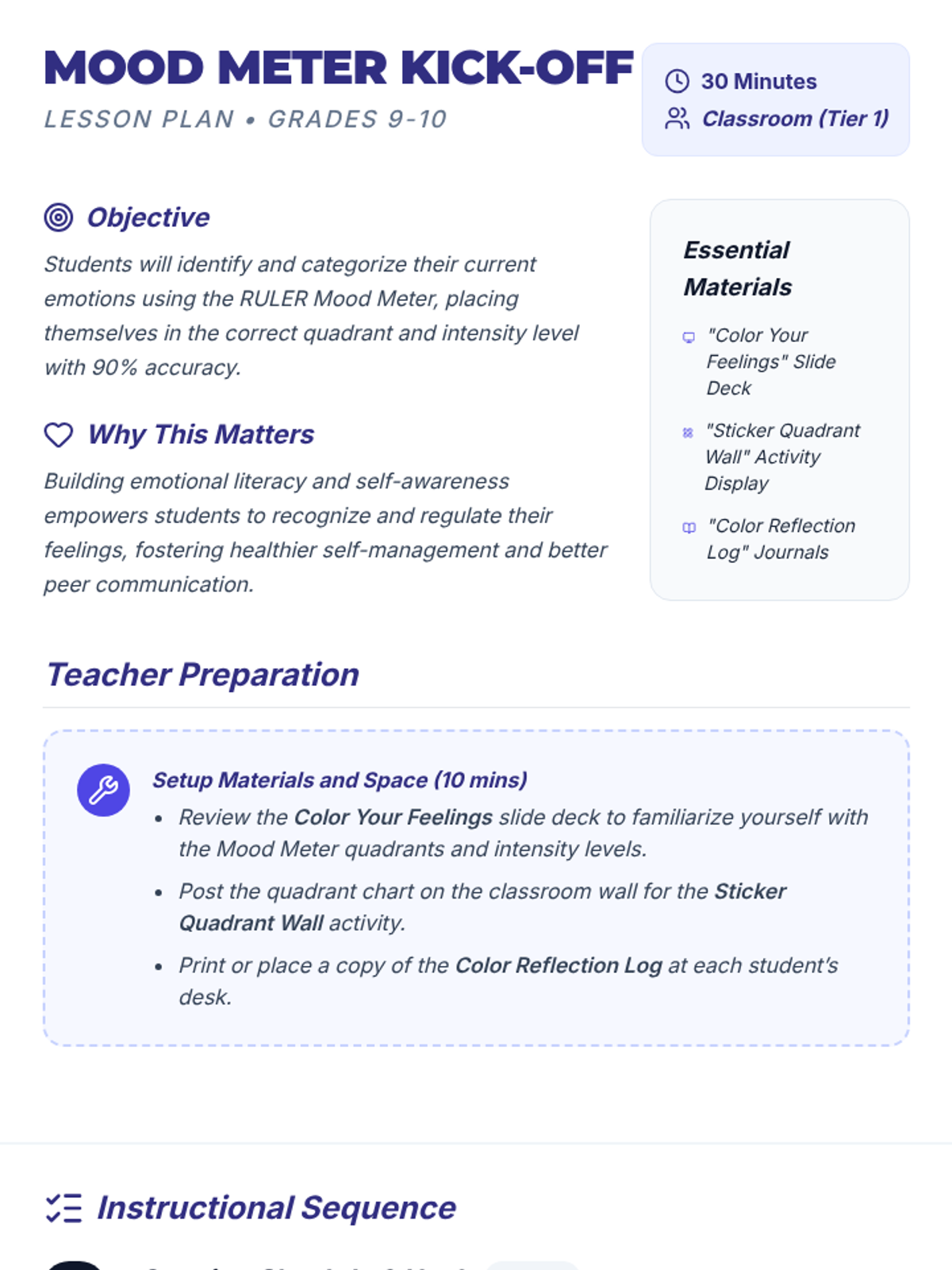 A 30-minute social-emotional learning session for grades 9-10 where students use the RULER Mood Meter to identify, name, and categorize their emotions by quadrant and intensity.