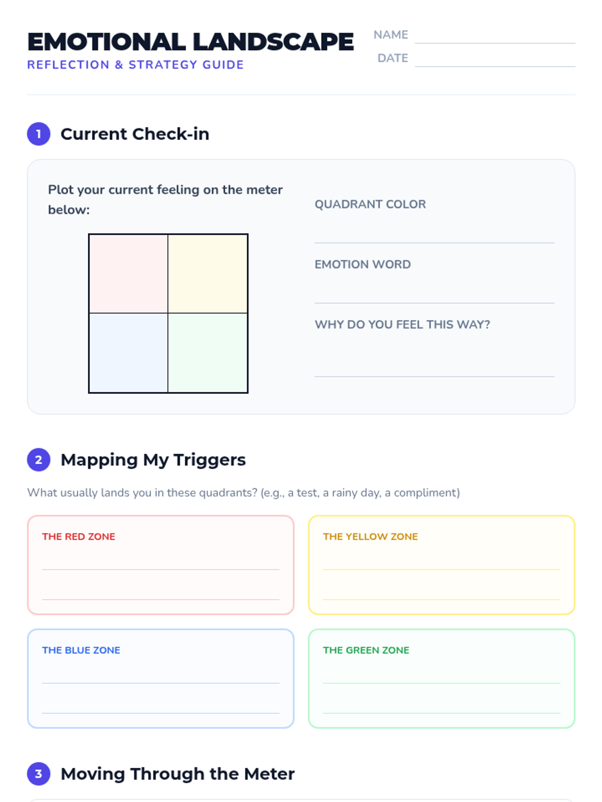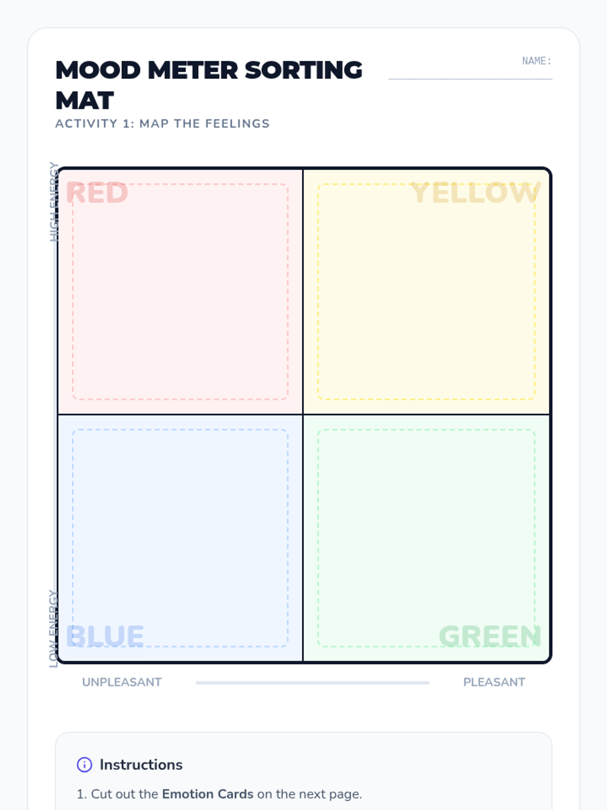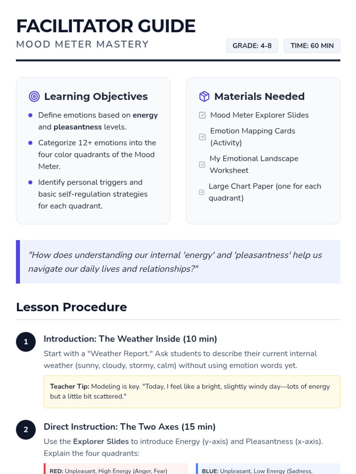 This lesson introduces students to the Mood Meter, a visual tool to help them identify and categorize their emotions based on energy and pleasantness. Students will develop emotional literacy and learn to select appropriate strategies for managing different emotional states.