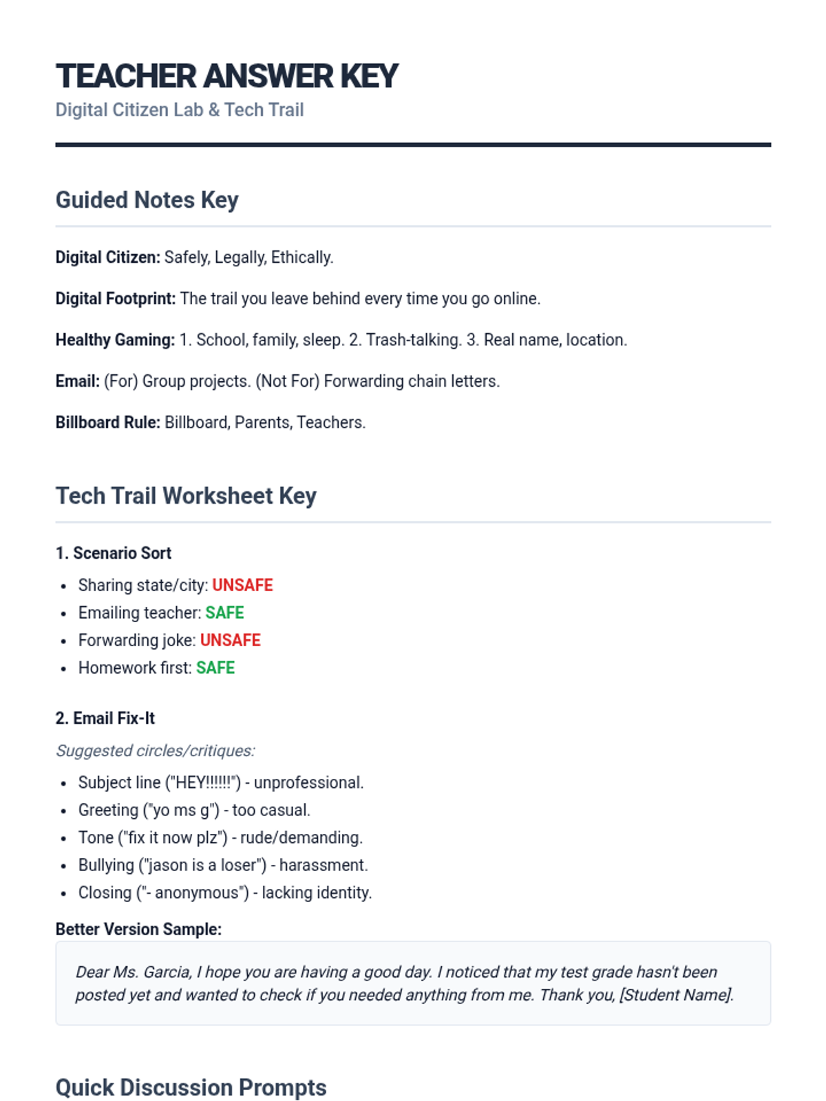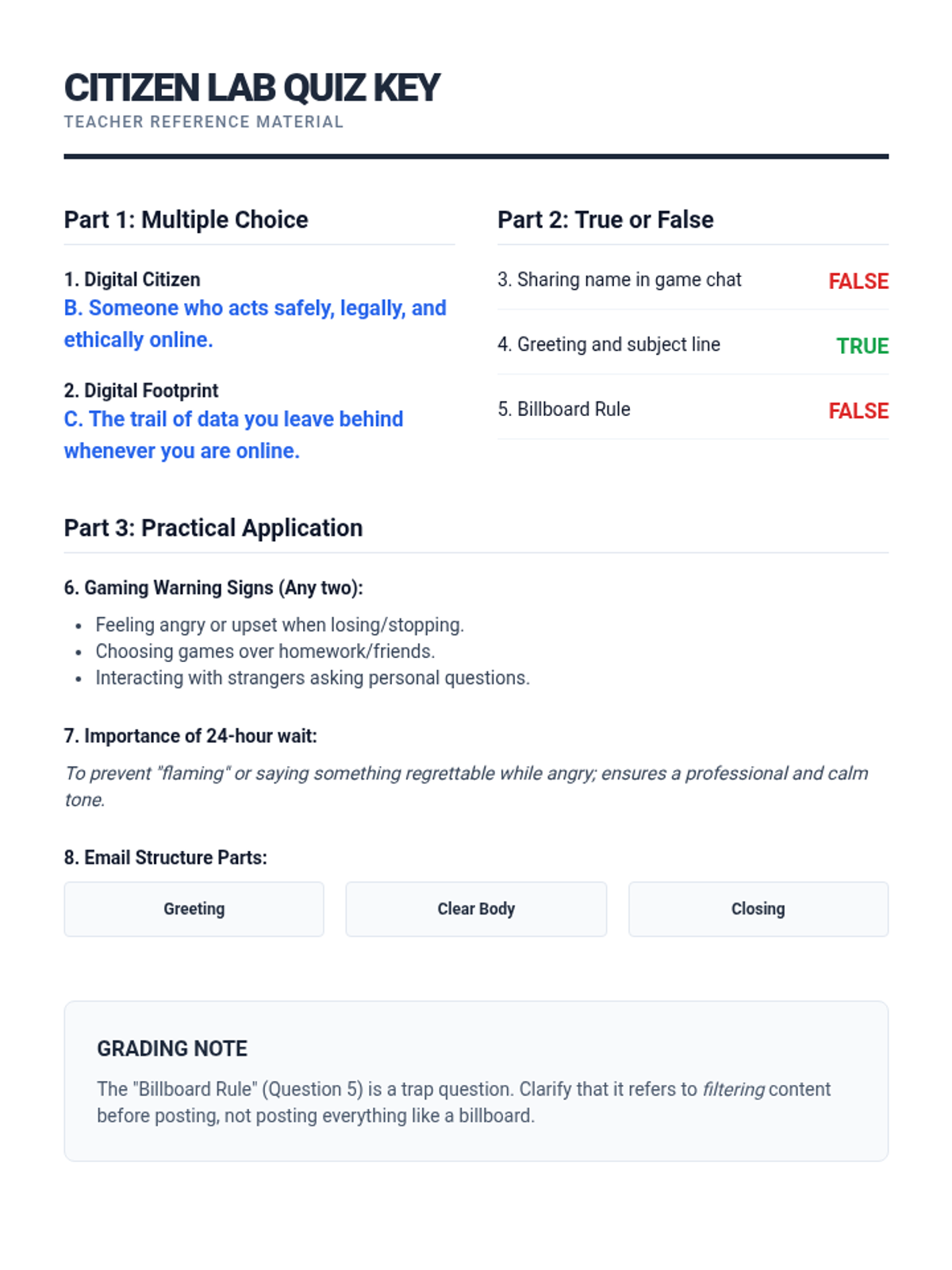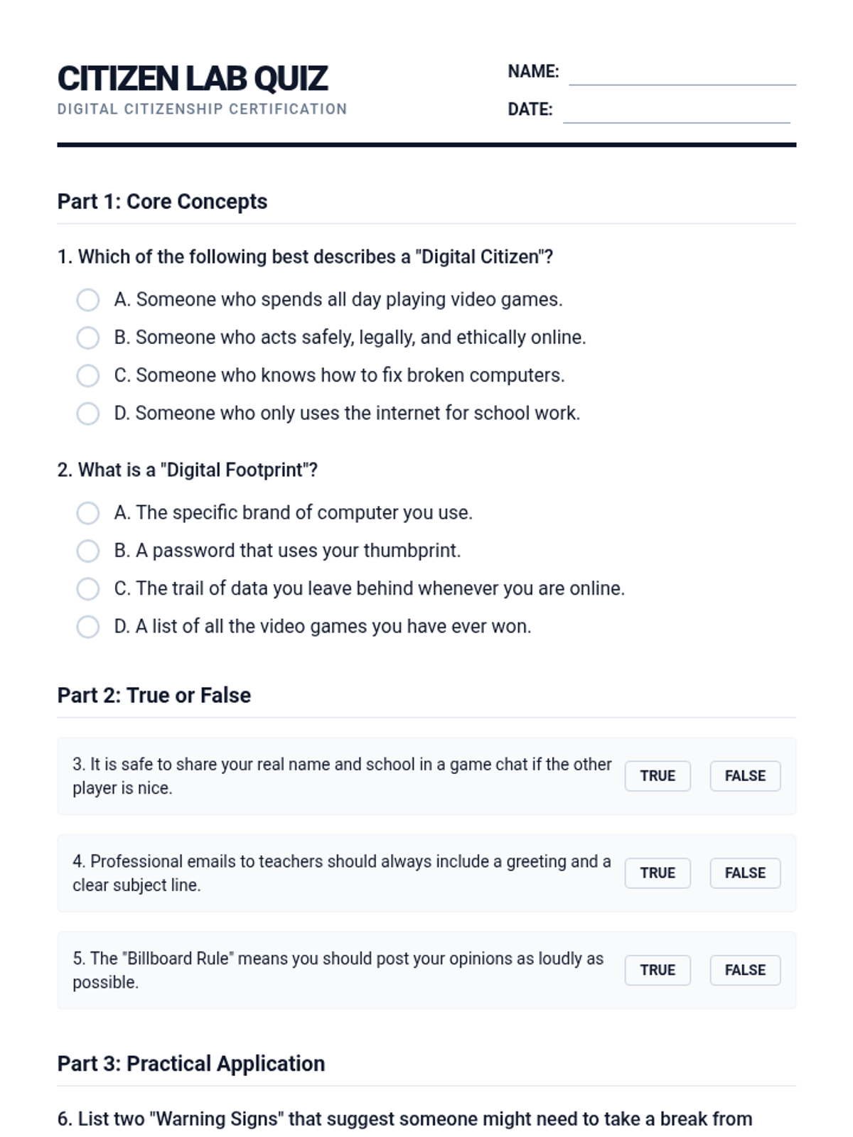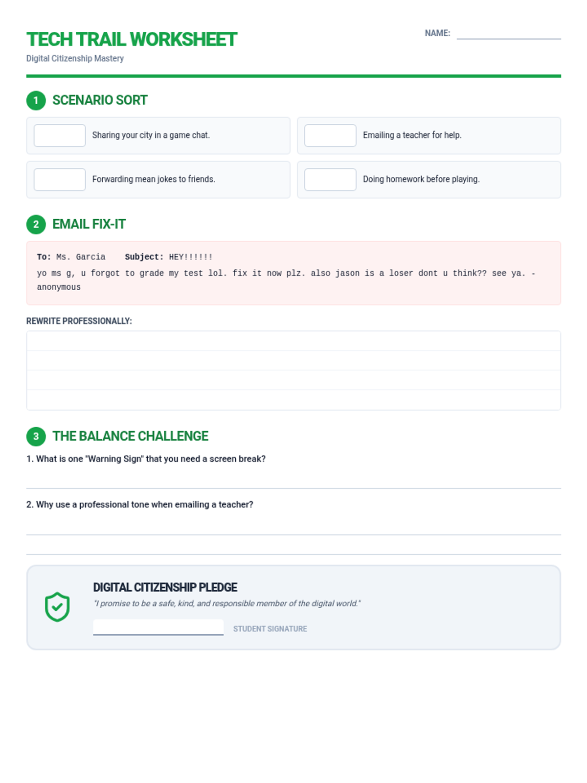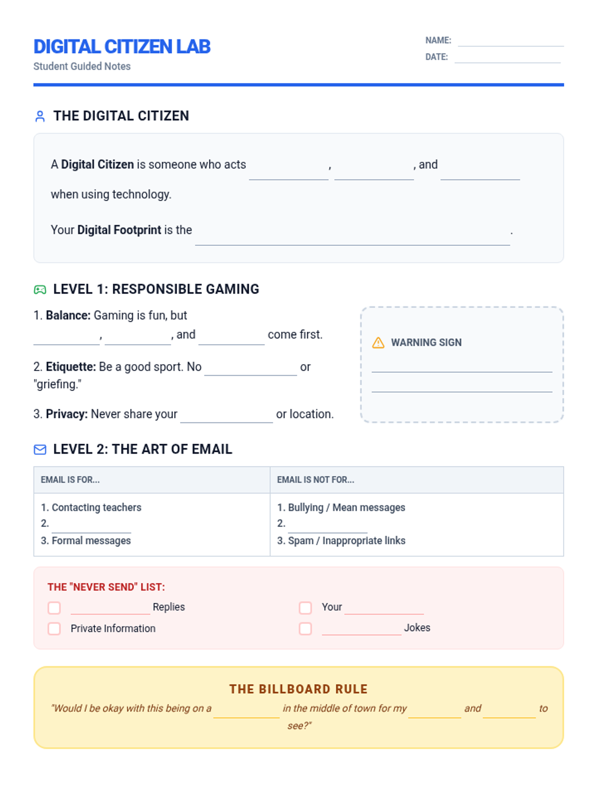 A comprehensive lesson on digital citizenship, focusing on responsible gaming habits and professional email communication for students.