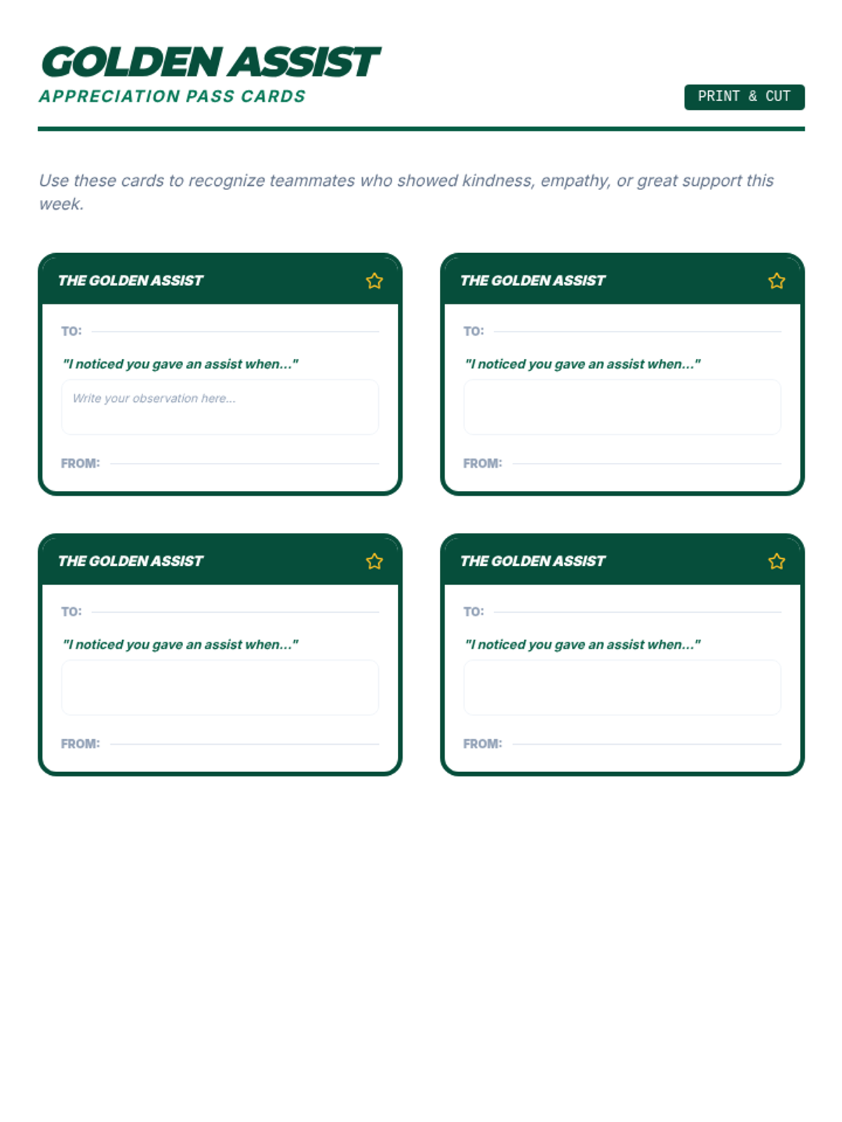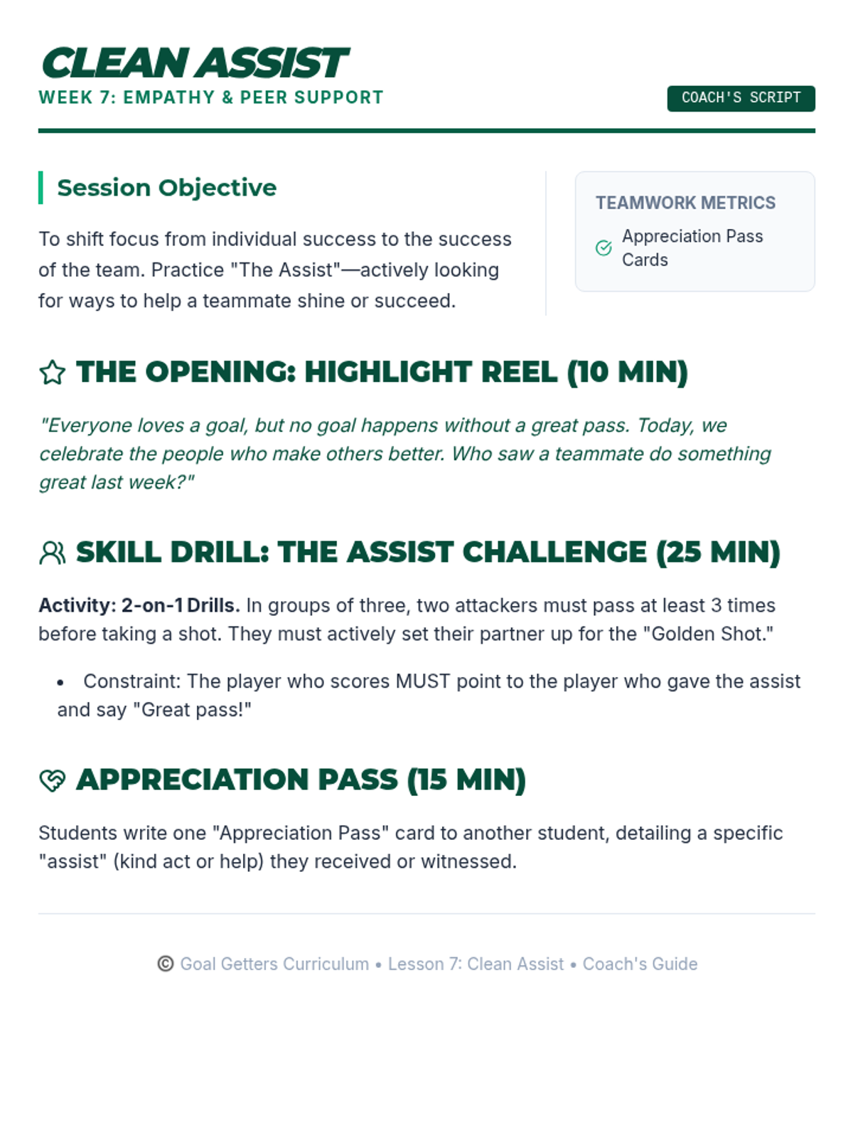 Encourage empathy and peer support by focusing on the 'assist' rather than just the goal.