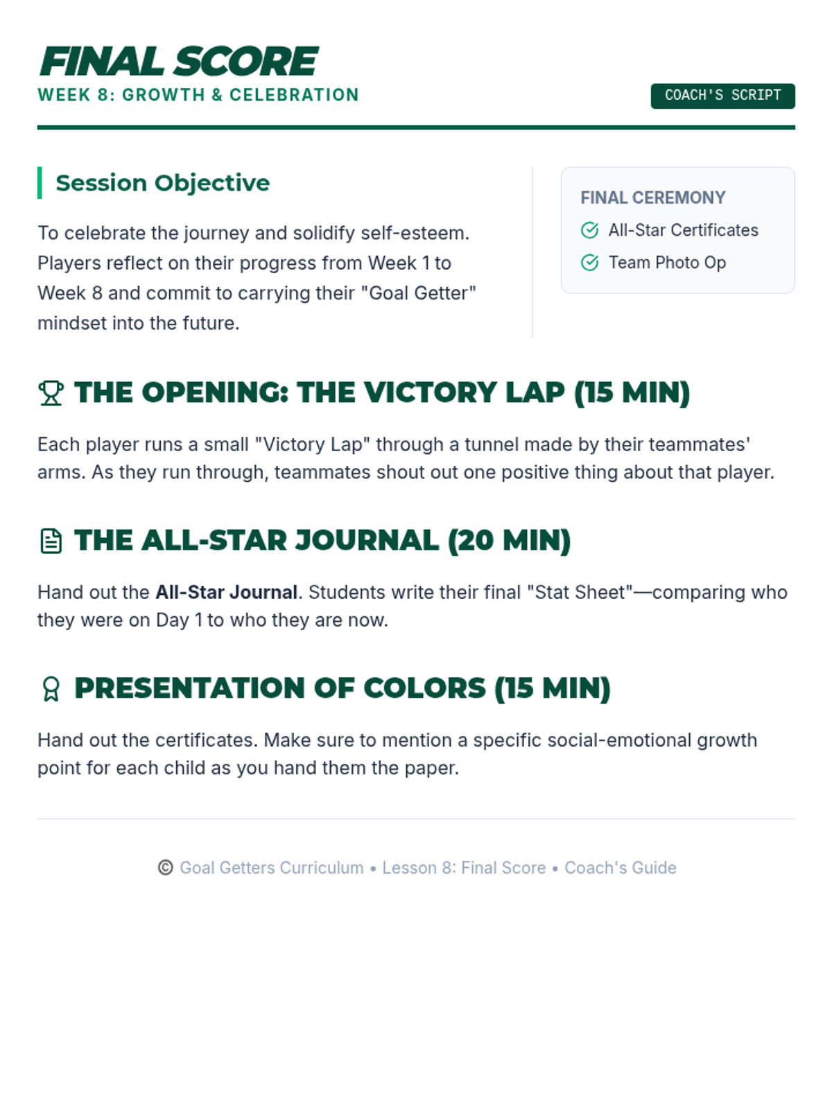 Reflect on growth, celebrate achievements, and solidify the high self-esteem built throughout the program.