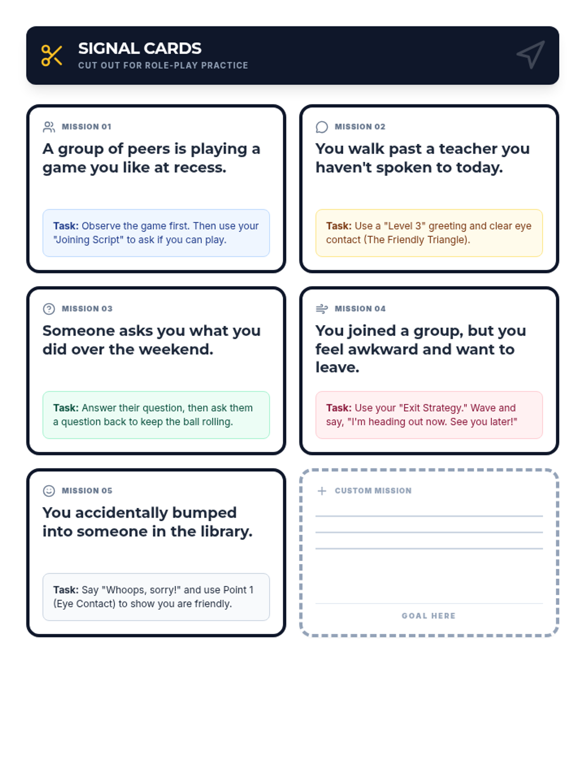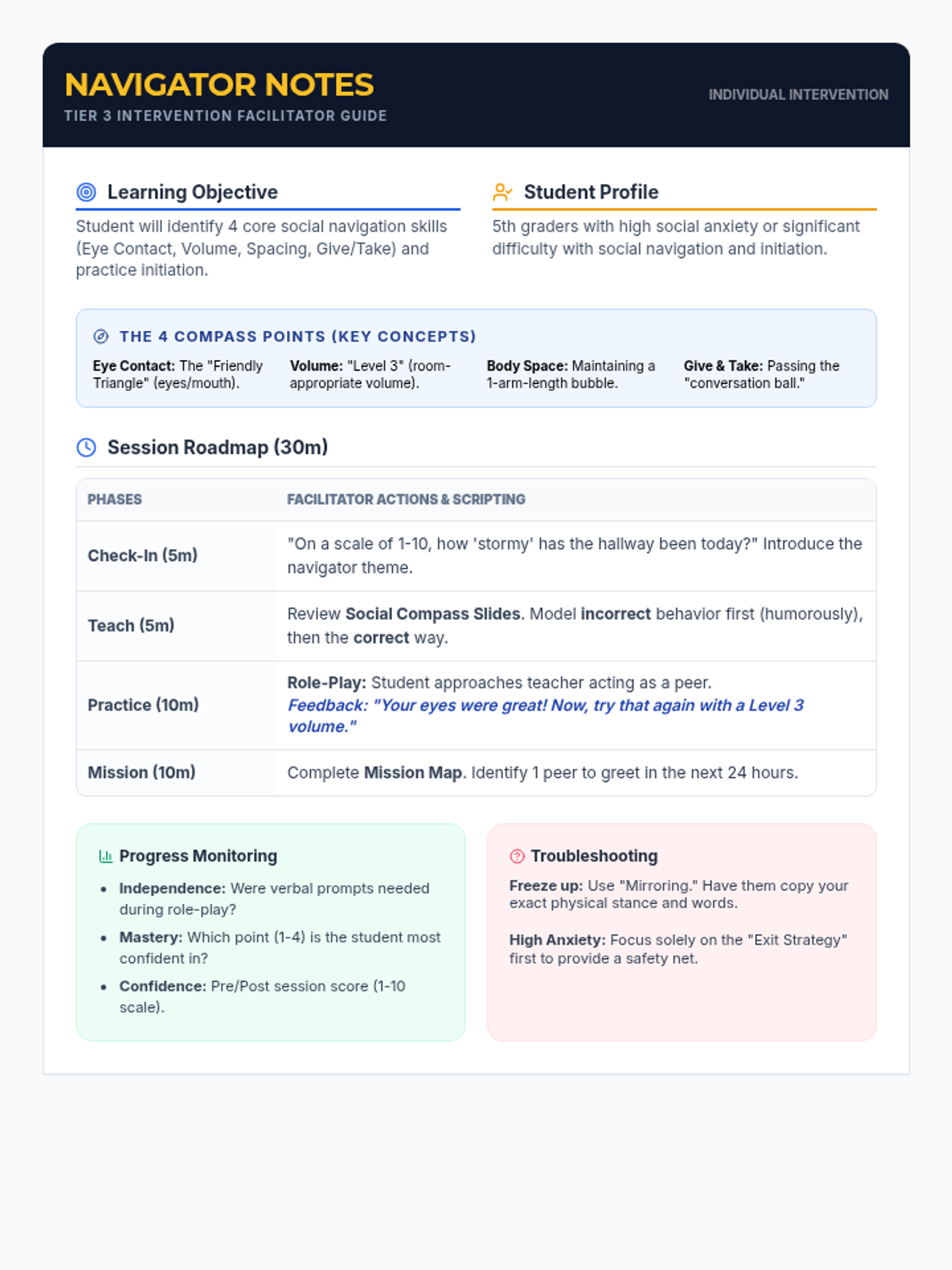A Tier 3 individual intervention lesson focused on building self-confidence through social navigation skills, including initiating interactions and responding to social cues.