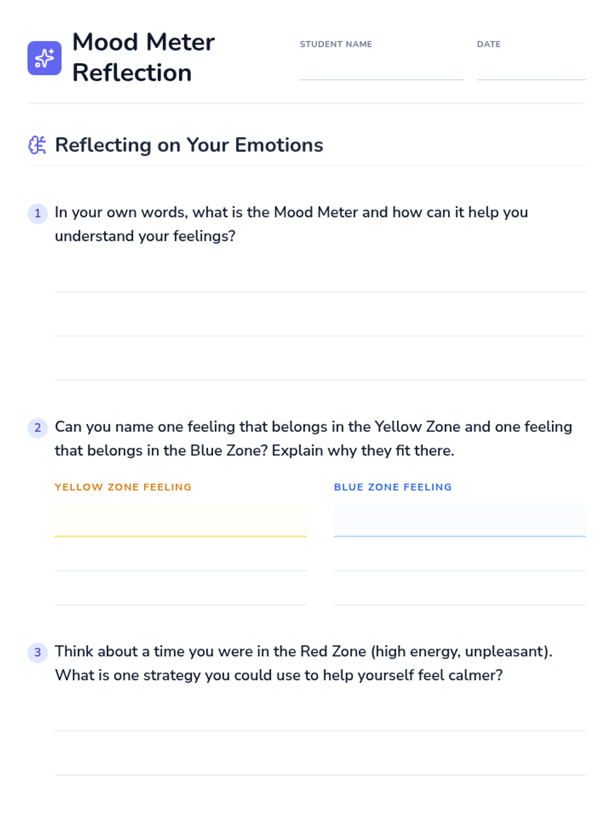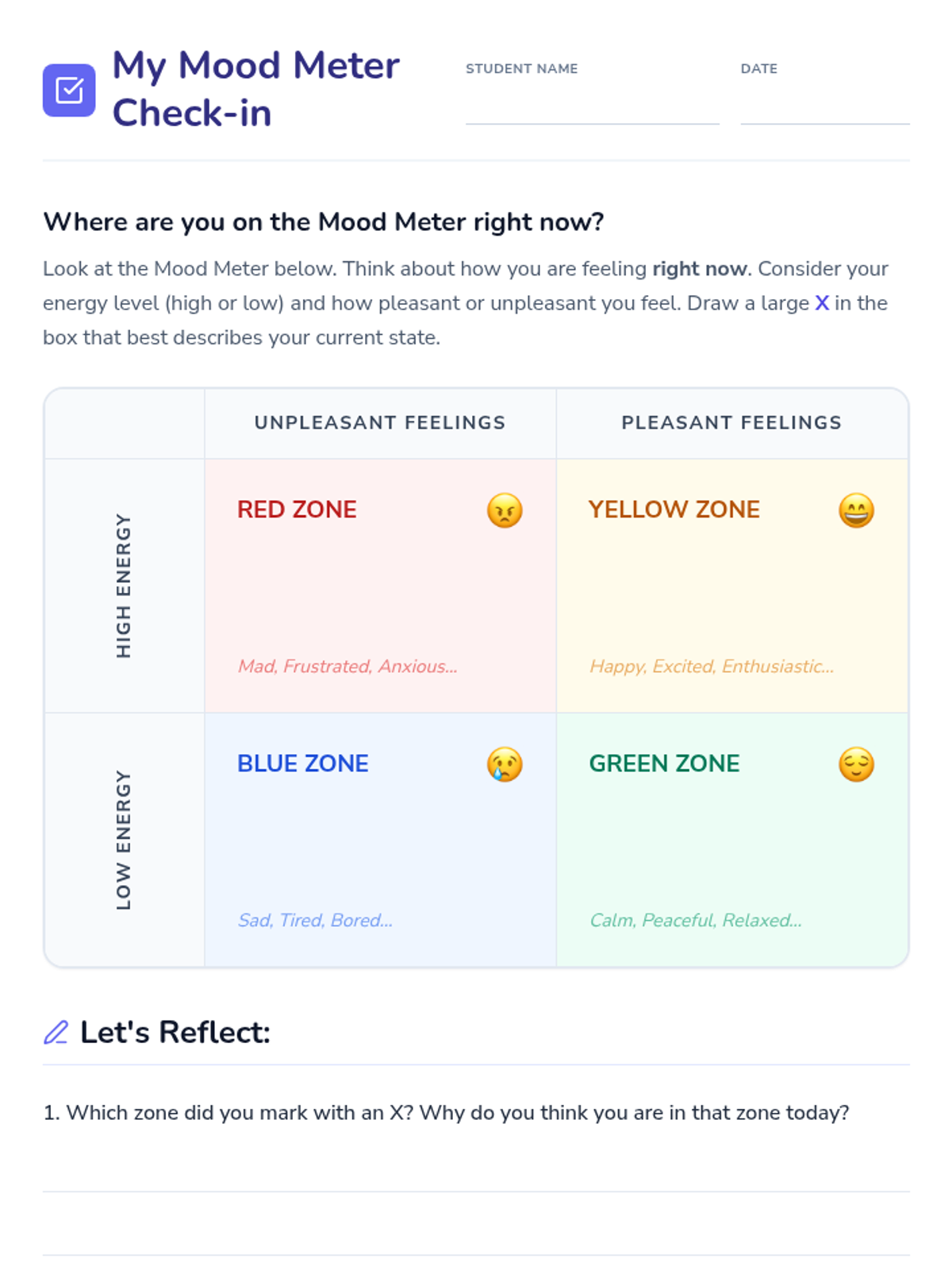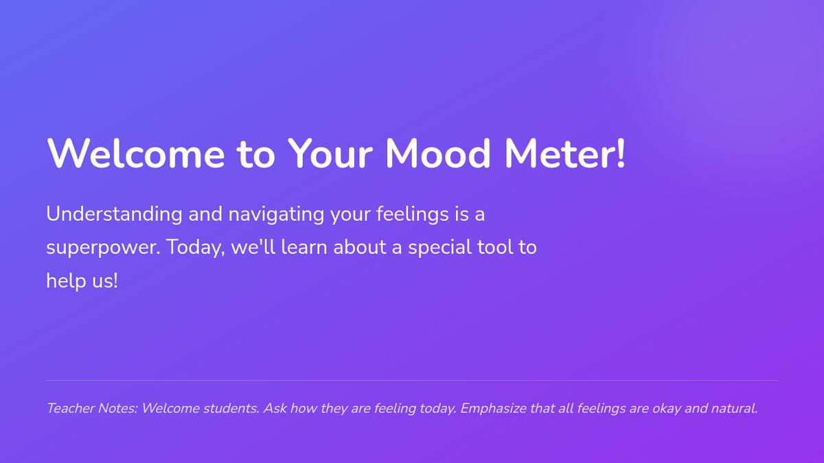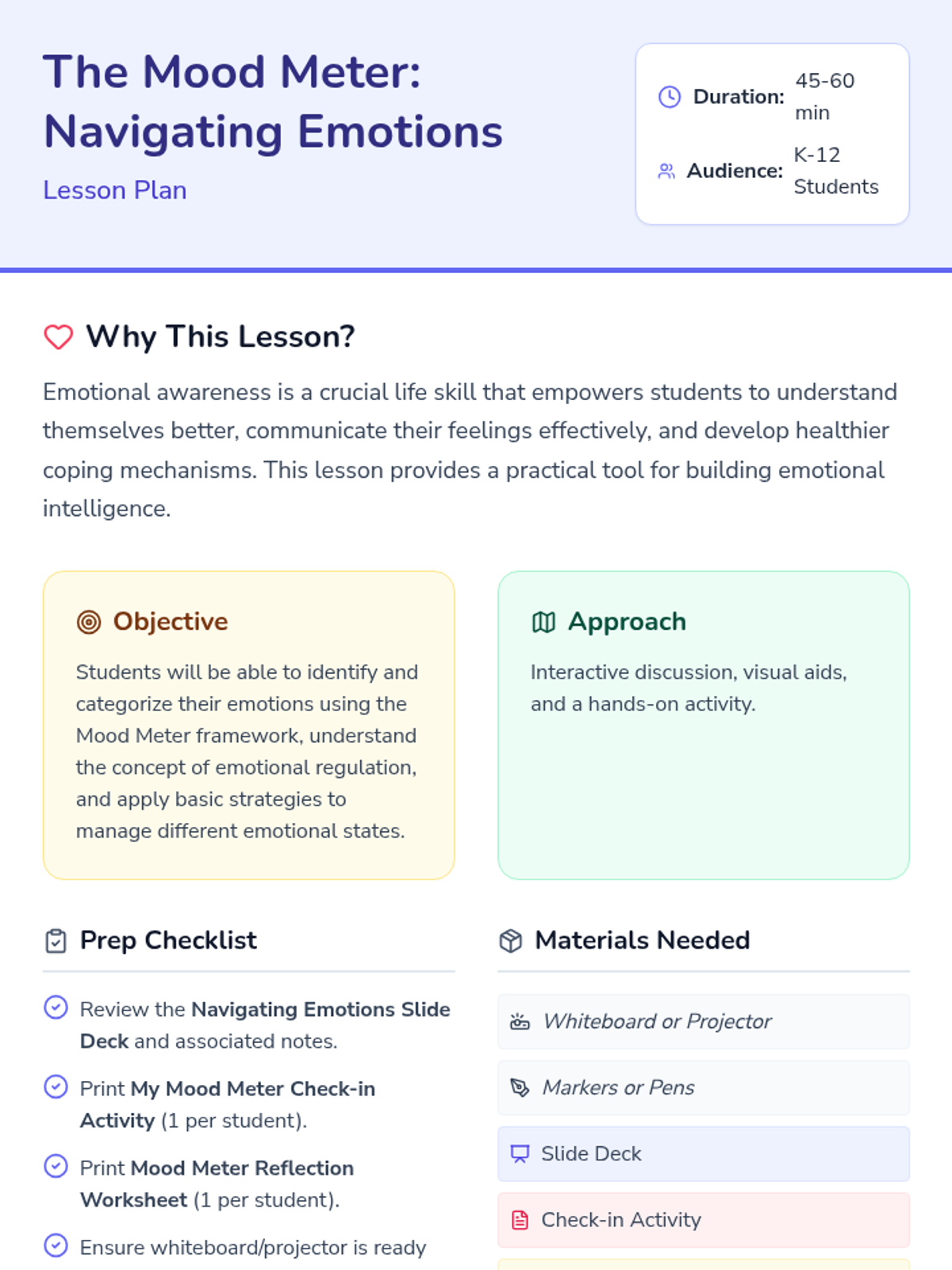 An introductory lesson on emotional awareness using the Mood Meter framework. Students learn to identify, categorize, and regulate their emotions through four color-coded quadrants: Red, Blue, Green, and Yellow.