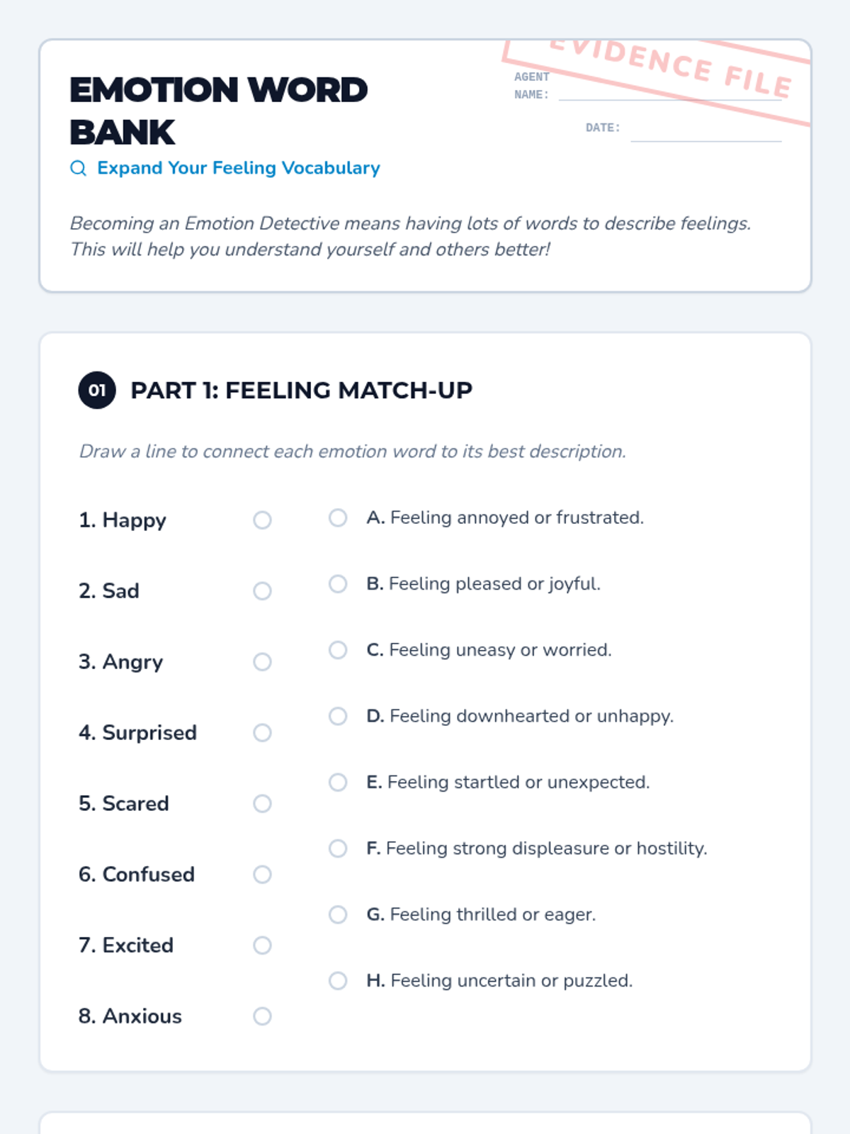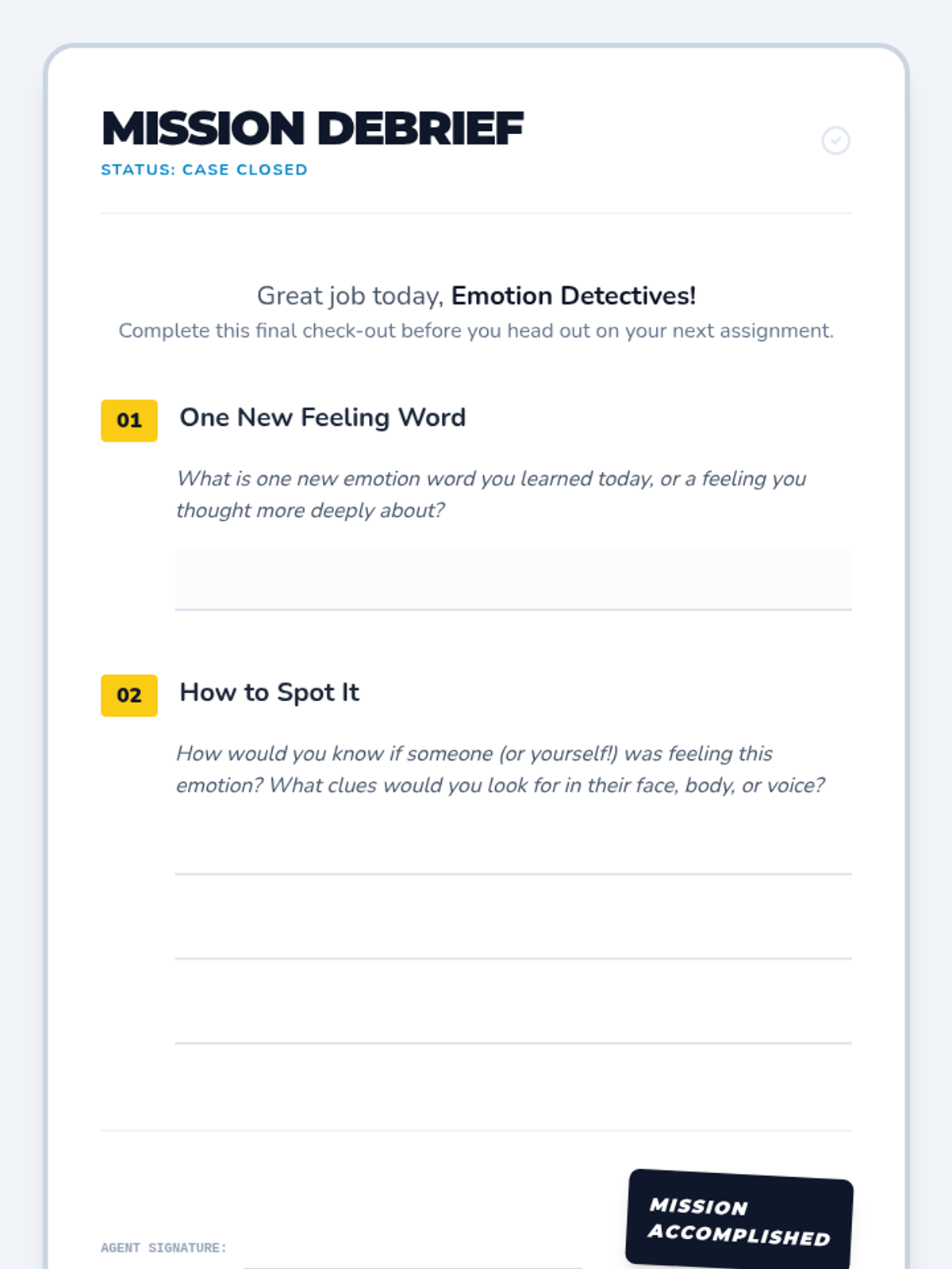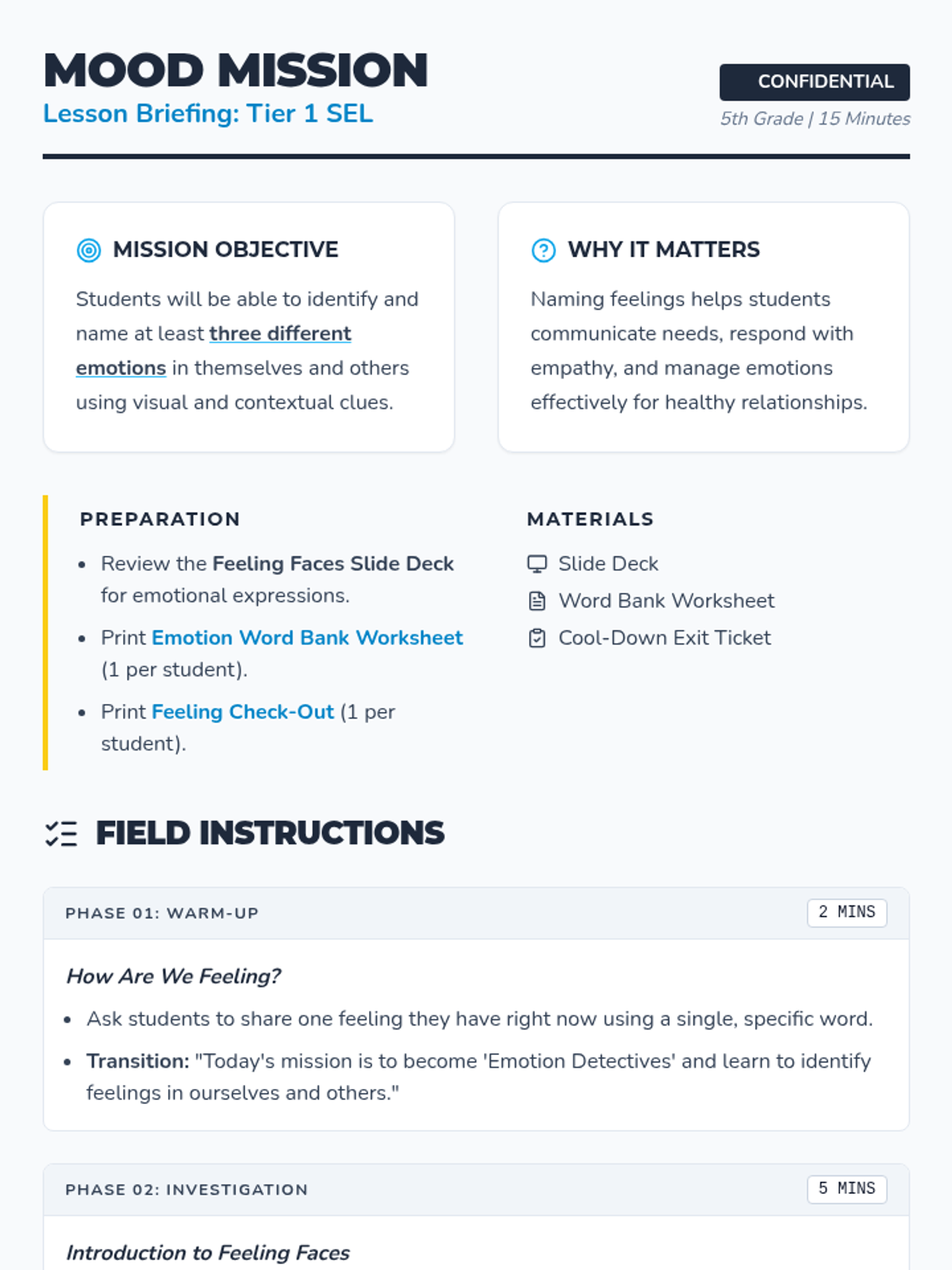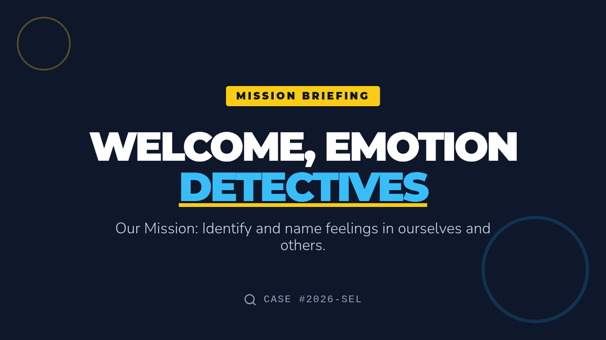 A 15-minute emotional intelligence lesson for 5th graders focused on identifying and naming emotions using visual cues and body language. Students act as 'Emotion Detectives' to expand their vocabulary and empathy.