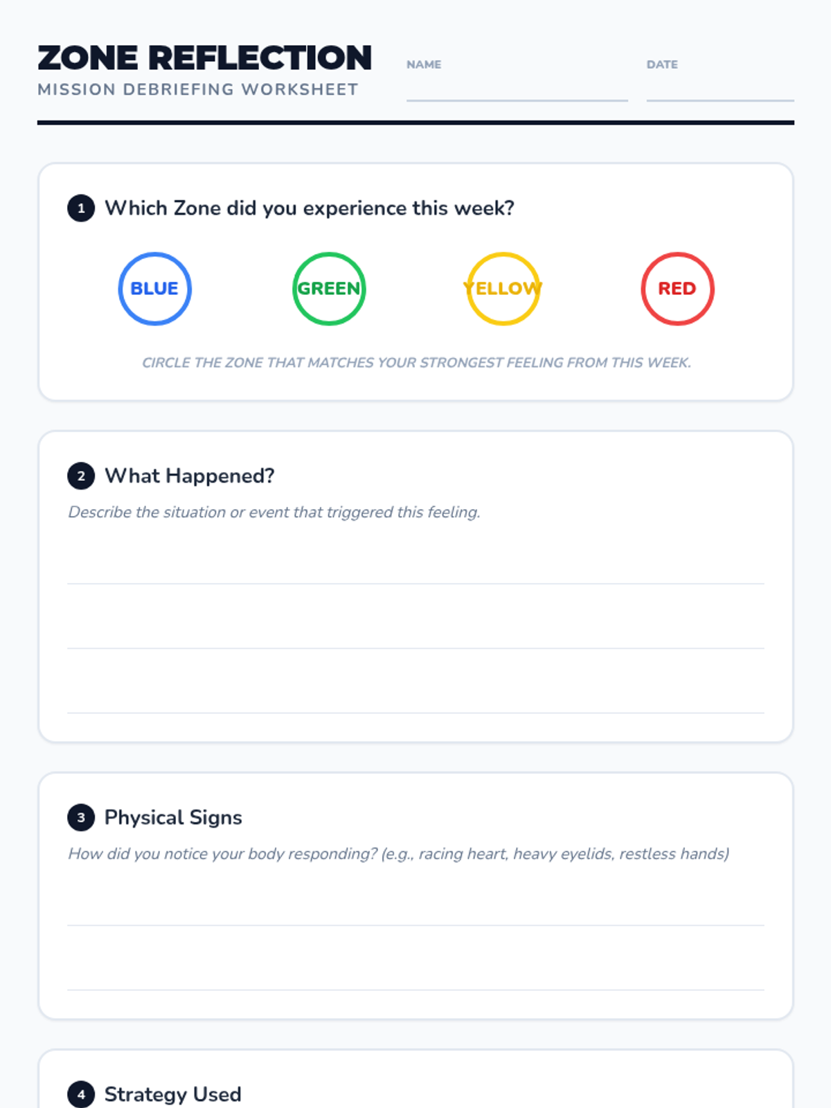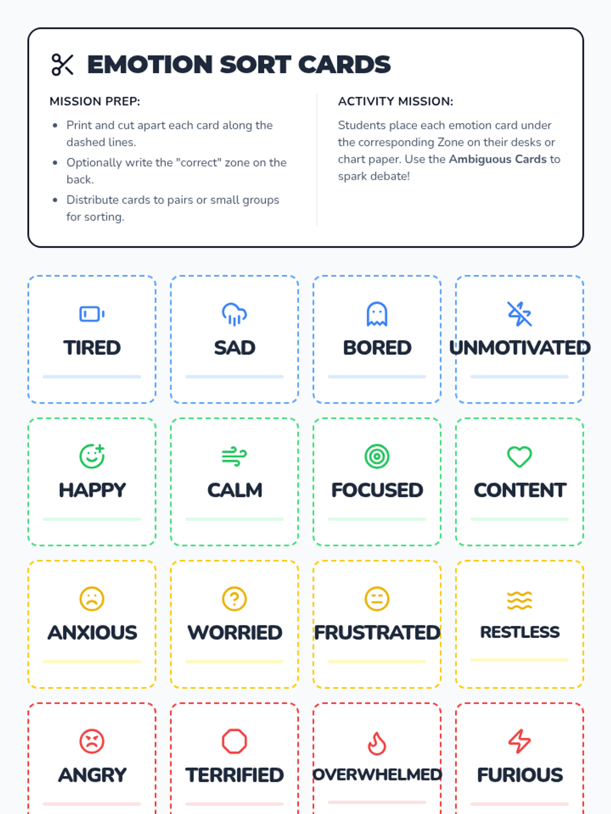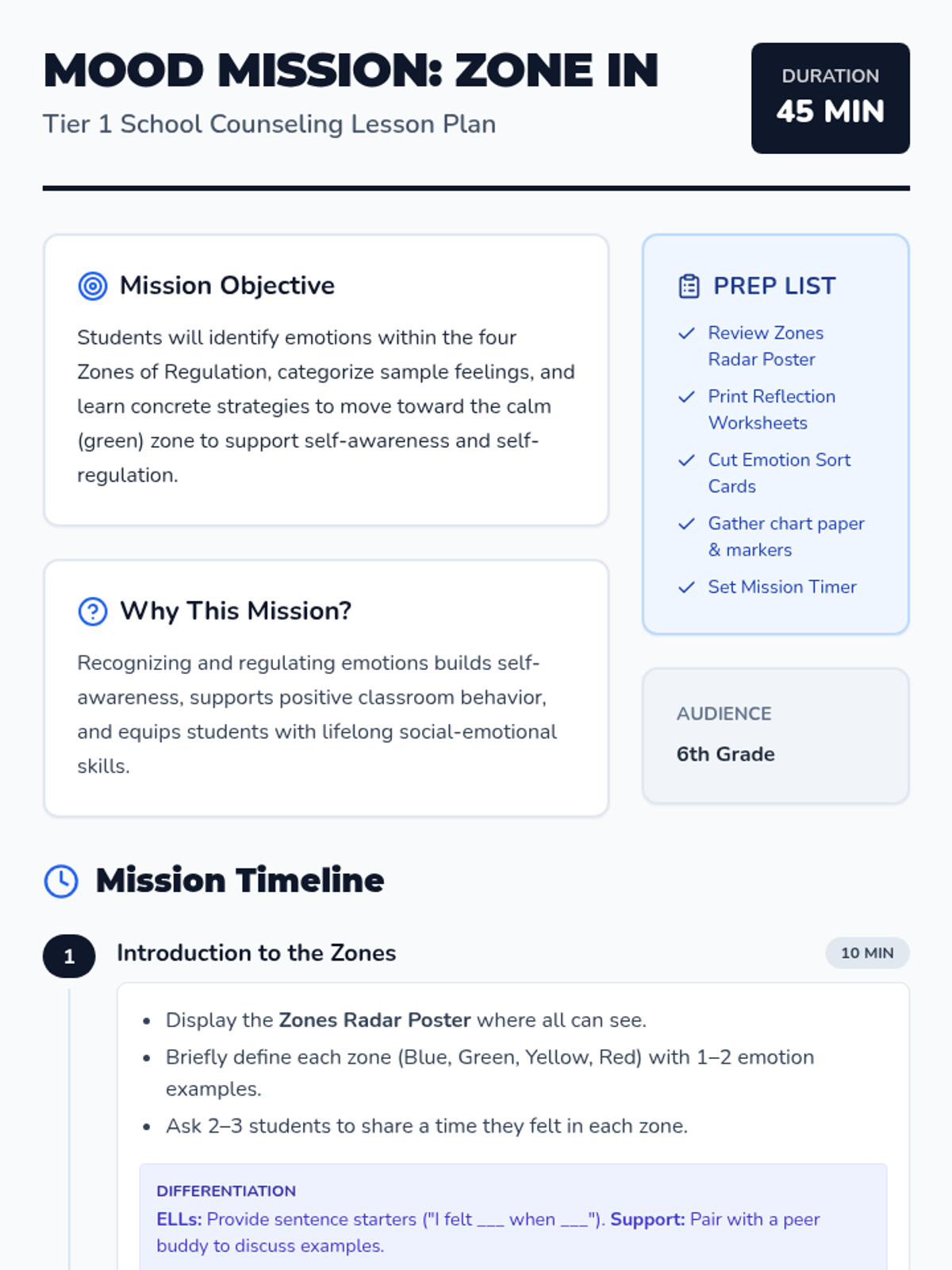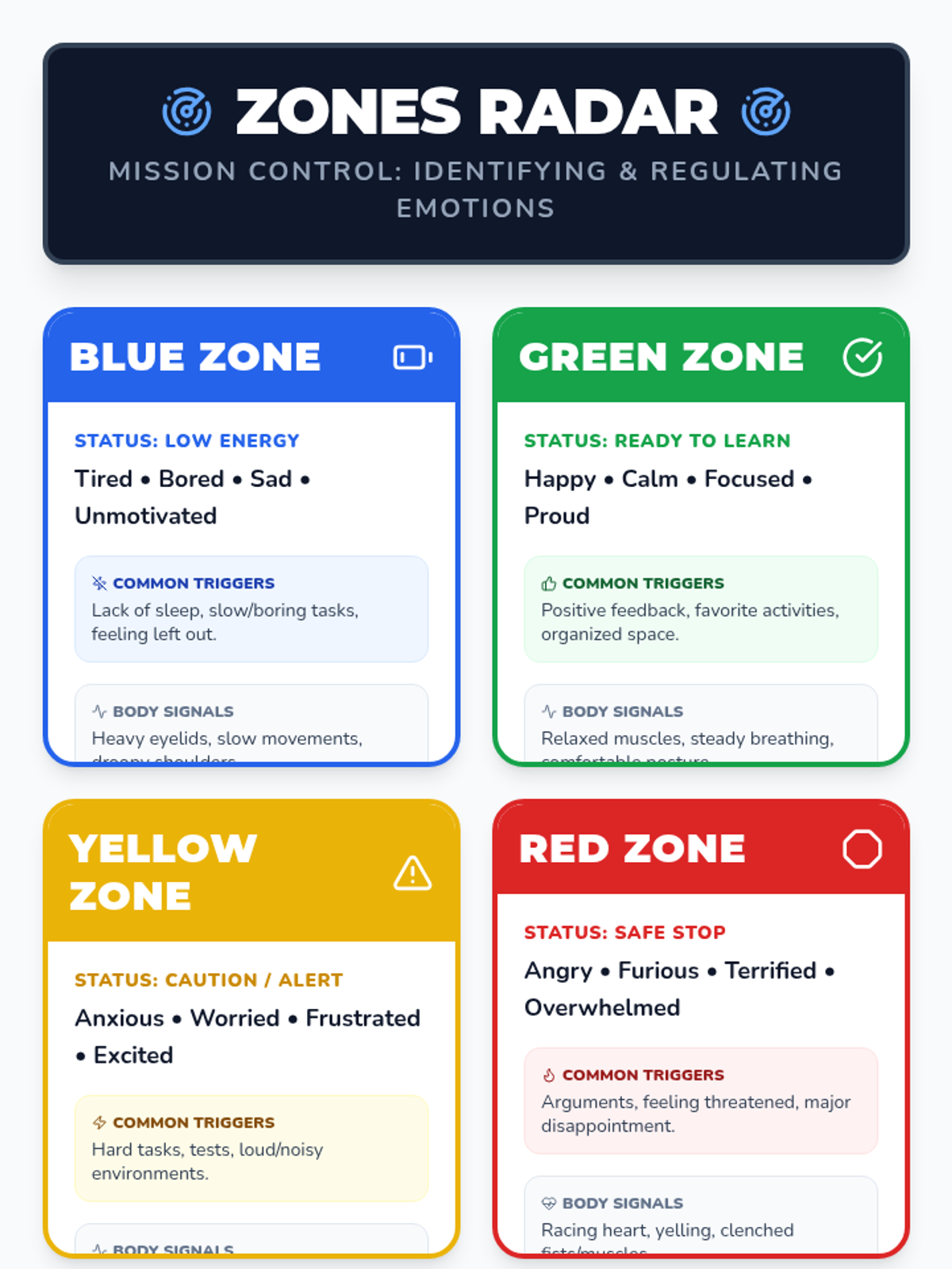 A 45-minute social-emotional learning lesson for 6th graders focused on the Zones of Regulation framework. Students identify emotional zones, recognize body signals, and practice regulation strategies.
