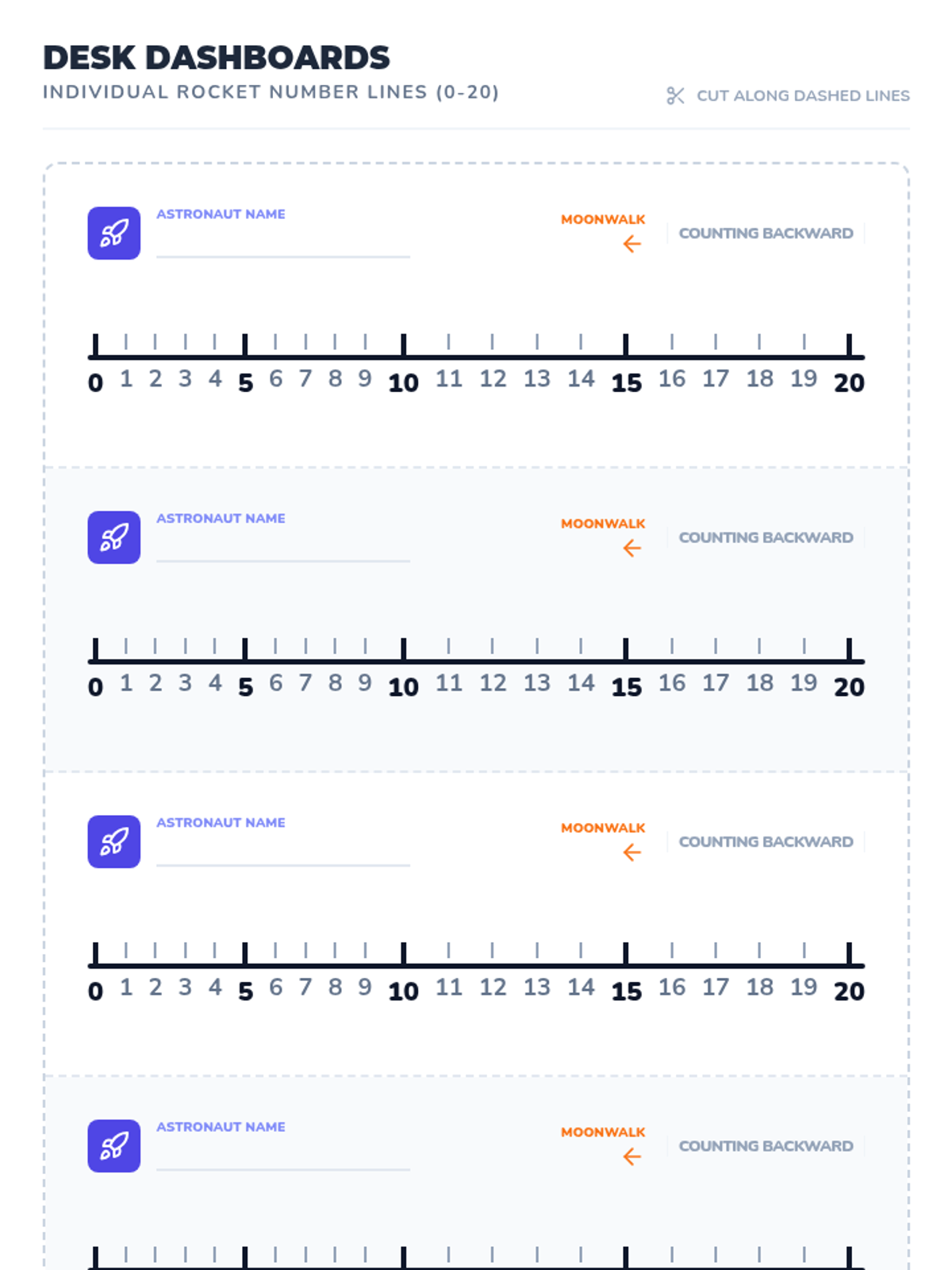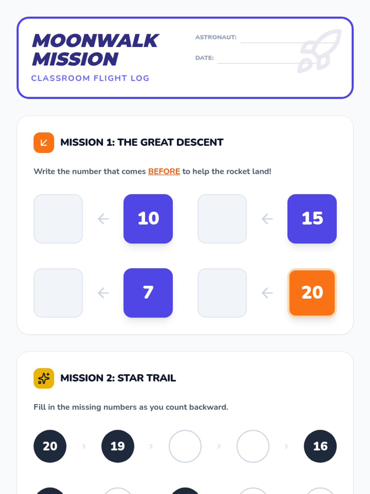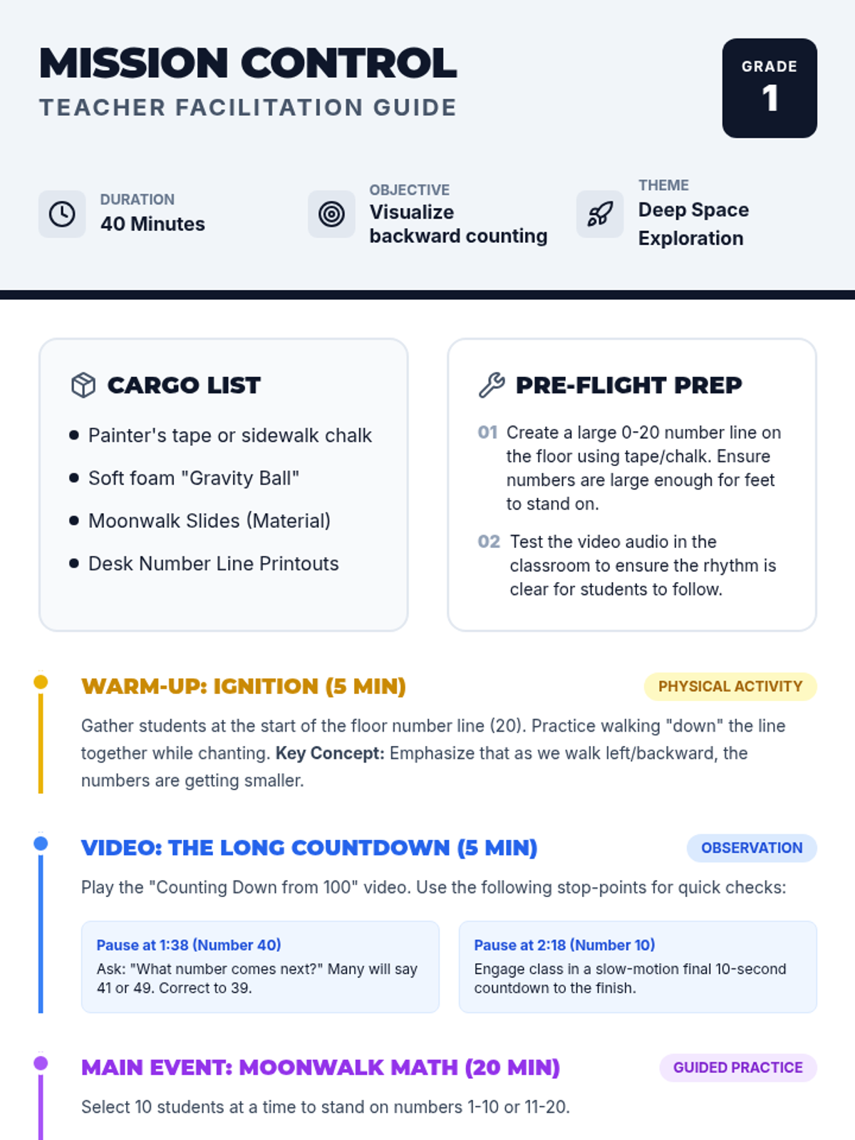 A high-energy lesson where 1st graders learn to count backward by physically moving along a number line, watching a space-themed countdown video, and practicing with rocket-themed materials.