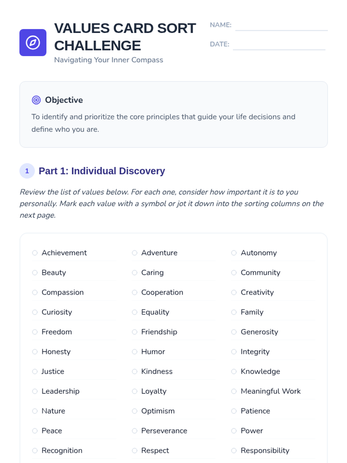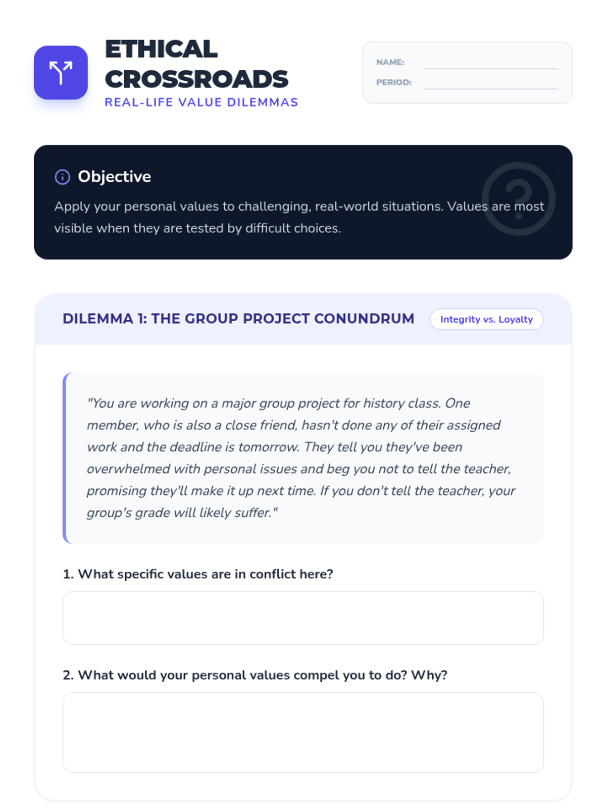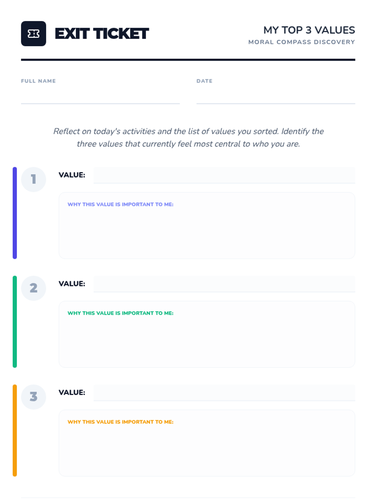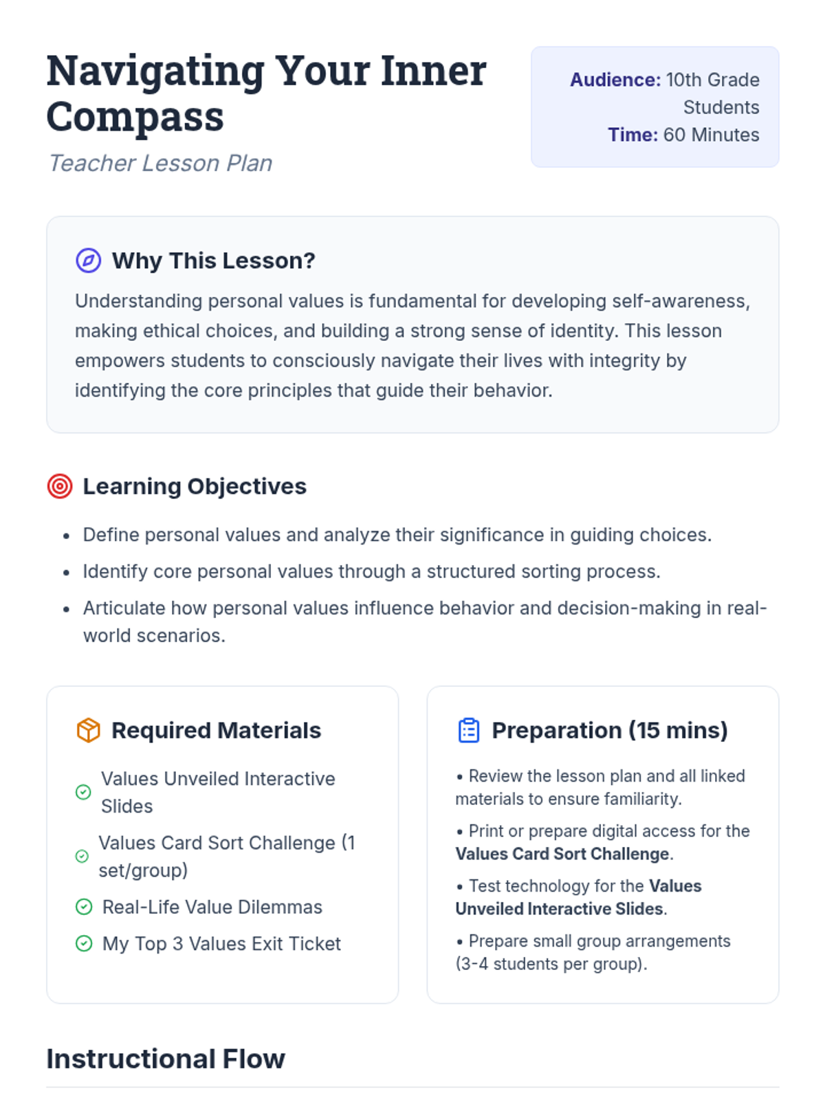 A 60-minute exploration for 10th-grade students to identify their personal values and understand how they act as a 'moral compass' for decision-making and identity.