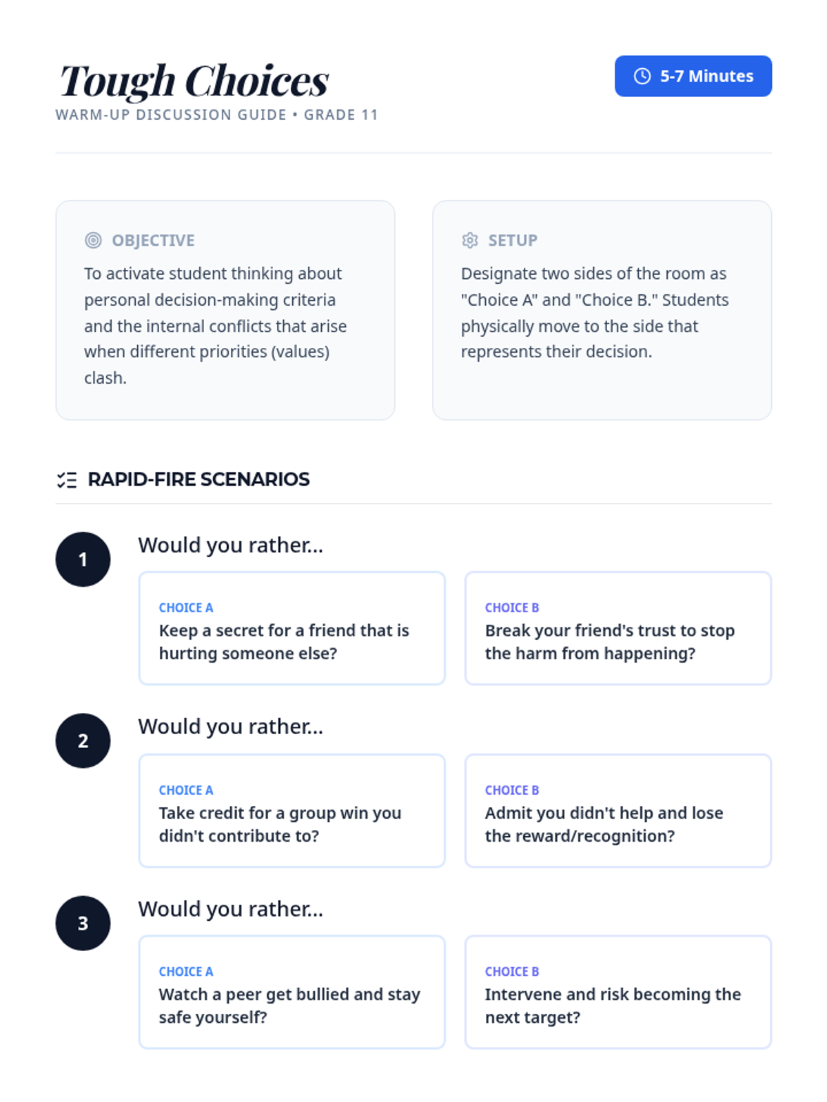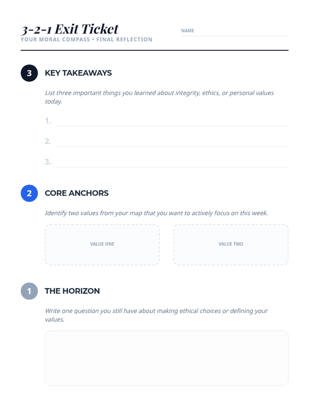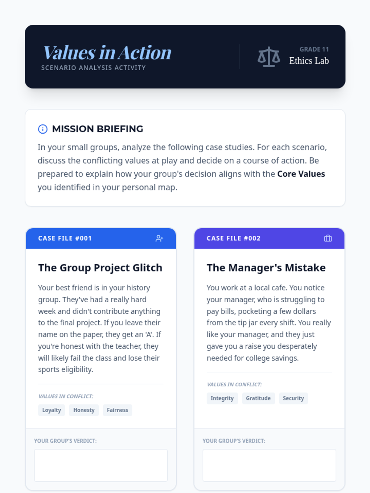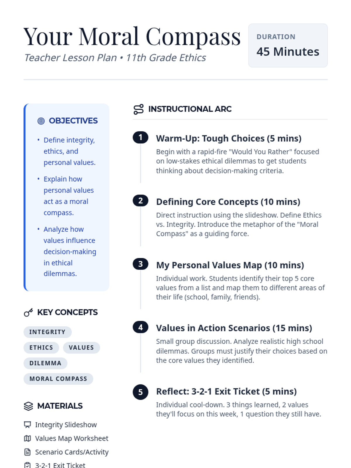 This lesson explores the foundations of personal ethics and integrity, helping 11th-grade students identify their core values and apply them to real-world decision-making. Through interactive discussions and personal mapping, students will define their own 'moral compass' to navigate ethical dilemmas.