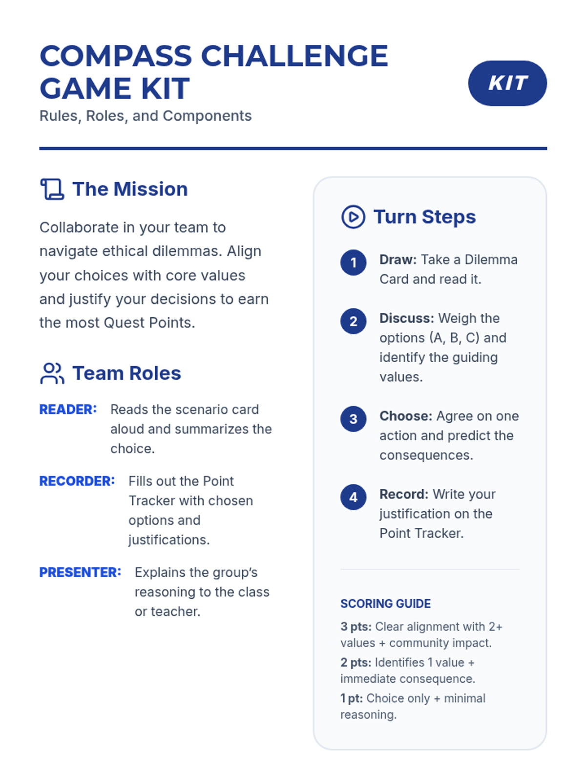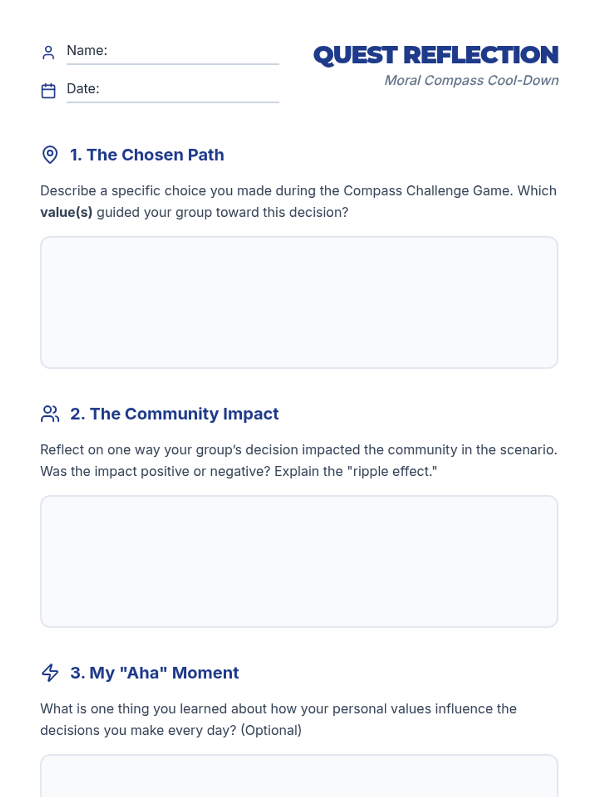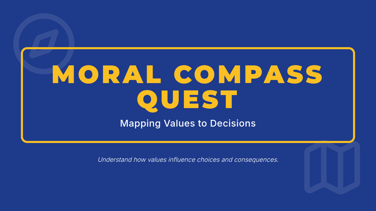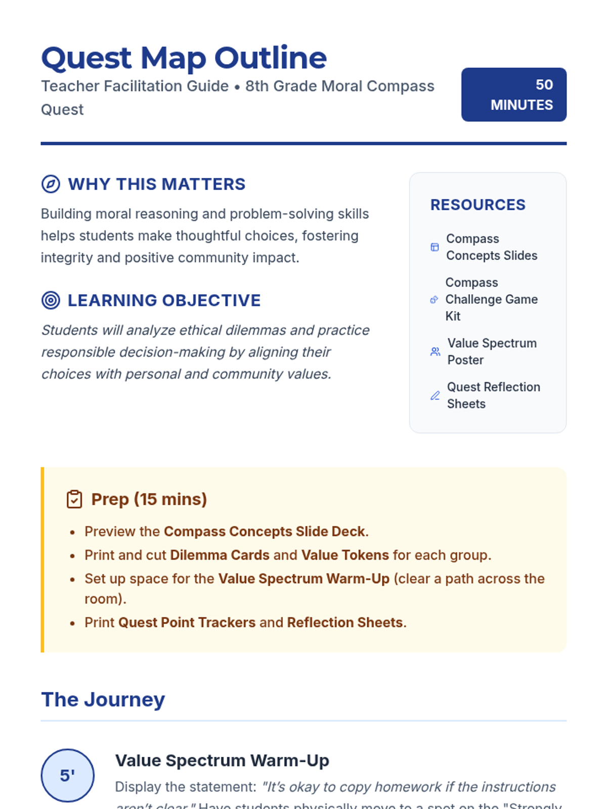 An interactive 50-minute lesson for 8th graders using a 'quest' theme to explore ethical decision-making, personal values, and community impact. Students navigate dilemmas using a moral compass framework.