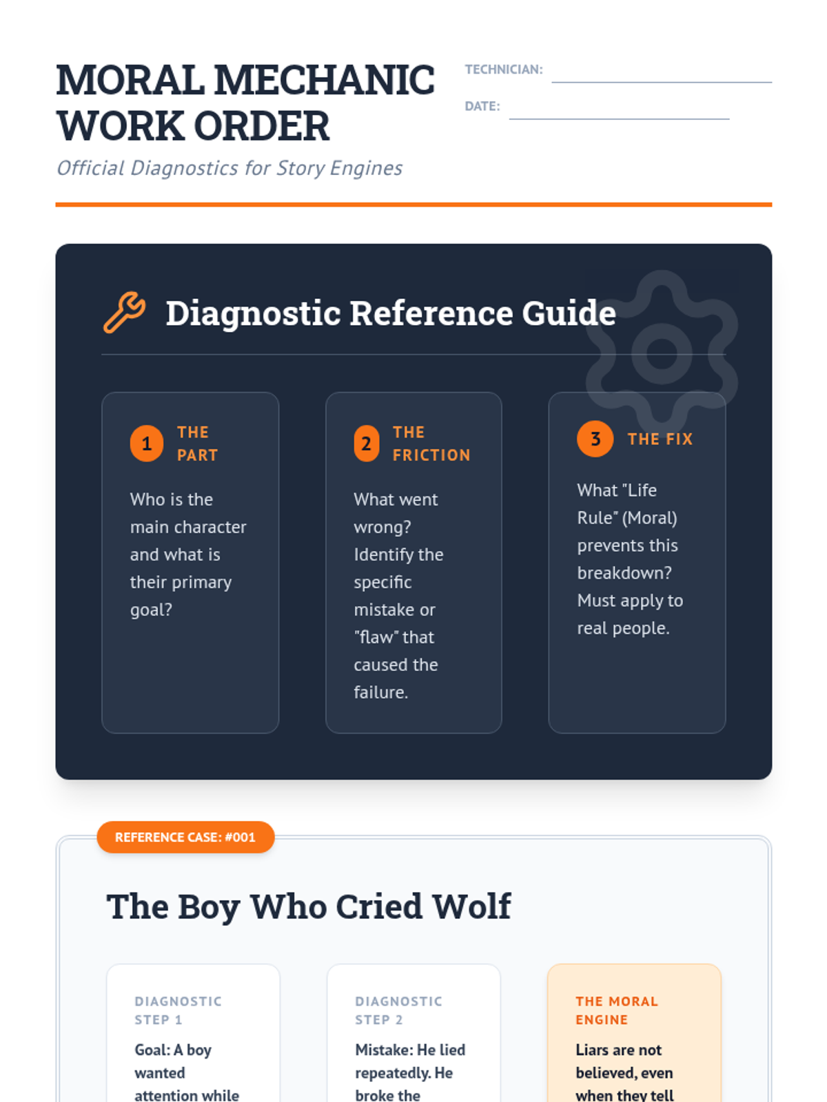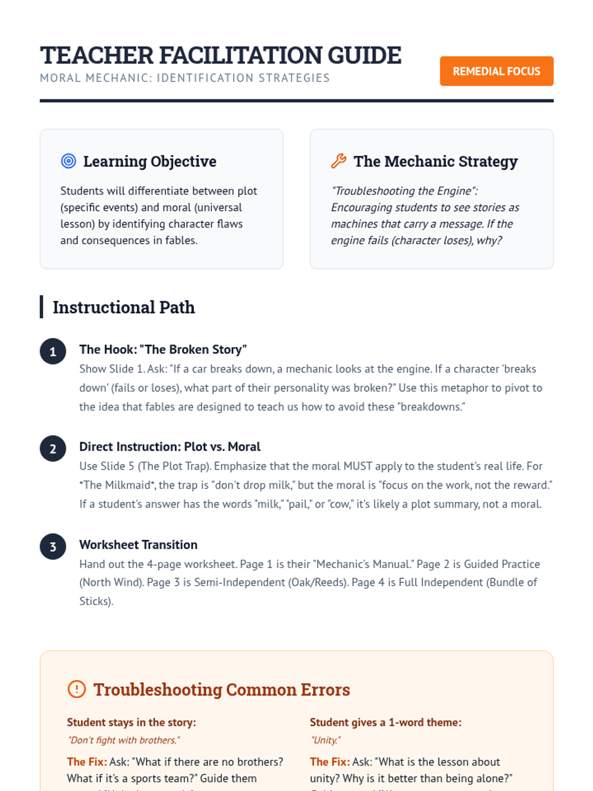 A remedial lesson focused on identifying themes and morals in fables using a 'Moral Mechanic' troubleshooting framework. Students learn to dismantle a story to find its underlying engine: the lesson learned.