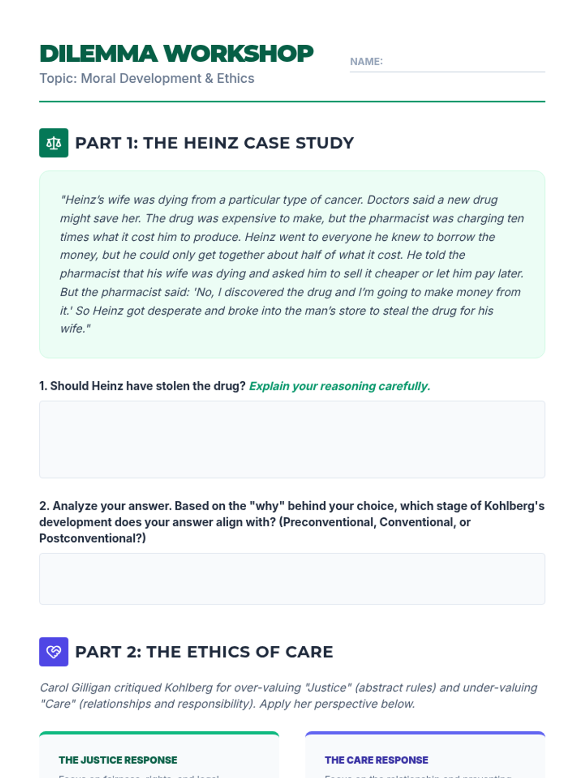 Students analyze moral development through Kohlberg's stages and critique theories using Gilligan's work.