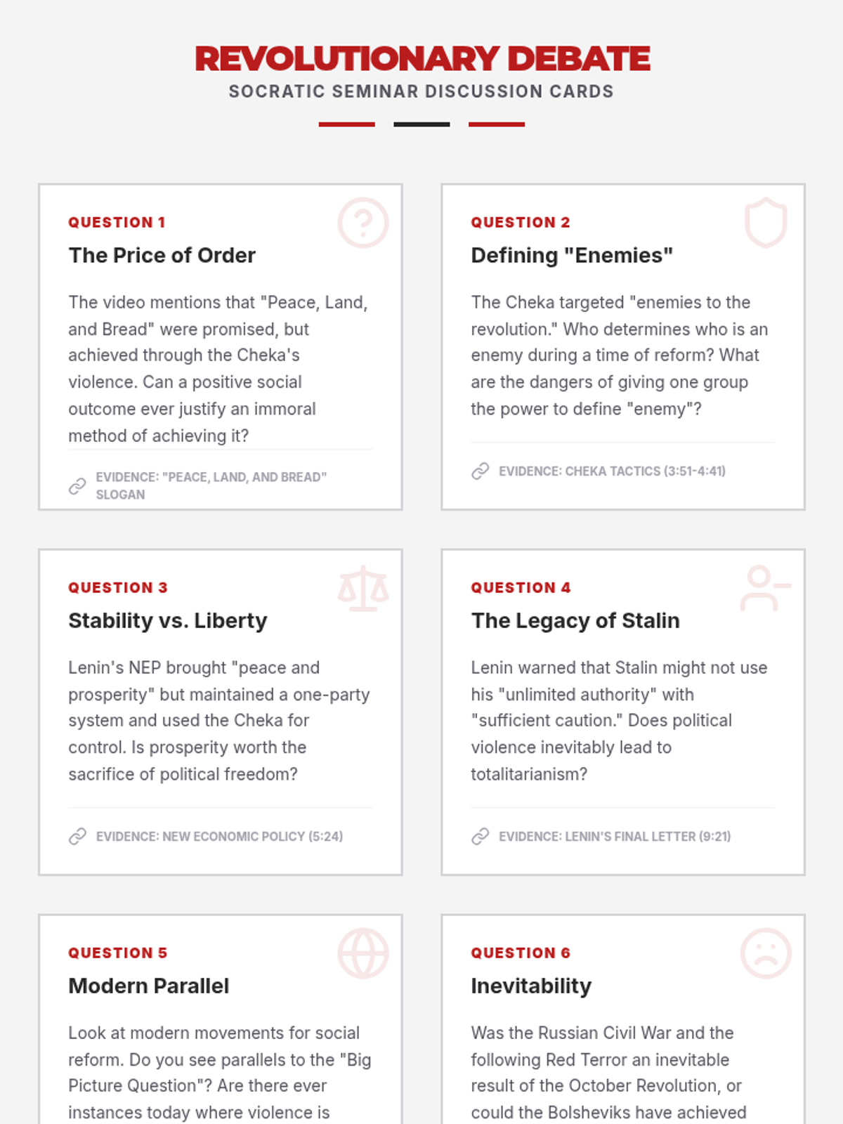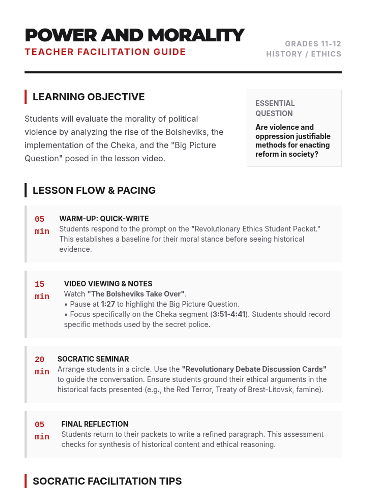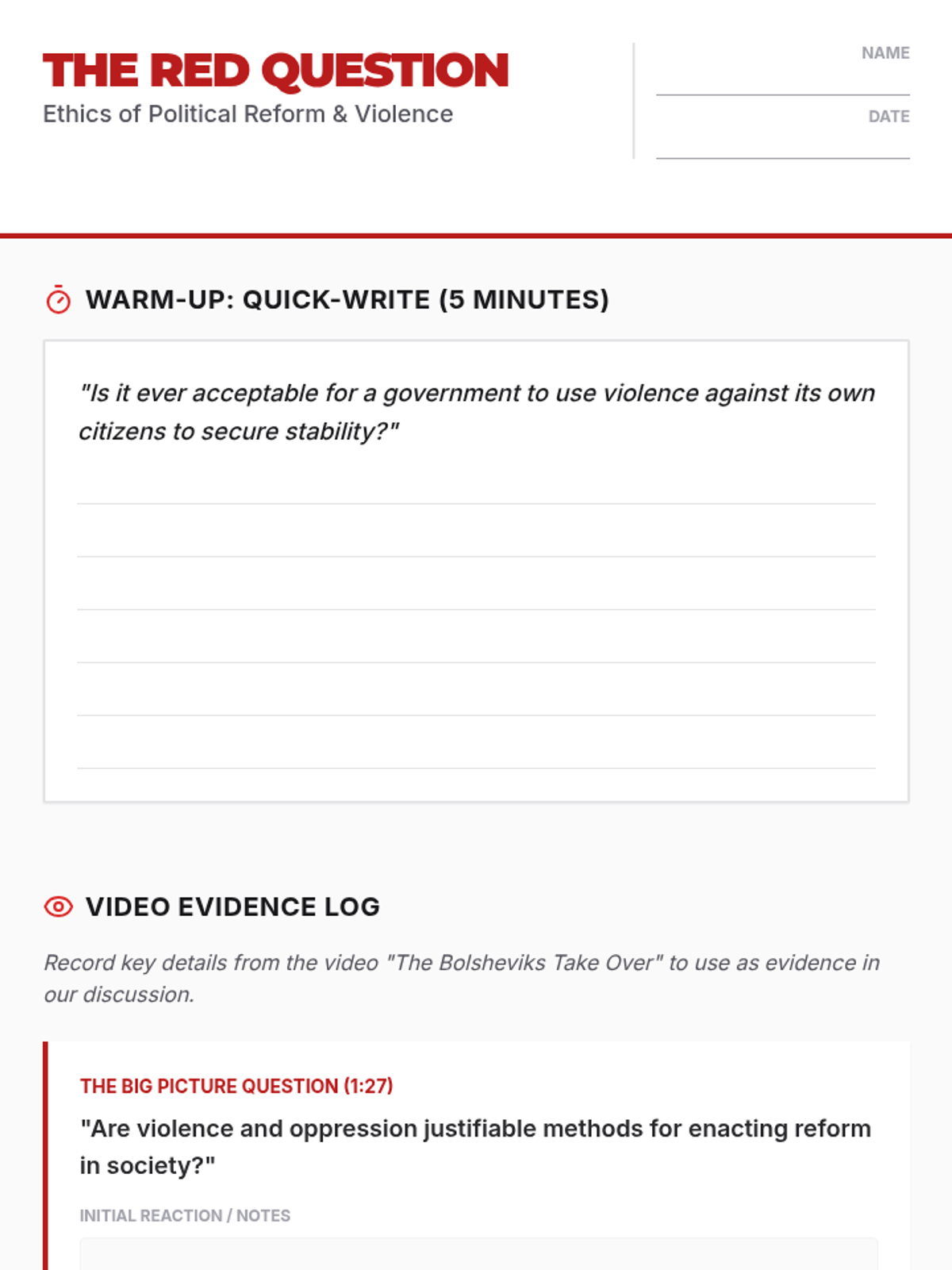 A high school history lesson exploring the morality of political violence during the rise of the Bolsheviks, centered on a Socratic Seminar and the 'Big Picture Question' of reform vs. oppression.