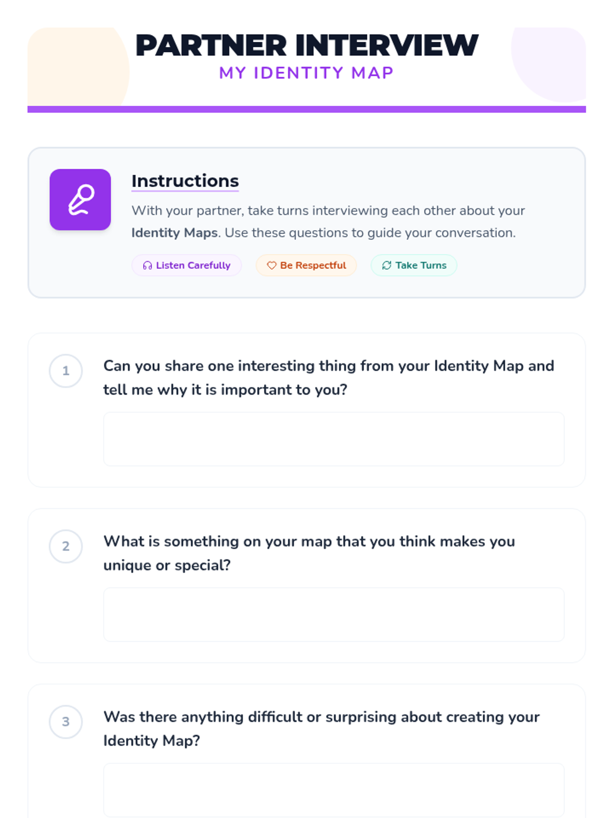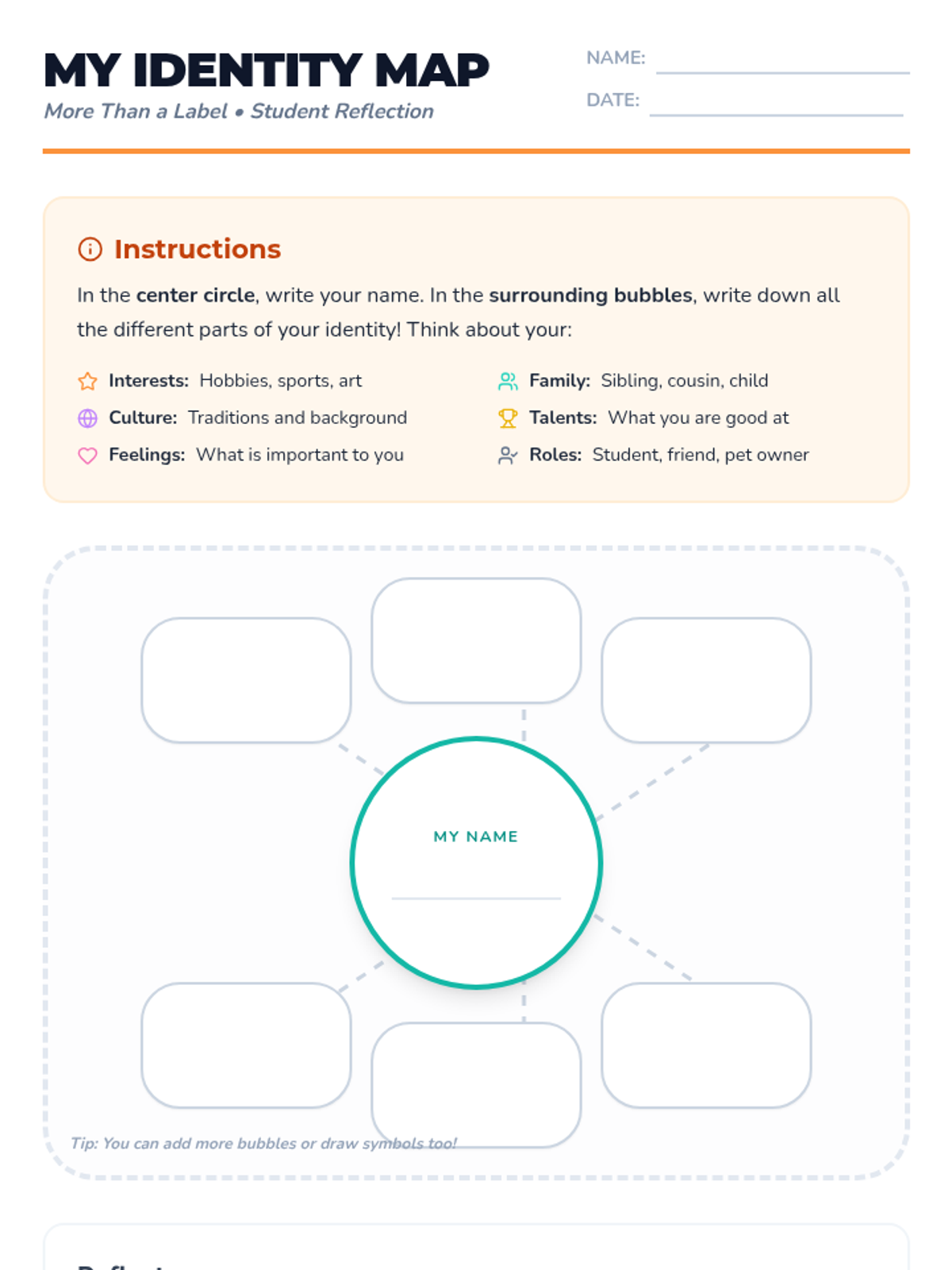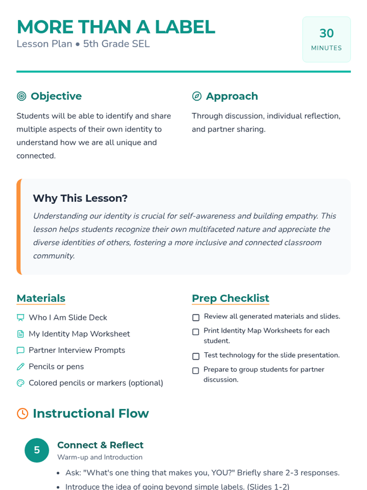 A 30-minute lesson for 5th-grade students exploring the multifaceted nature of identity through discussion, reflection, and creative mapping.