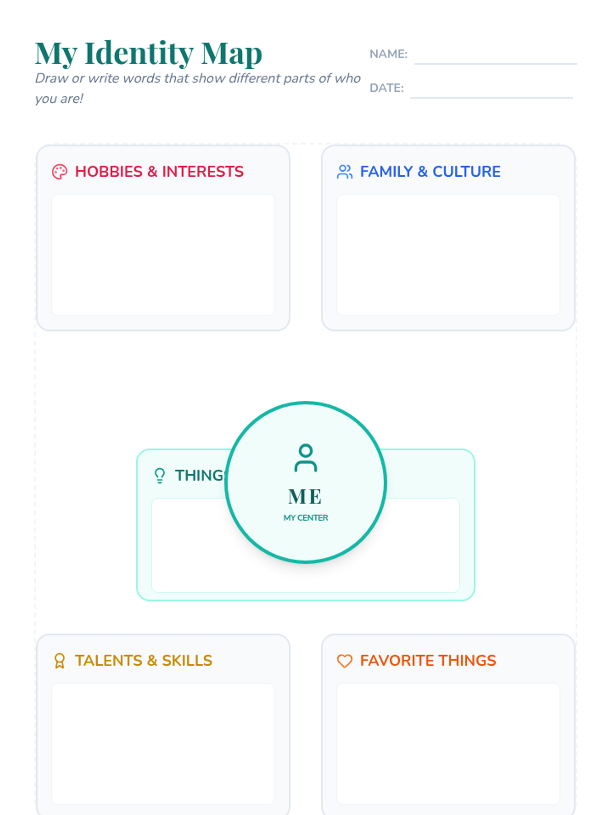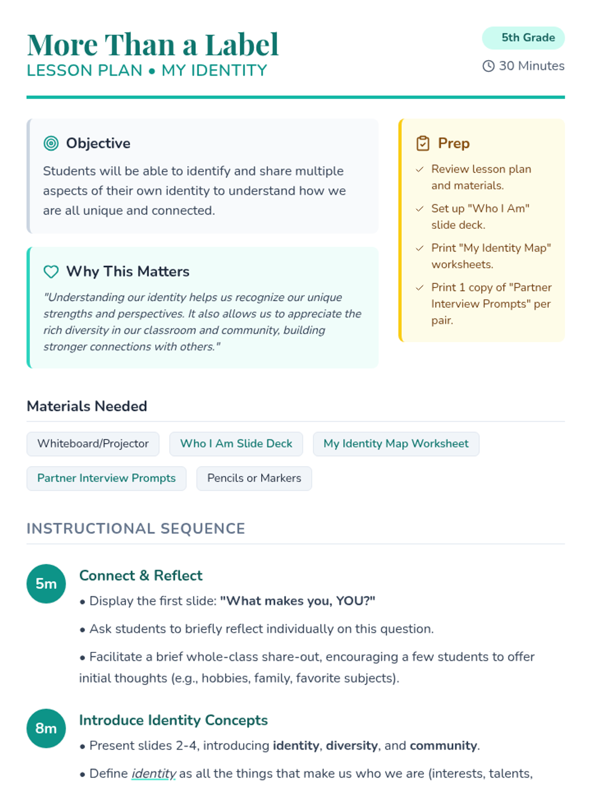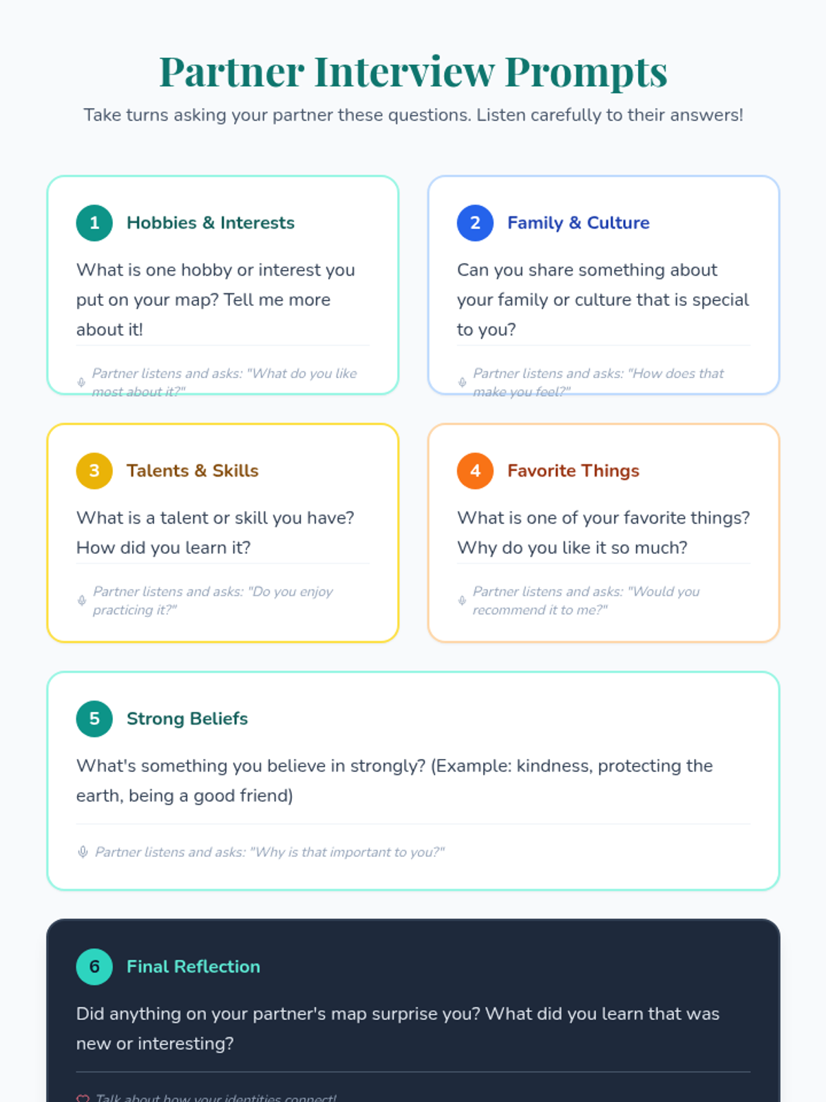 A 30-minute 5th-grade lesson exploring identity, diversity, and community through personal mapping and peer interviews.