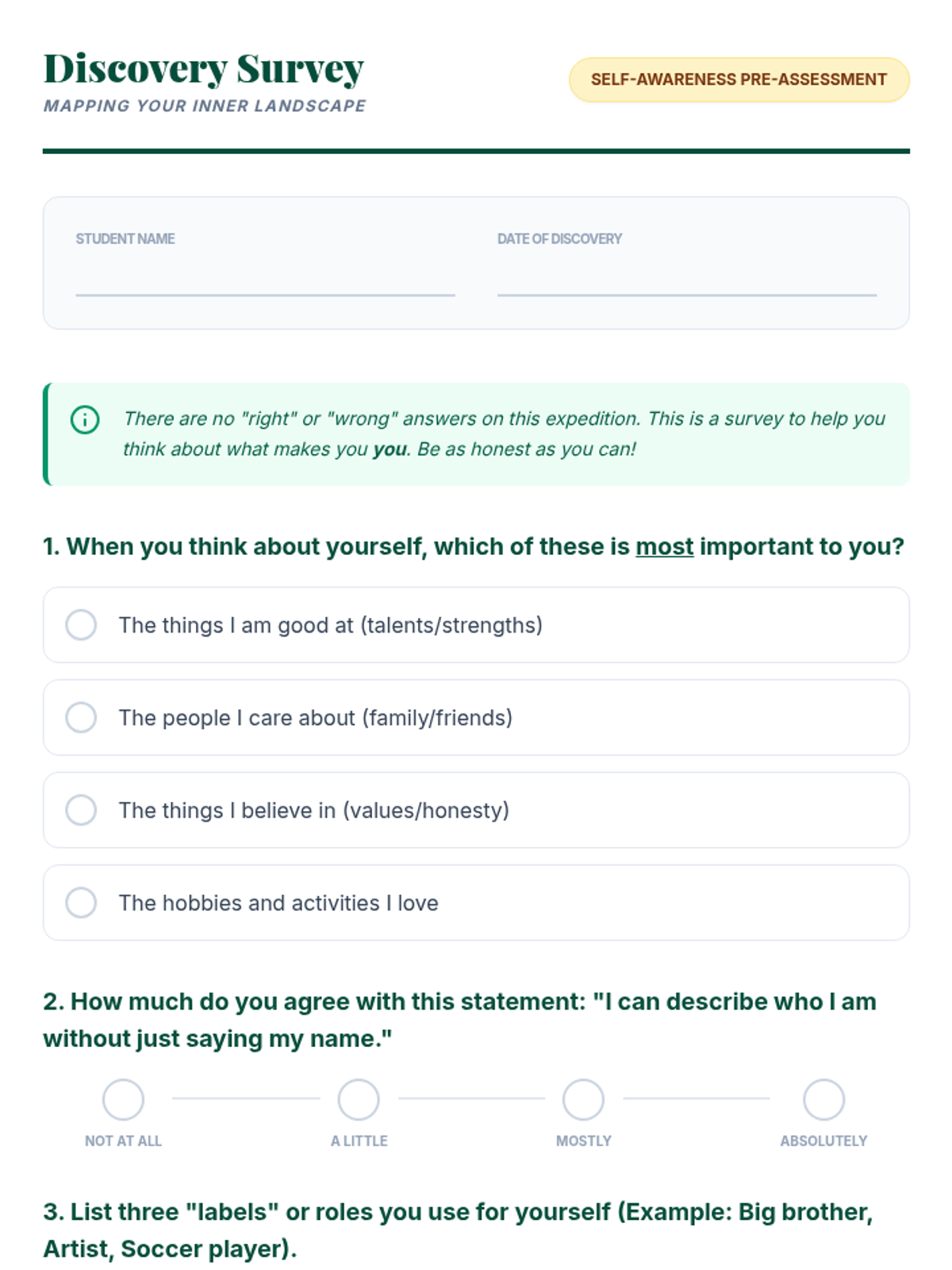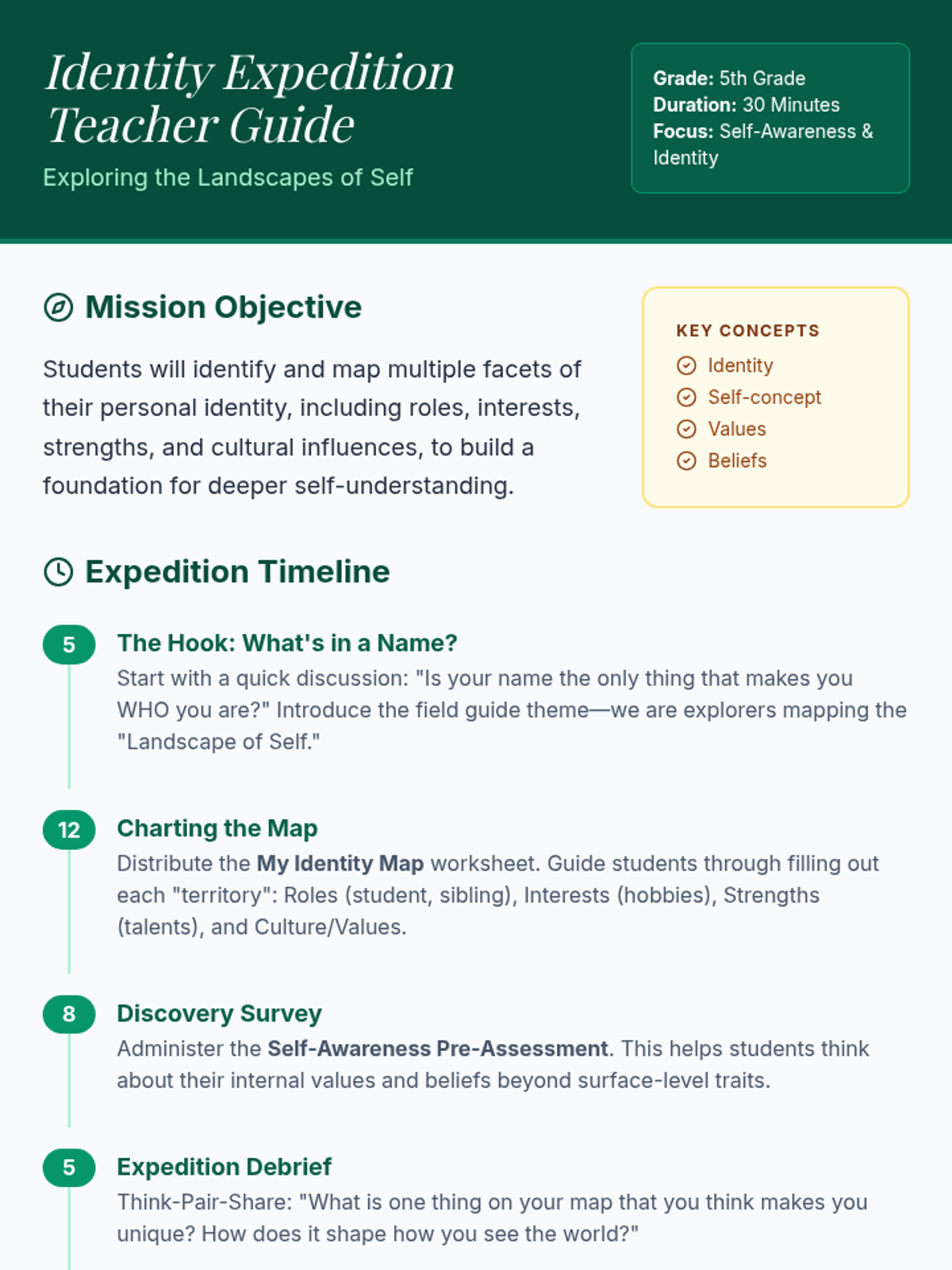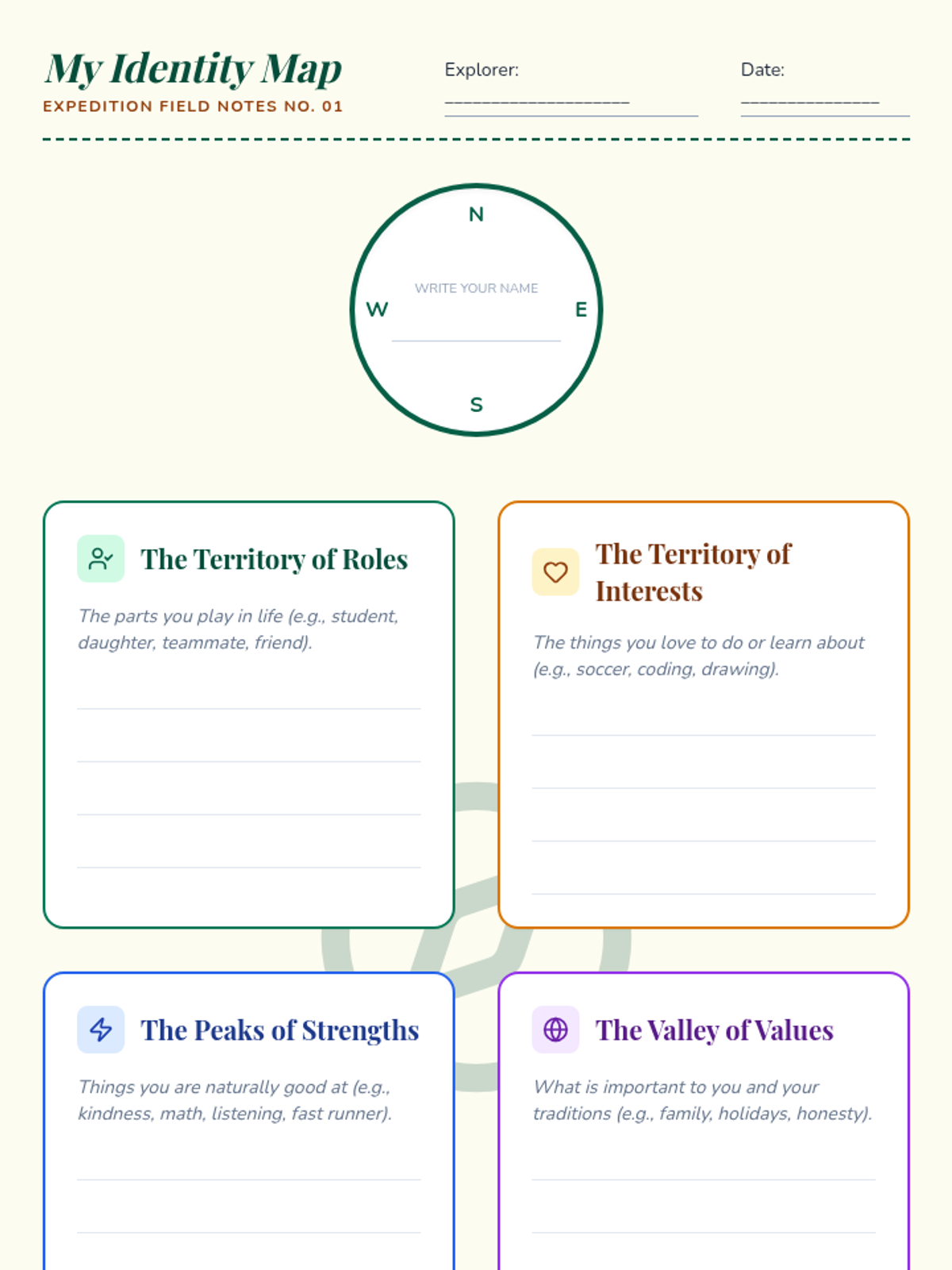 A 30-minute introductory lesson for 5th graders to explore the concept of personal identity through mapping their roles, interests, and culture. The lesson uses a field guide theme to encourage self-discovery and deeper self-awareness.
