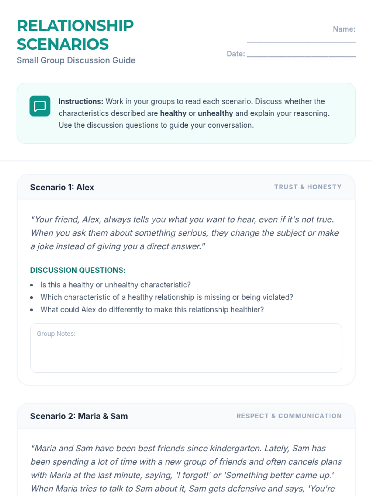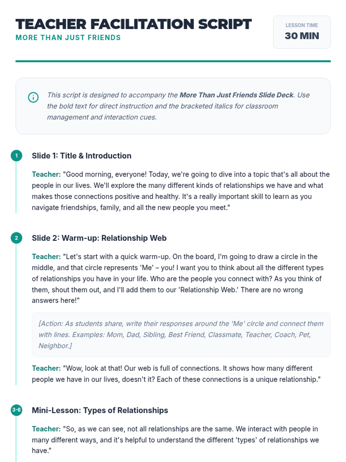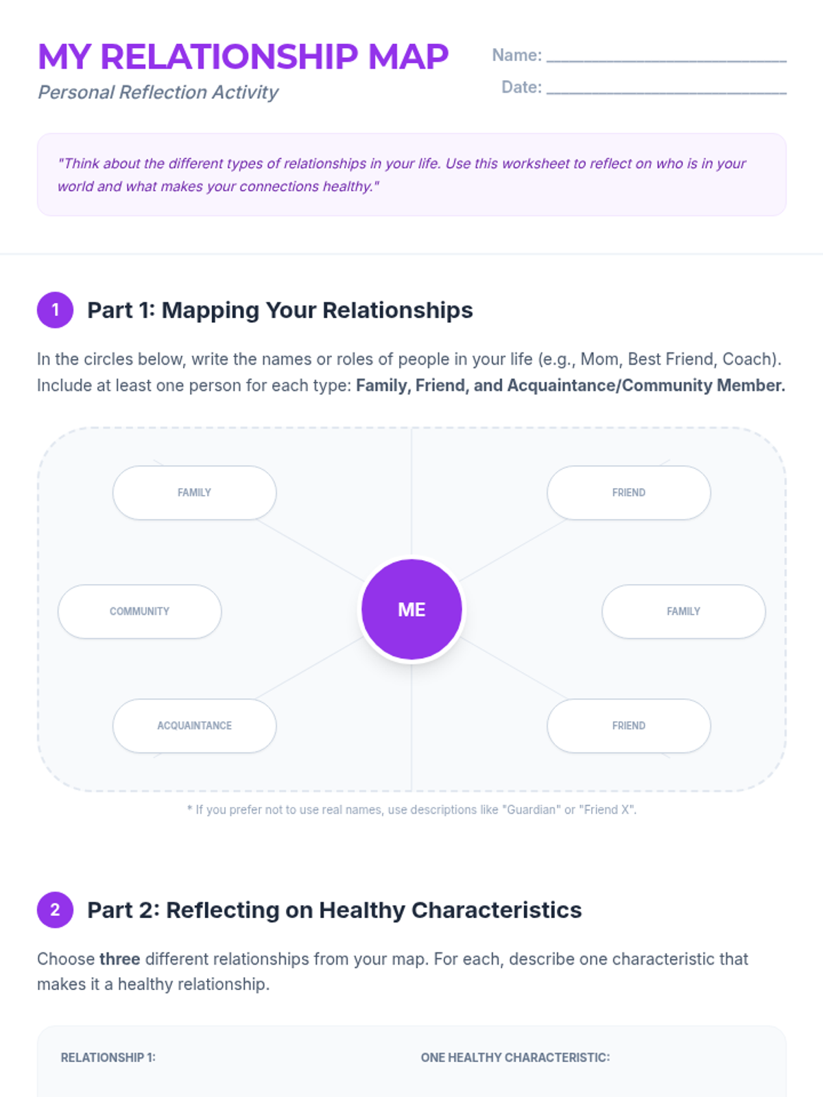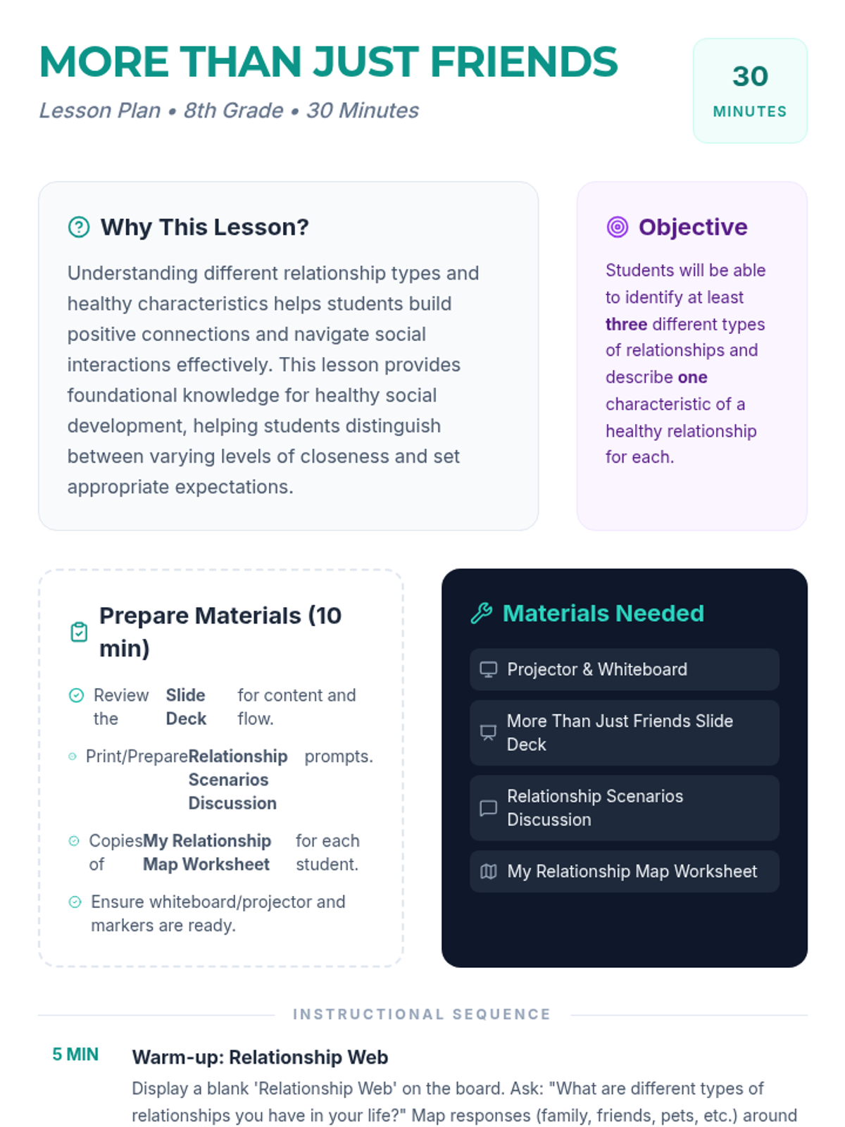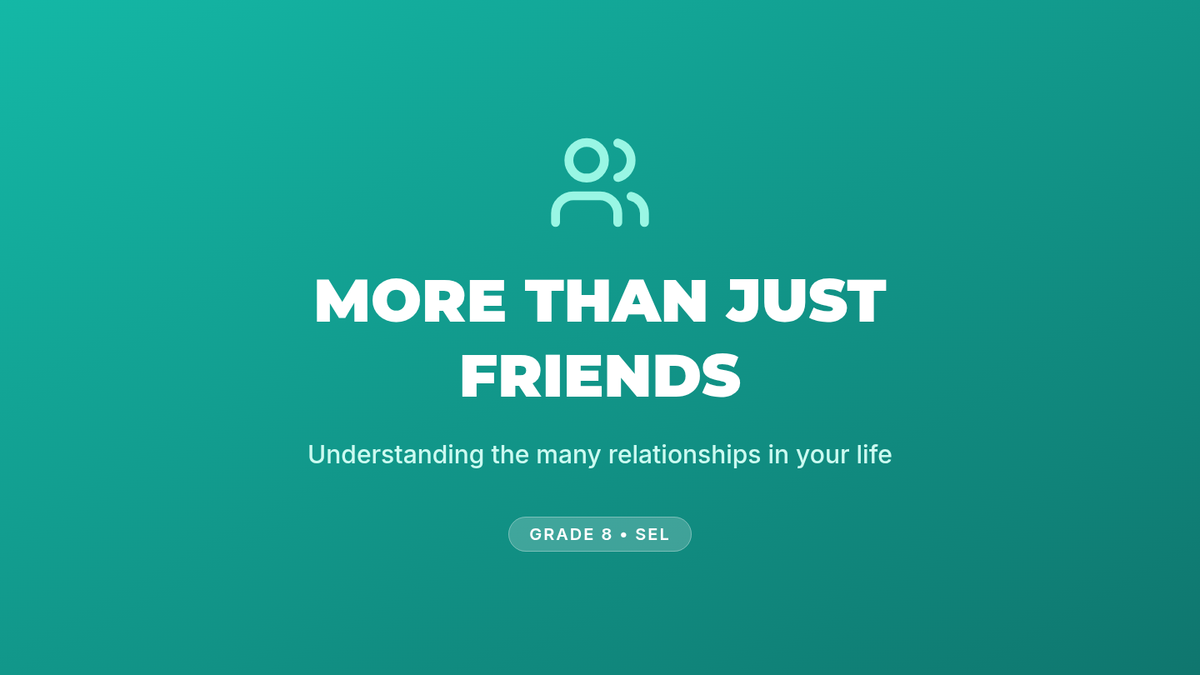 An interactive 30-minute lesson for 8th graders on identifying relationship types (family, friends, acquaintances) and the core characteristics of healthy connections like trust, respect, and communication.
