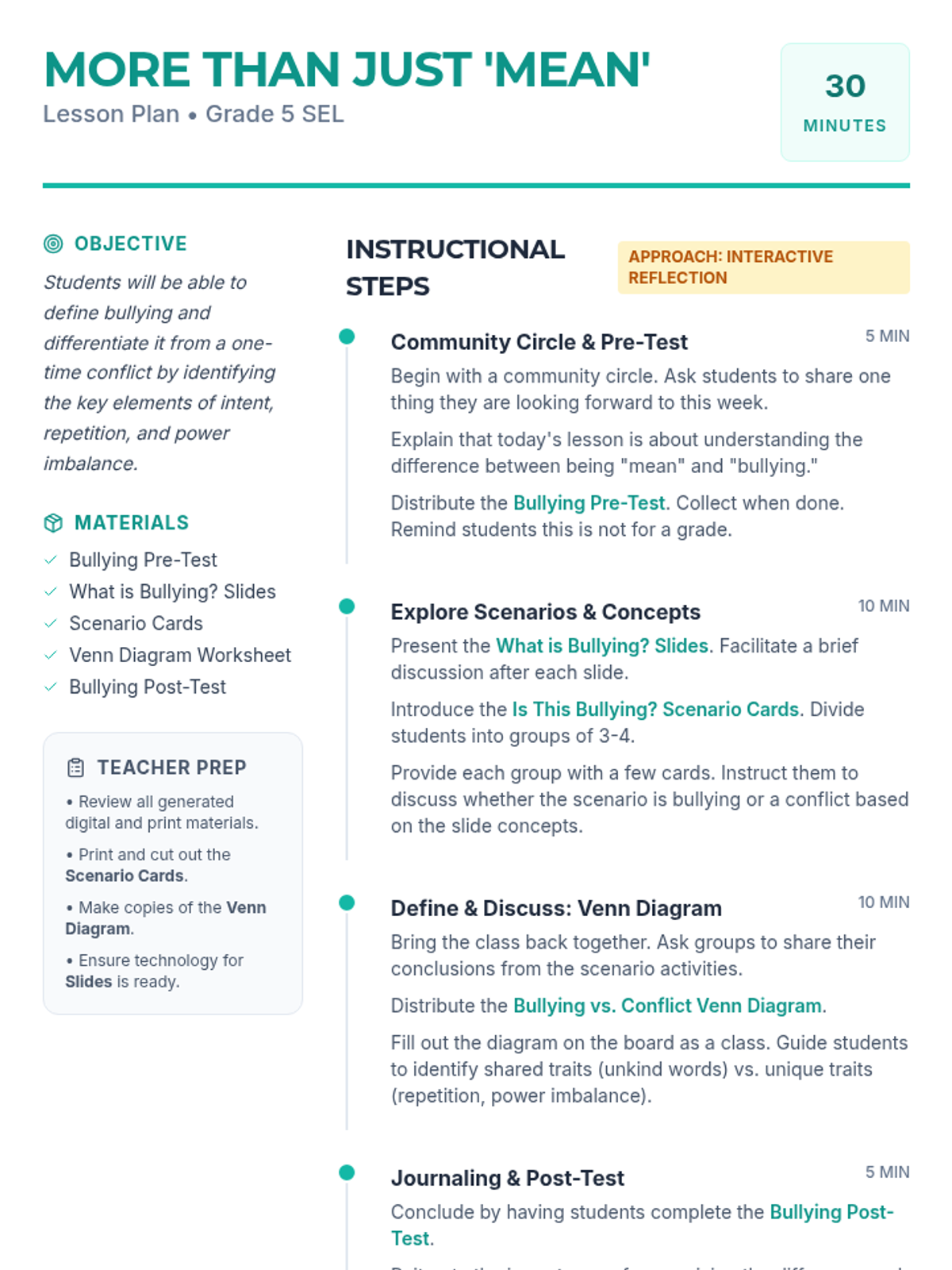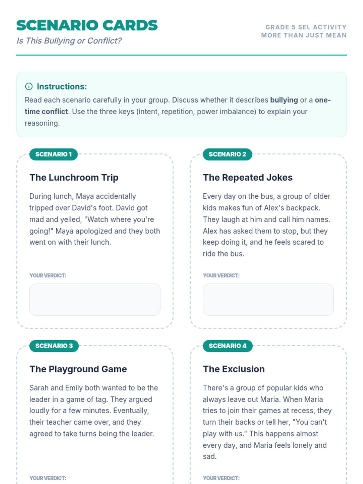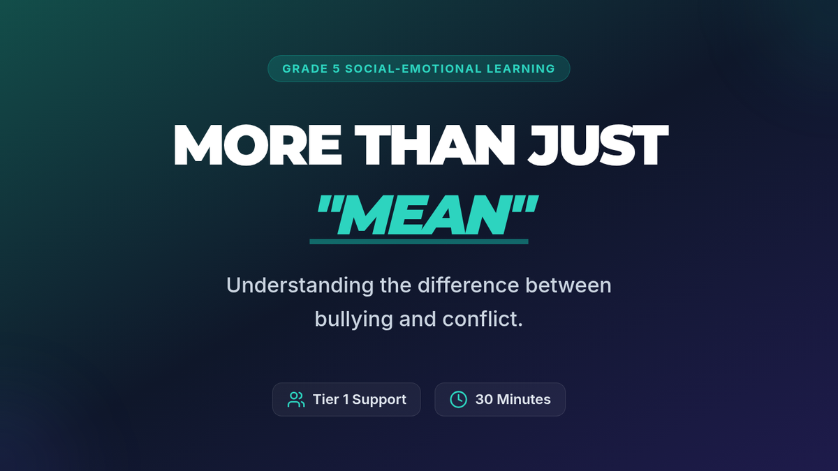 A 30-minute Social-Emotional Learning lesson for 5th graders that teaches the specific characteristics of bullying (intent, repetition, and power imbalance) versus one-time social conflicts.