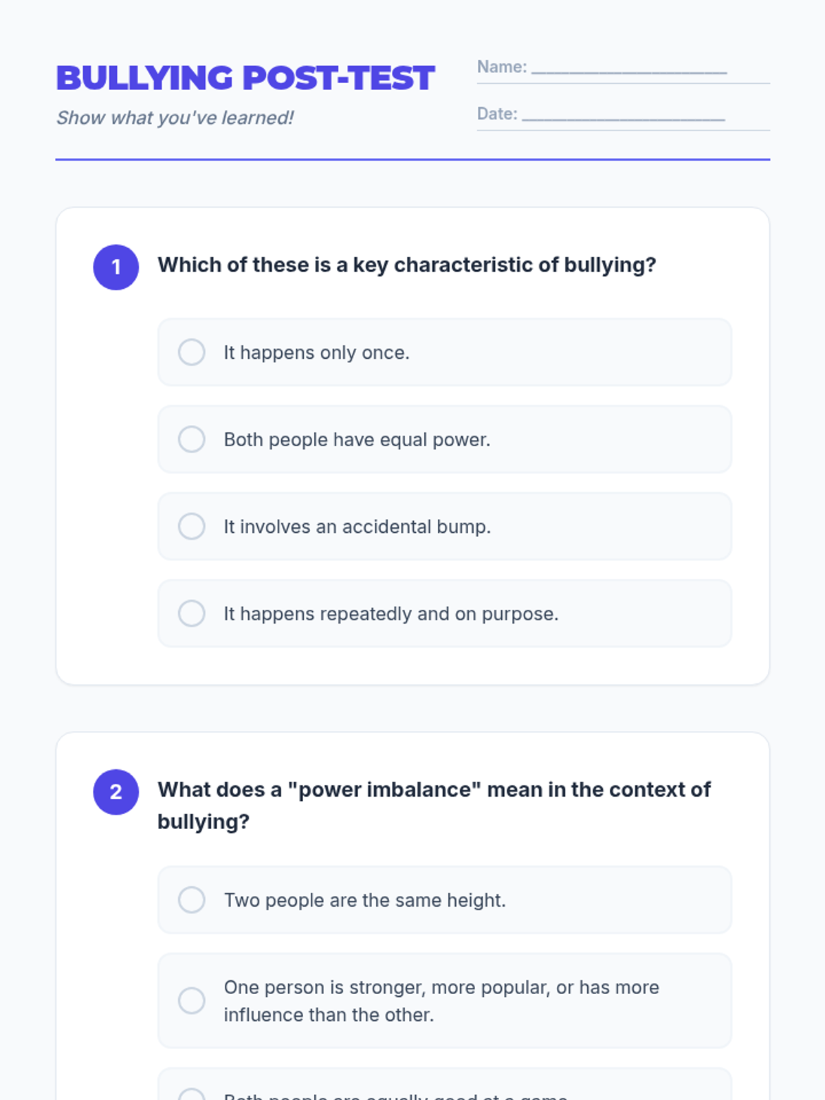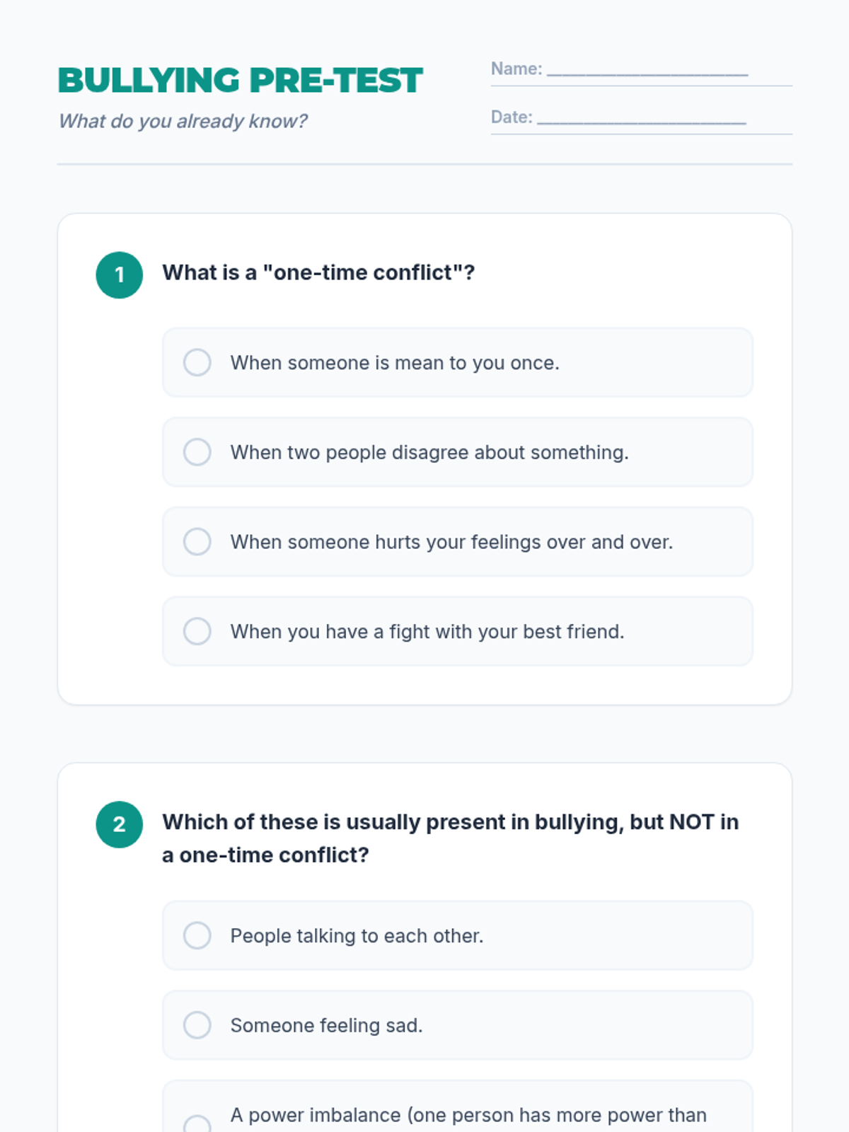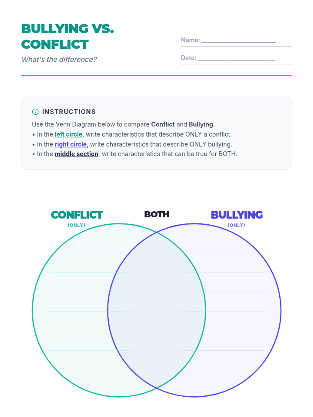 A 30-minute Social-Emotional Learning lesson for 5th graders that teaches the specific characteristics of bullying (intent, repetition, and power imbalance) versus one-time social conflicts.