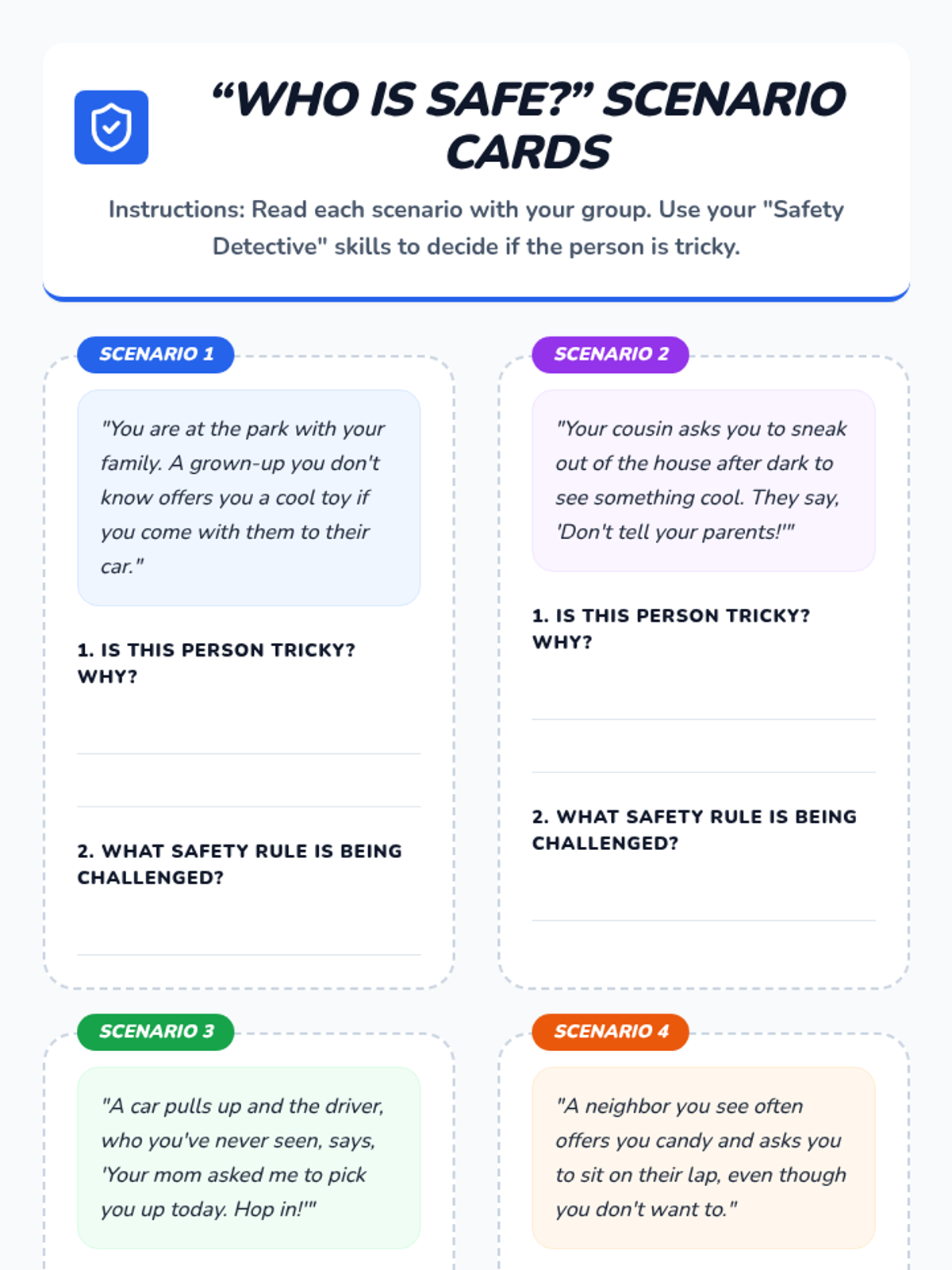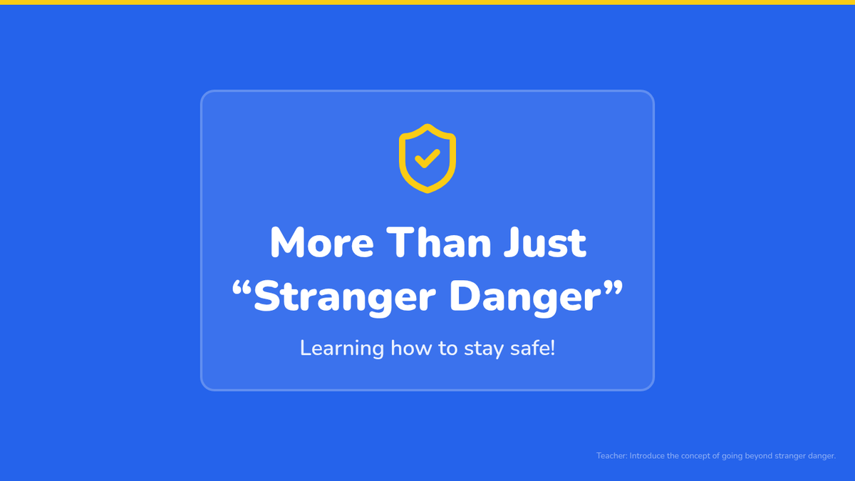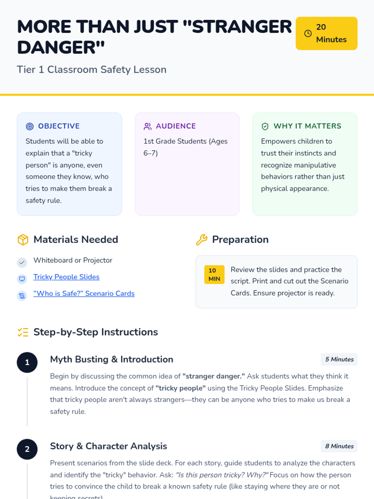 This 20-minute lesson for 1st Grade students introduces the concept of 'tricky people' to help them identify unsafe situations even with familiar individuals, moving beyond the limited concept of 'stranger danger'.