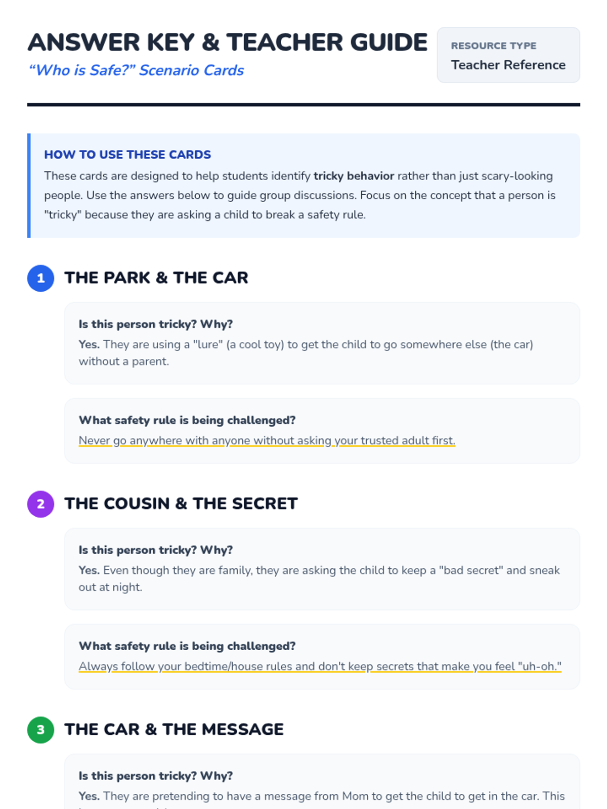 A lesson designed to teach children how to recognize common tricks used by strangers and how to respond safely.
