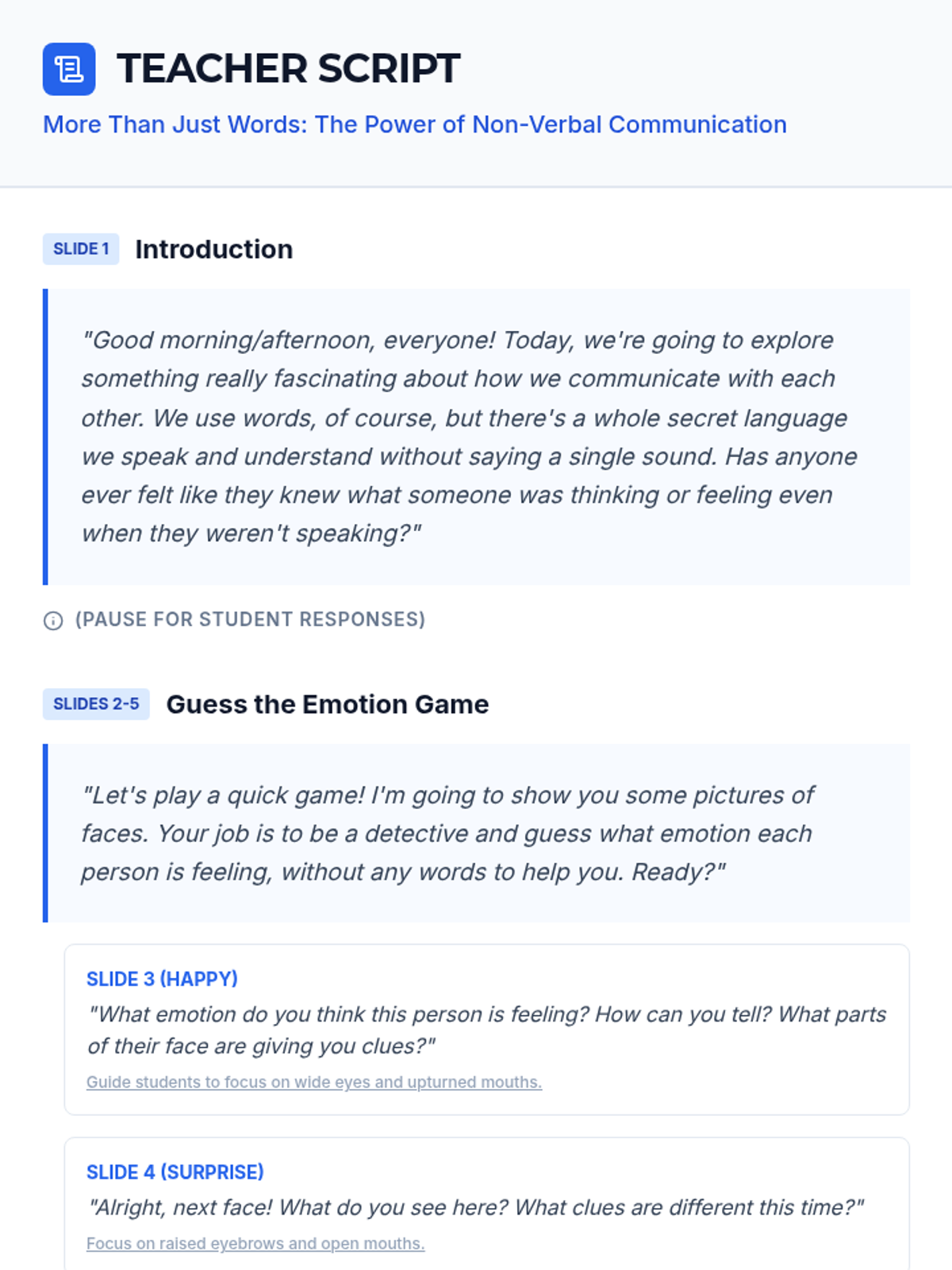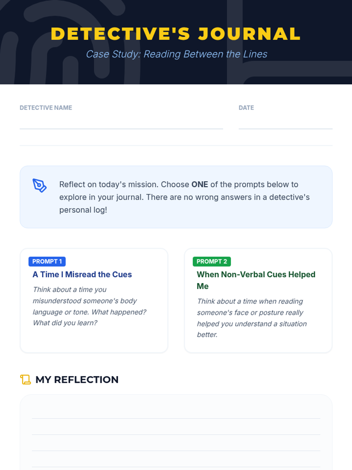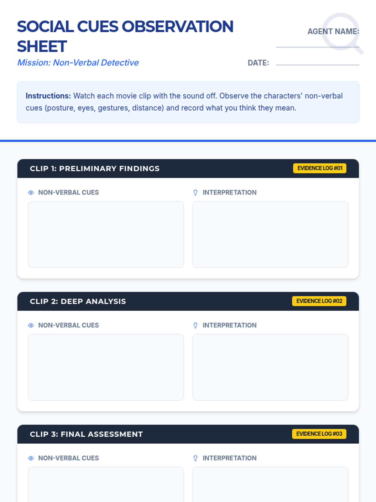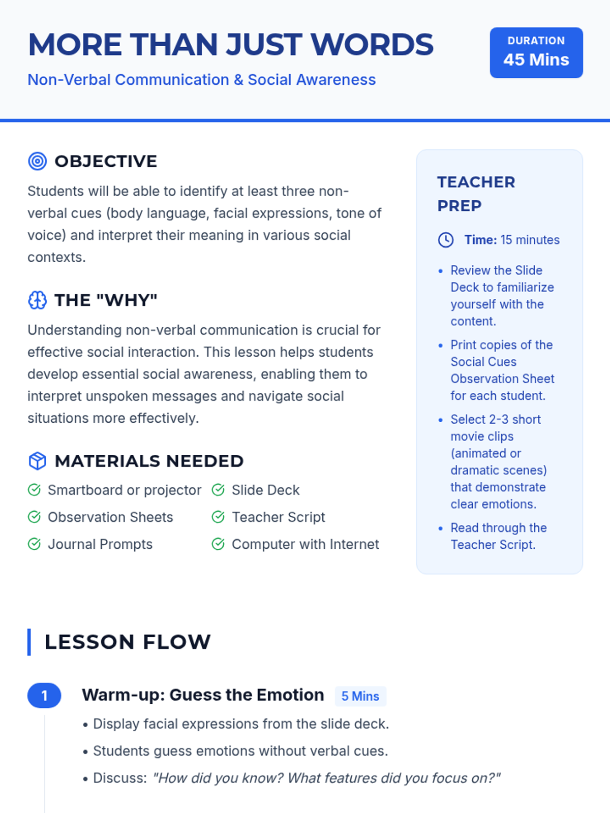 A 45-minute social-emotional learning lesson for 6th graders that explores the power of non-verbal communication, including body language, facial expressions, and tone of voice. Students act as 'non-verbal detectives' to observe and interpret social cues in movie clips and real-life scenarios.