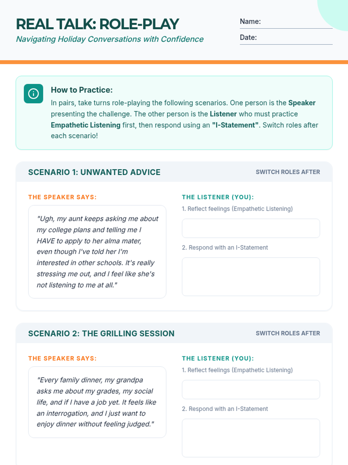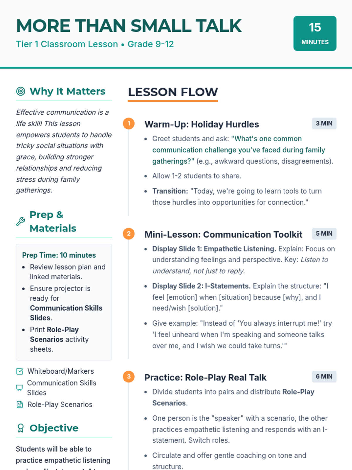 A 15-minute lesson for 9th-12th grade students to develop empathetic listening and I-statement skills for navigating holiday conversations.