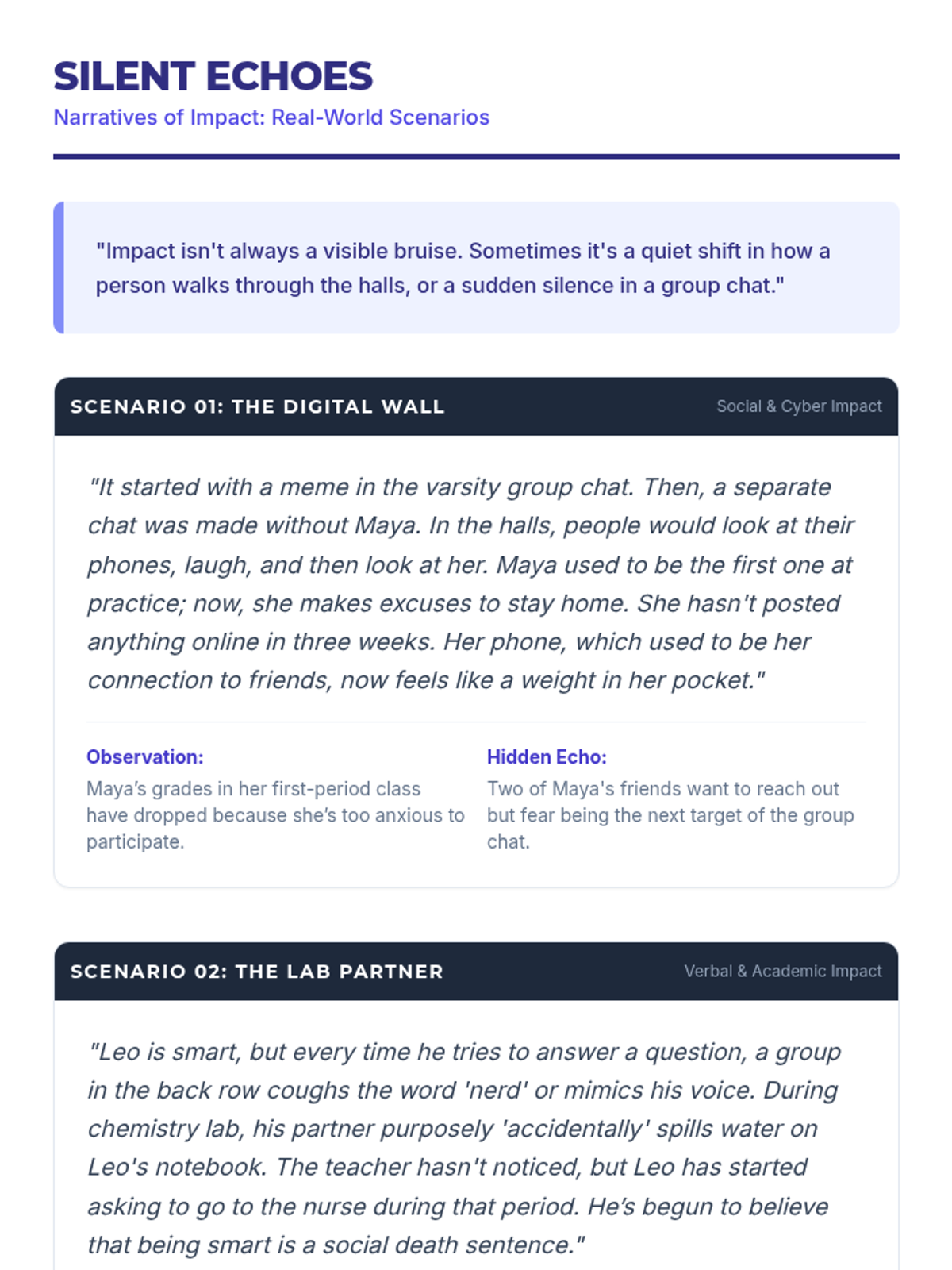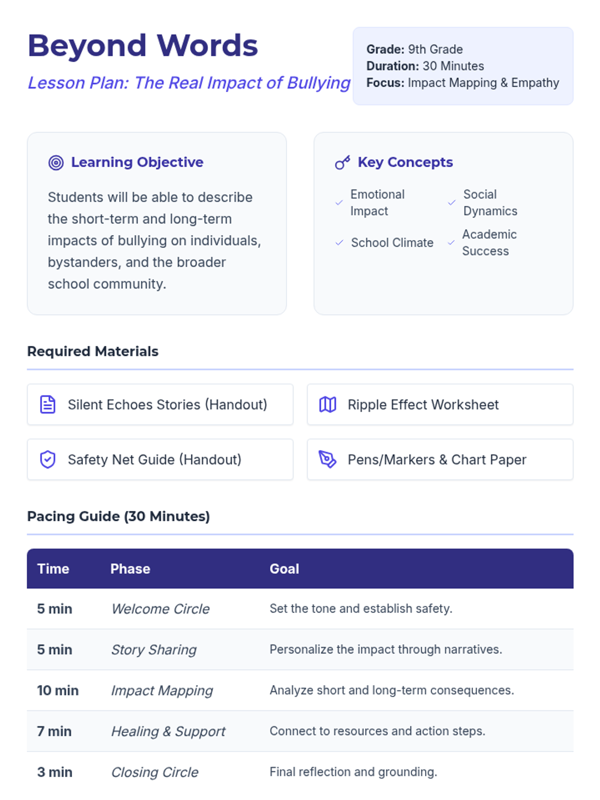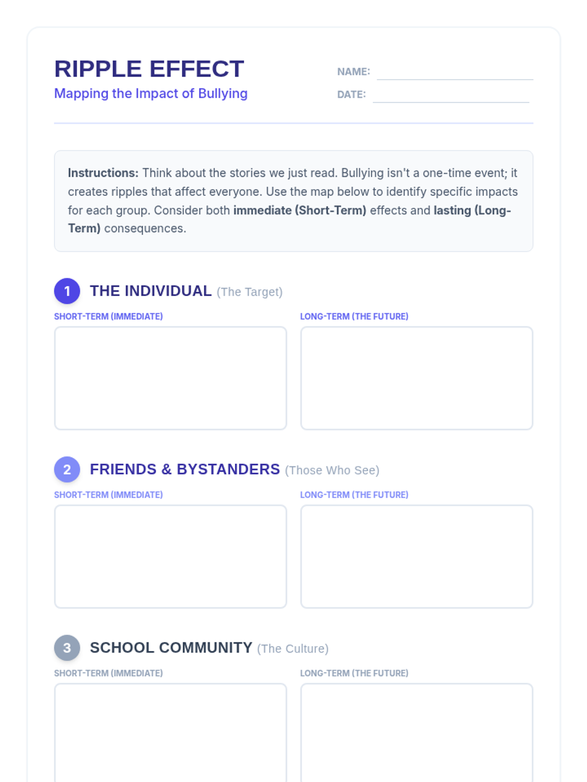 A 30-minute social-emotional learning lesson for 9th graders exploring the deep, multifaceted impacts of bullying on individuals and school culture through storytelling and impact mapping.