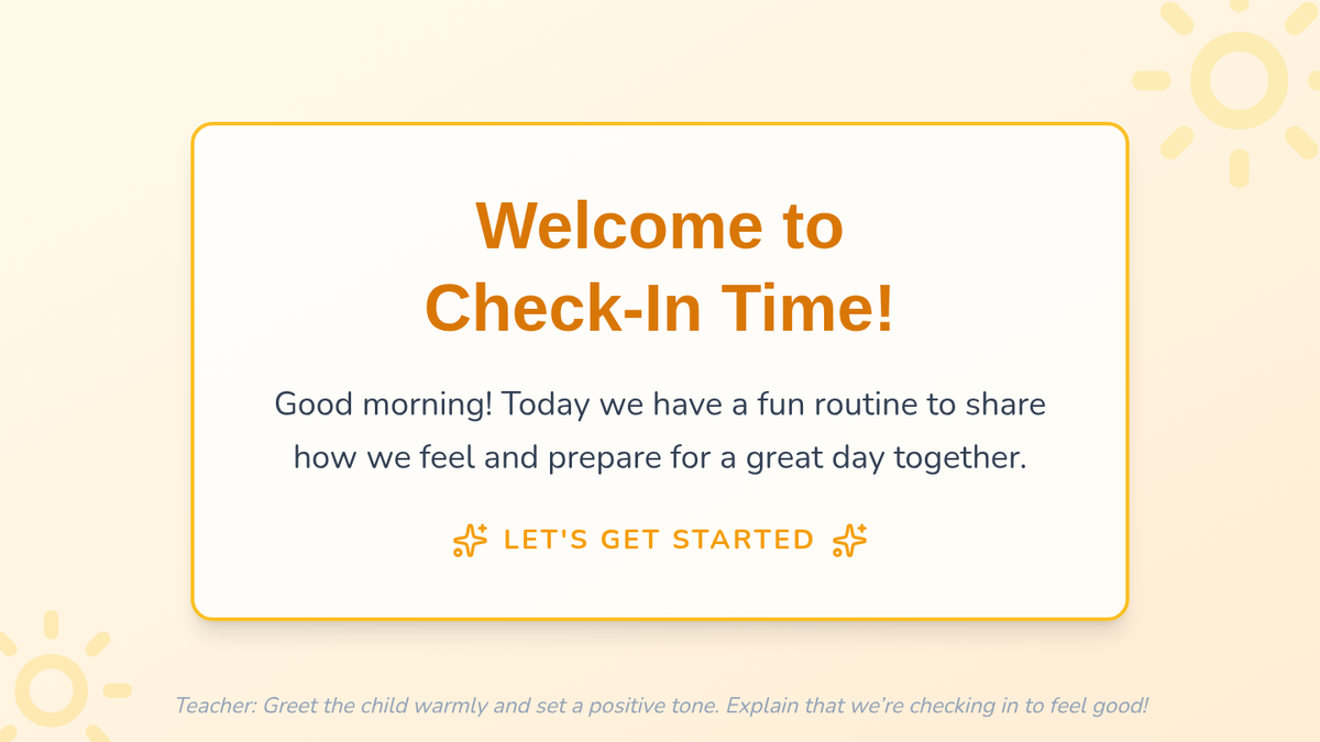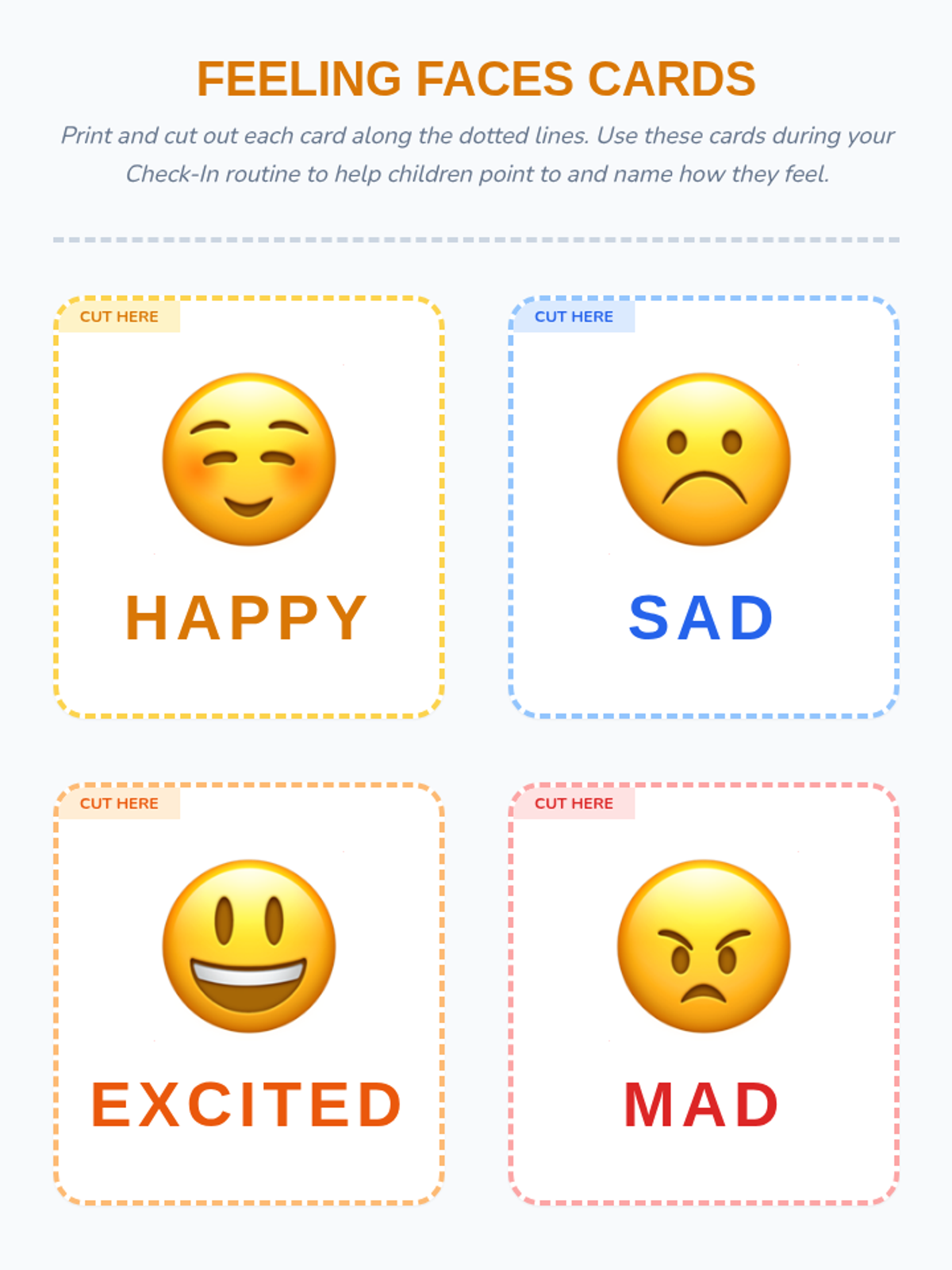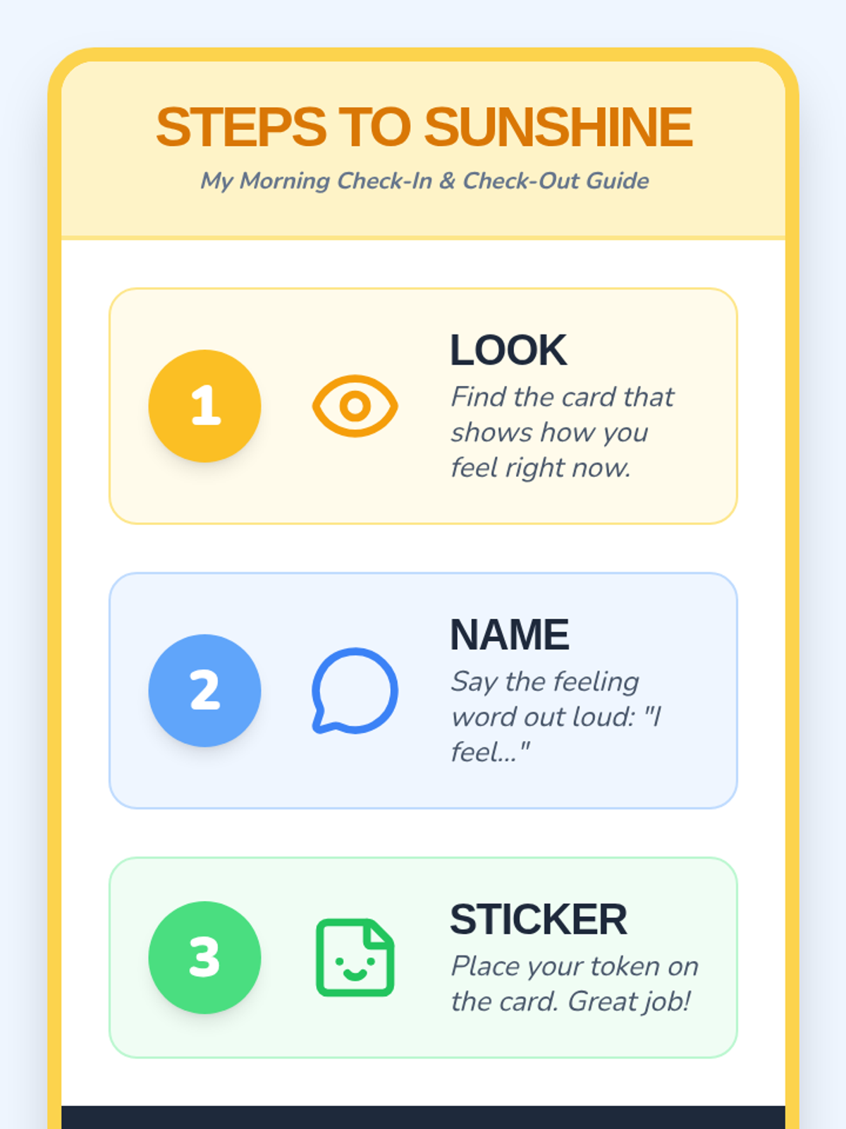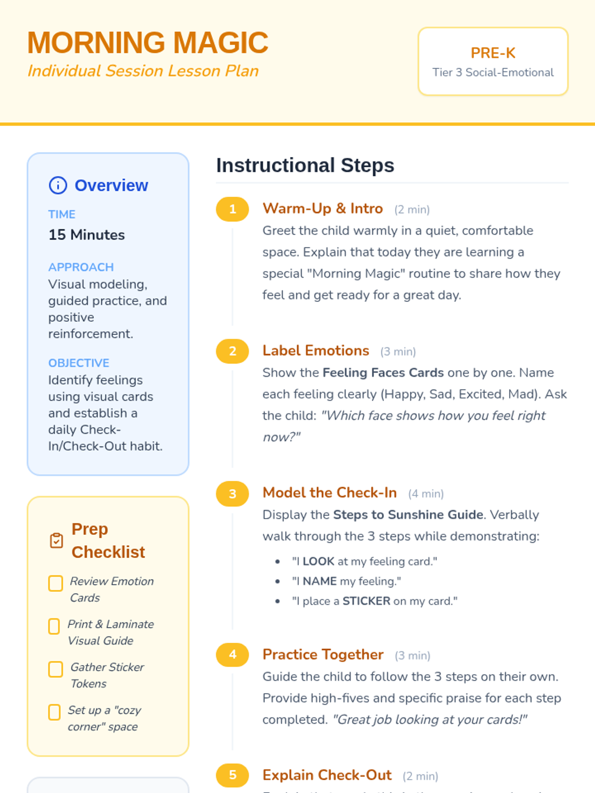 A 15-minute Tier 3 intervention for Pre-K students to build self-awareness and emotional regulation through a structured Check-In/Check-Out routine. Students use visual emotion cards and sticker tokens to identify and share their feelings at the start and end of the day.