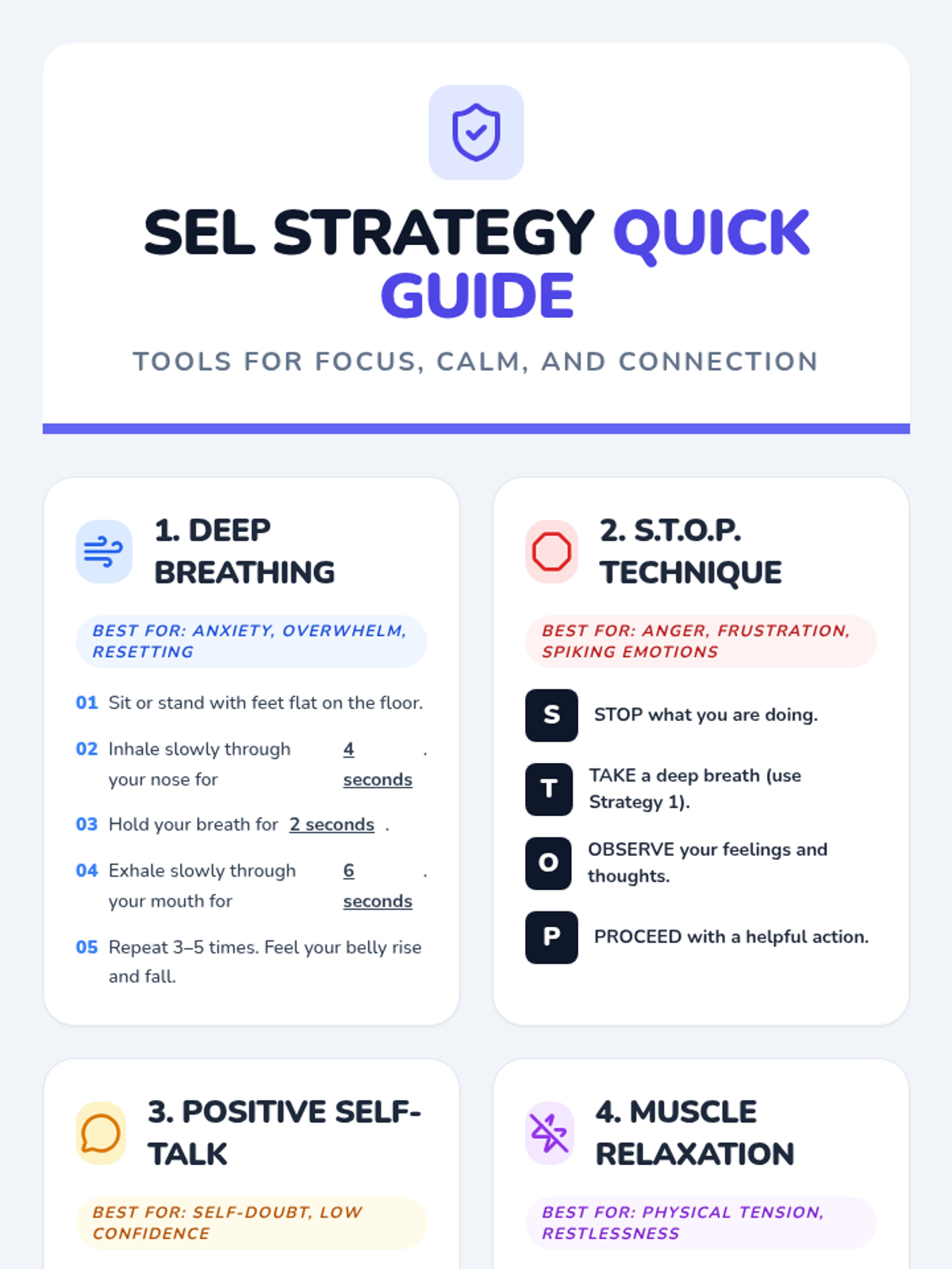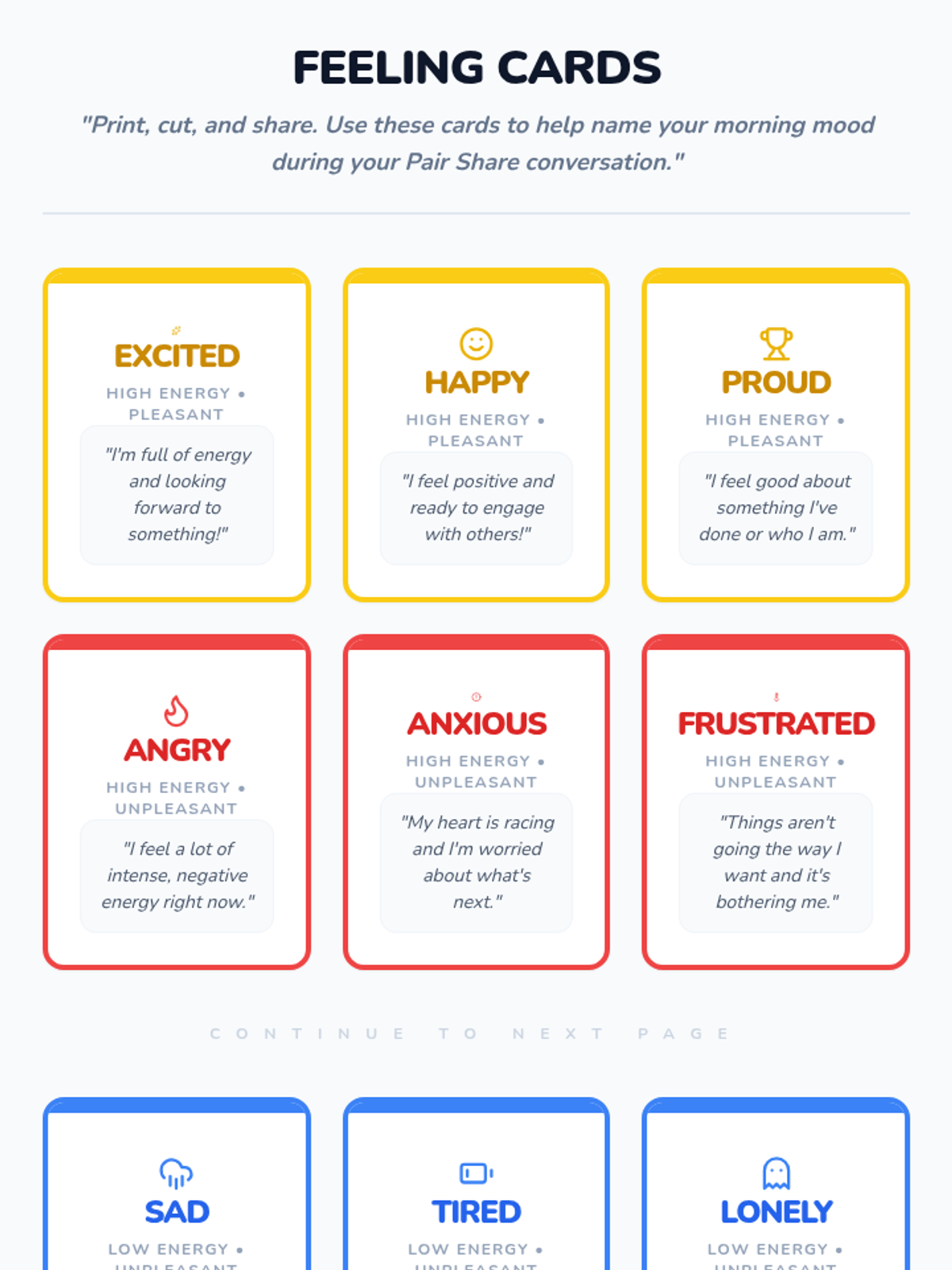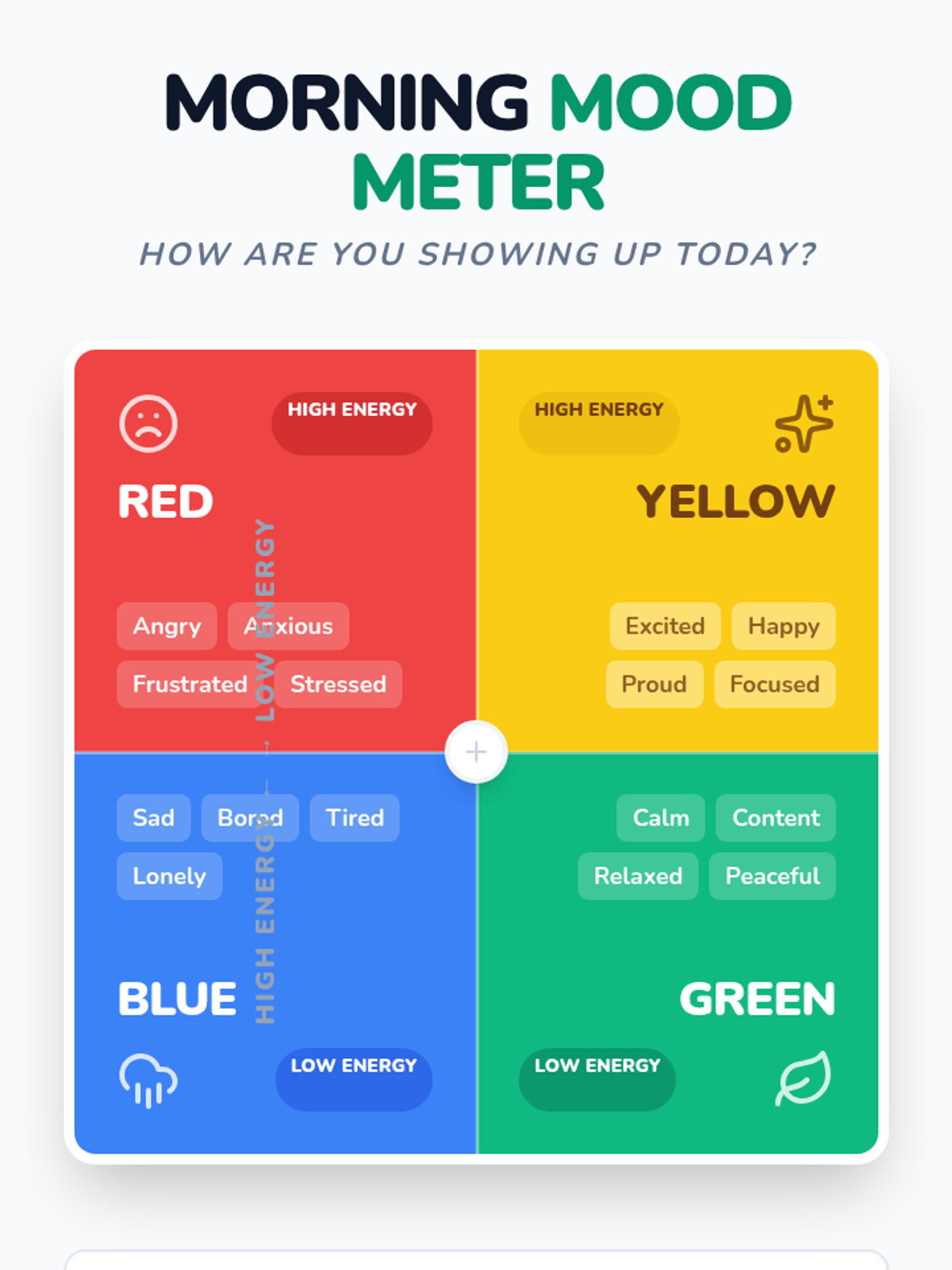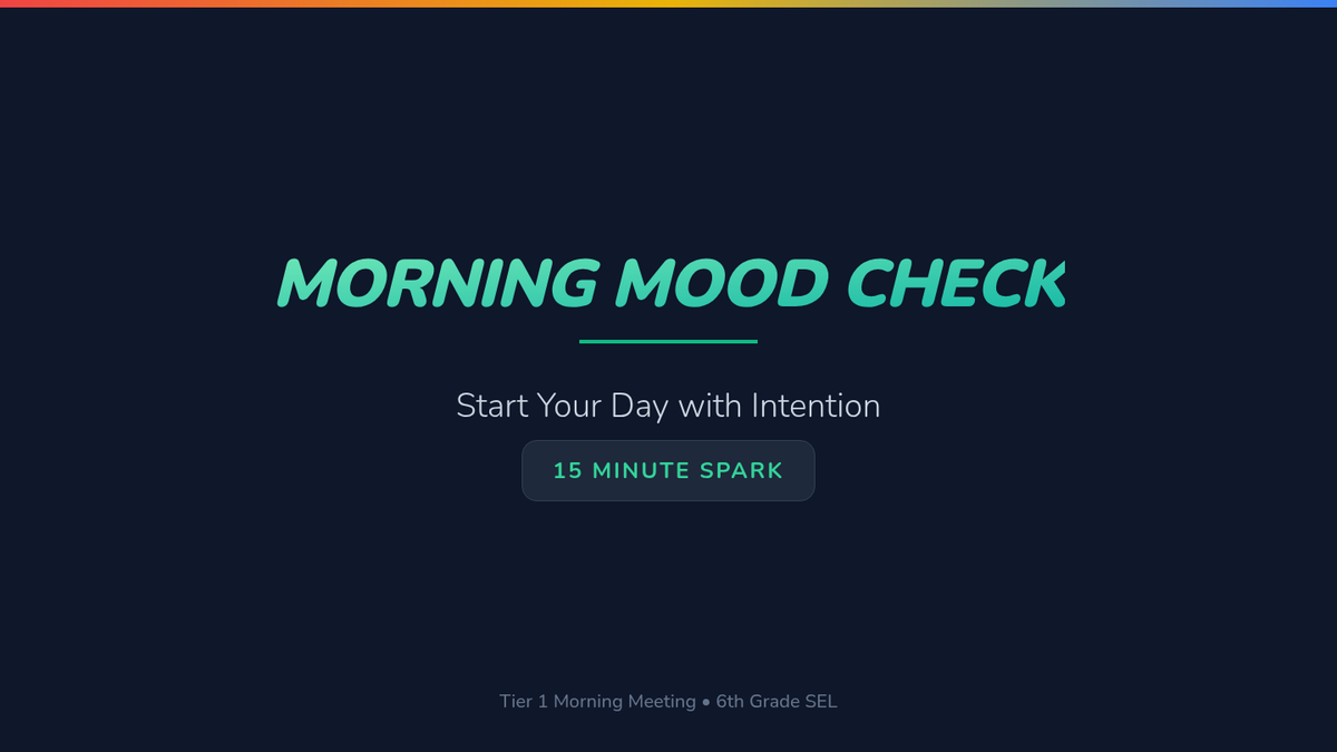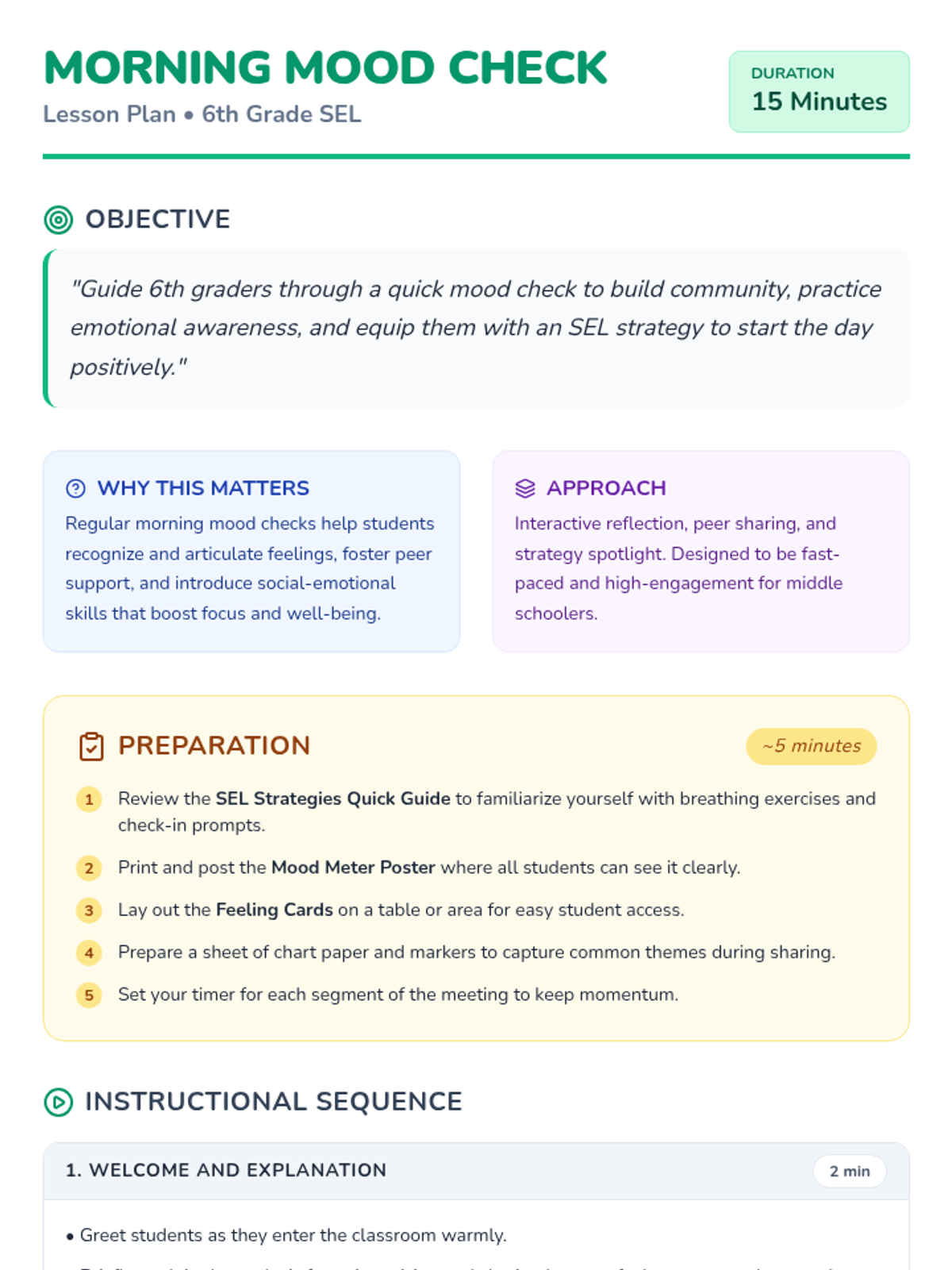 In this 15-minute Tier 1 morning meeting for 6th graders, students will learn to identify and share emotions, practice empathy, and set positive intentions for the day. Building social-emotional skills promotes a supportive classroom community and boosts student well-being.