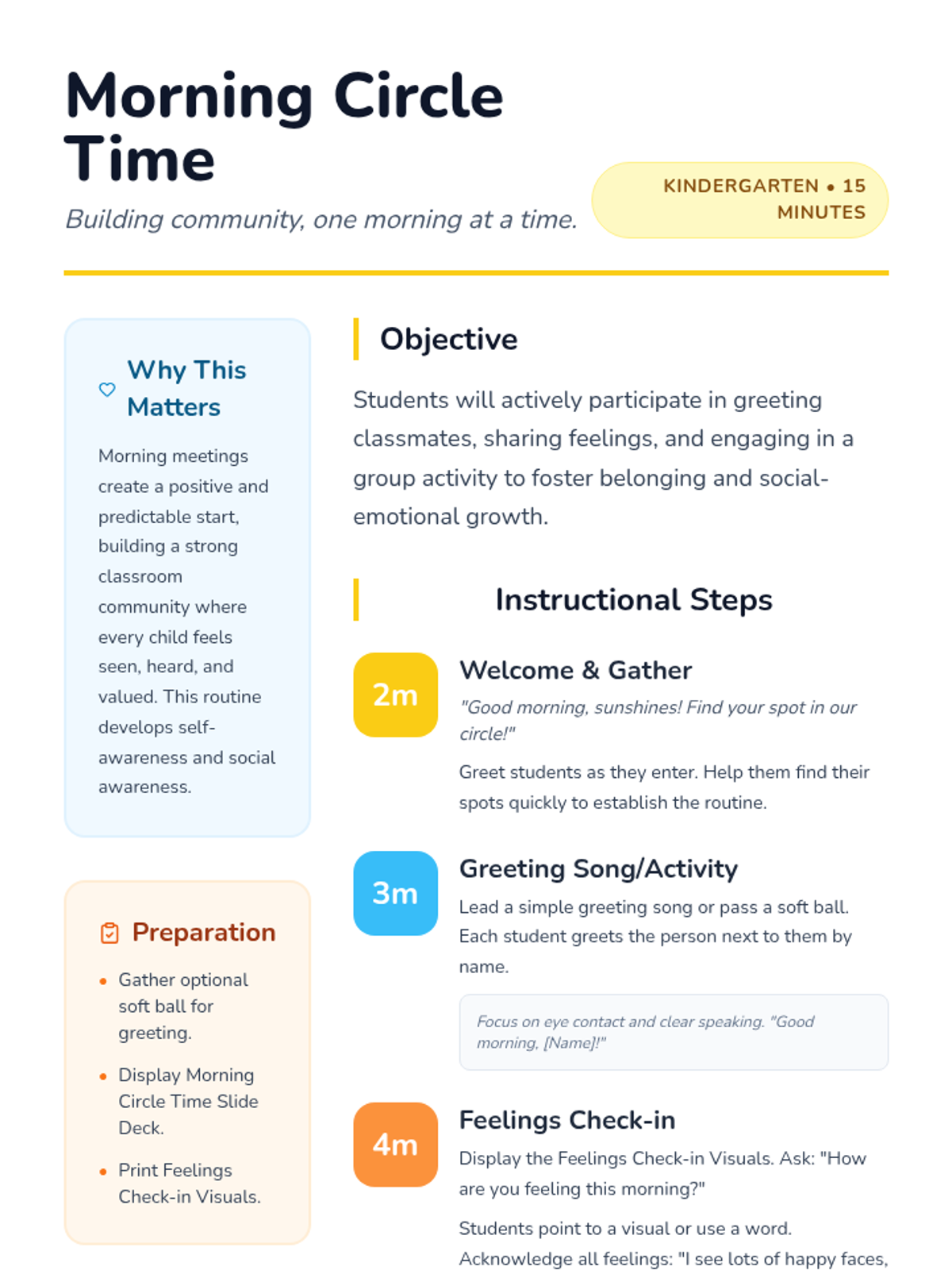 A fun and engaging 15-minute morning meeting for Kindergarteners to build community, practice social-emotional skills, and prepare for the day ahead. This routine helps students develop important social-emotional skills like self-awareness and social awareness.