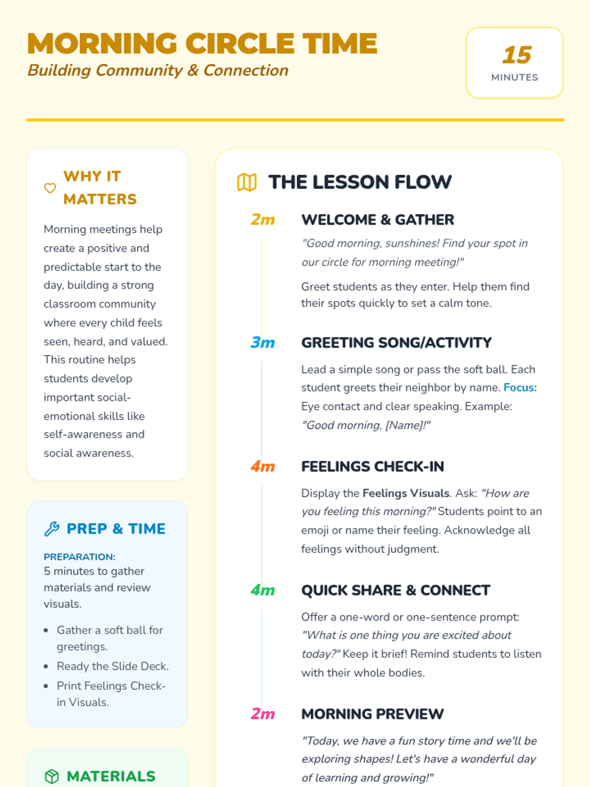 A fun and engaging 15-minute morning meeting for Kindergarteners to build community, practice social-emotional skills, and prepare for the day ahead.